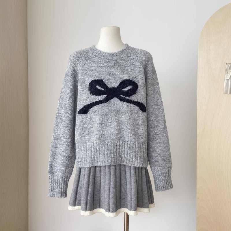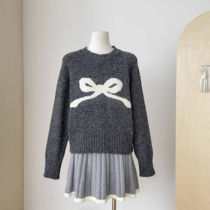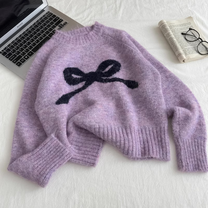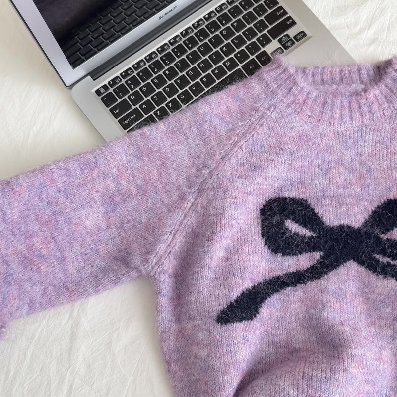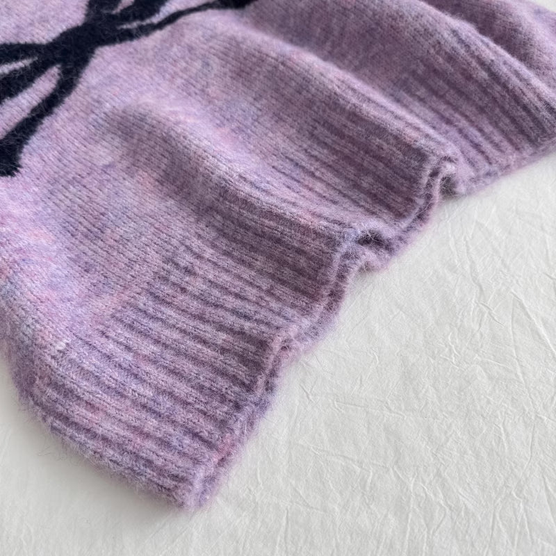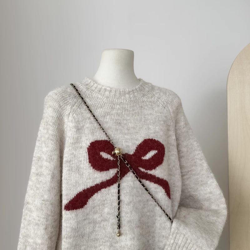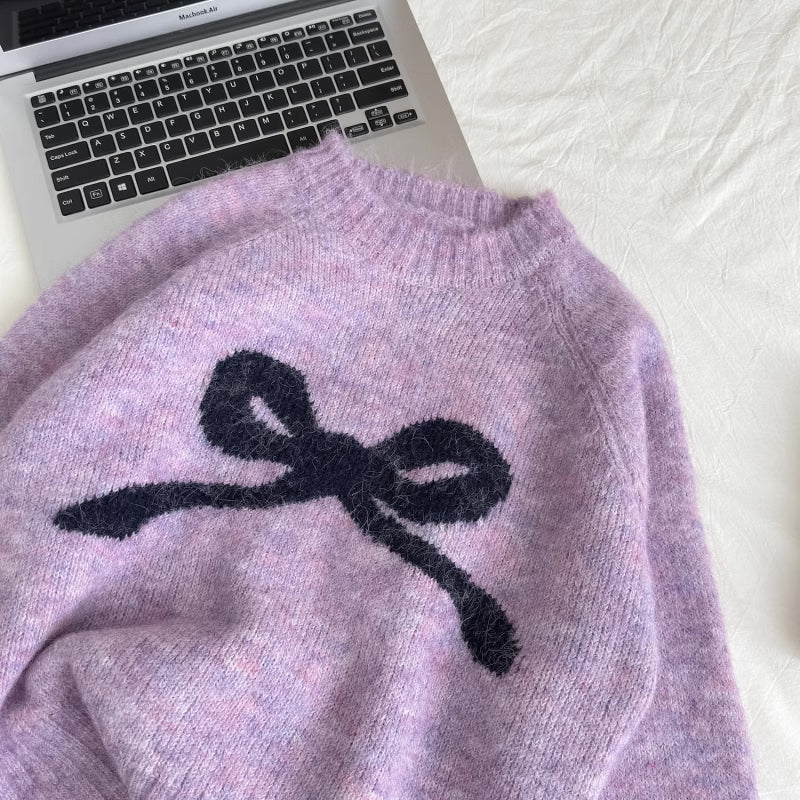 Round neck knitted sweater with a big ribbon graphic in the middle.