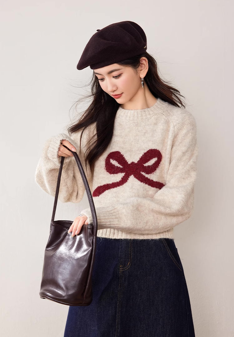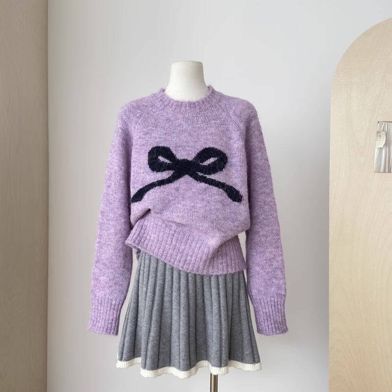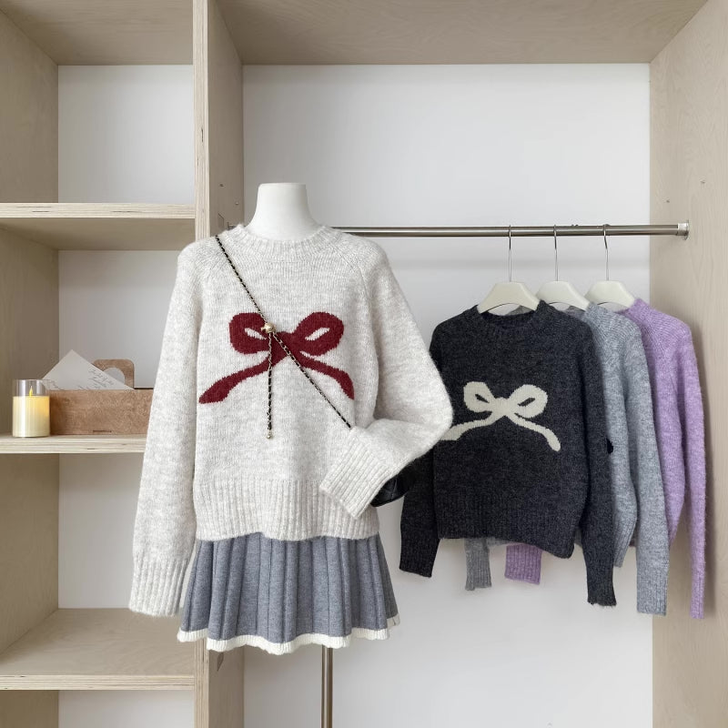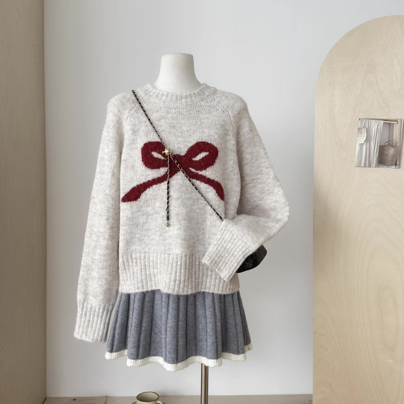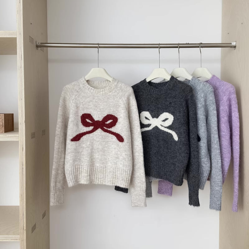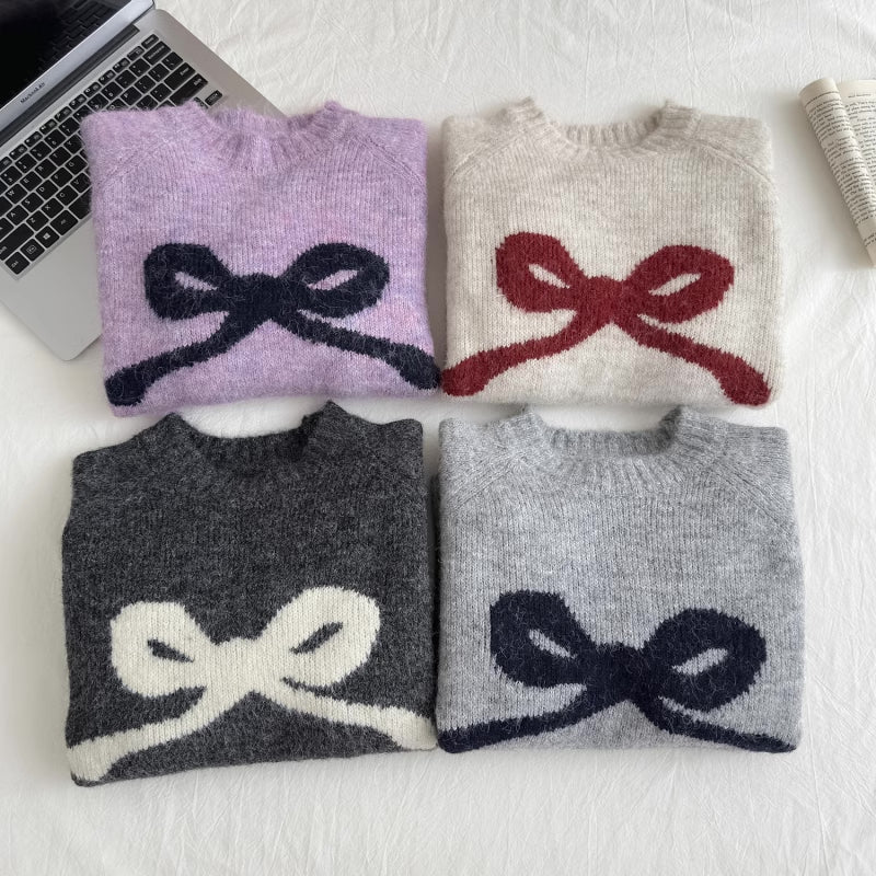 Round neck knitted sweater with a big ribbon graphic in the middle.