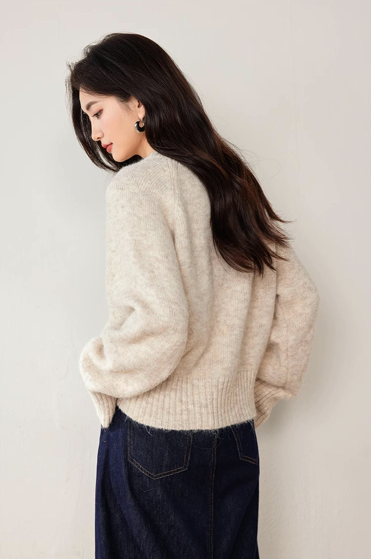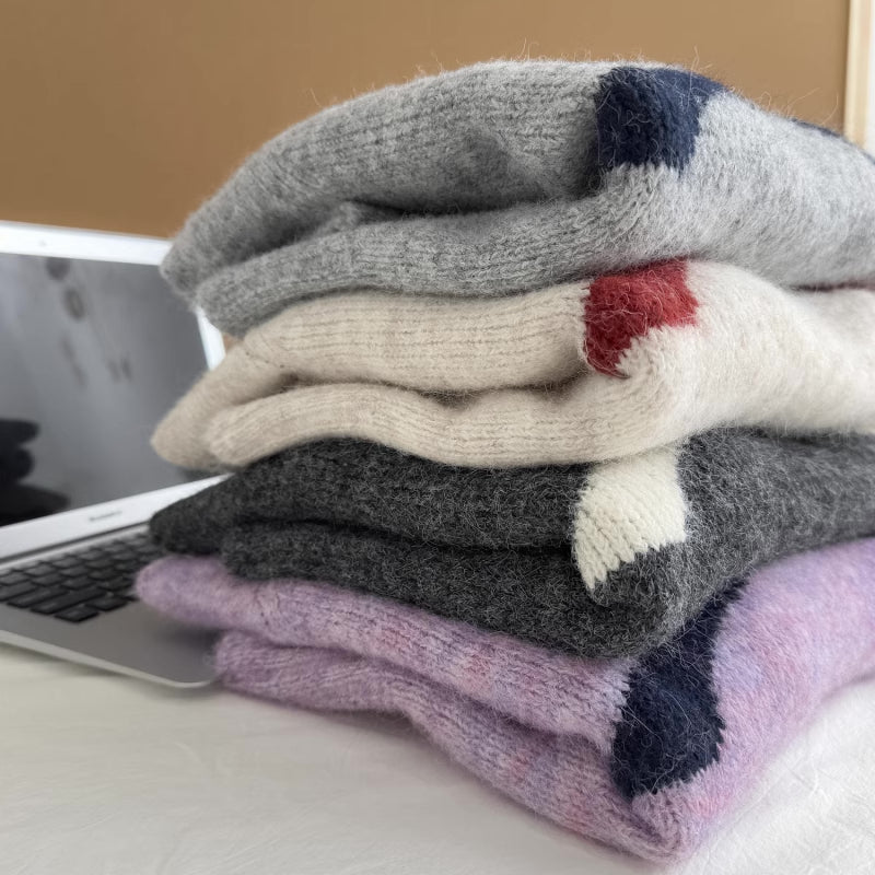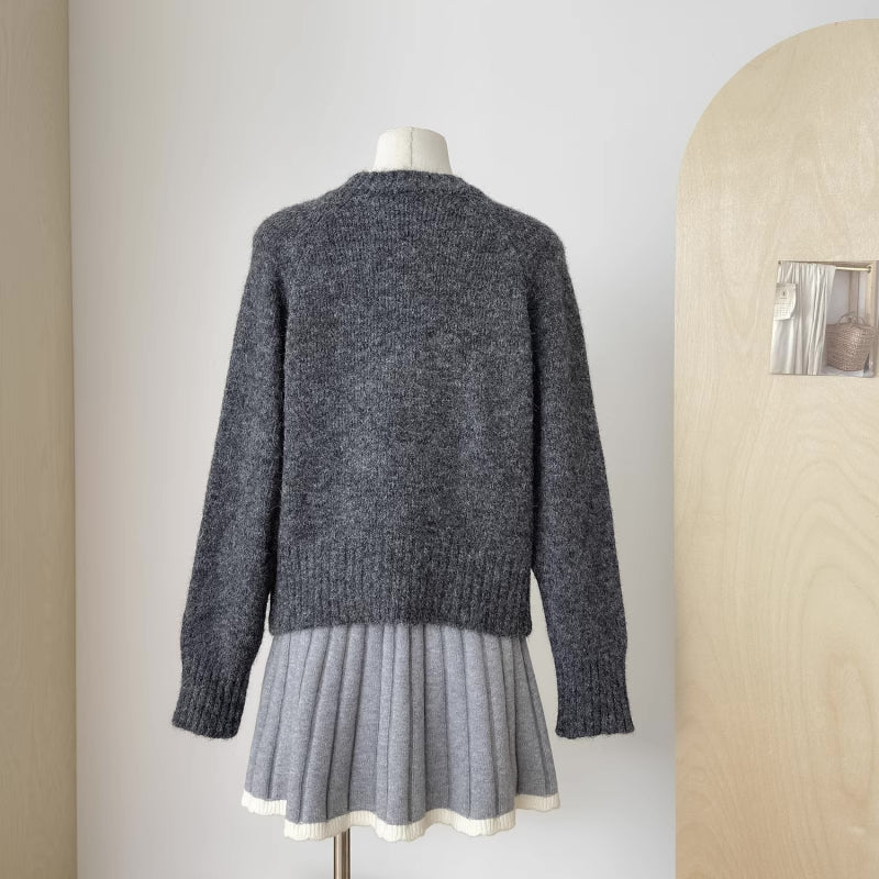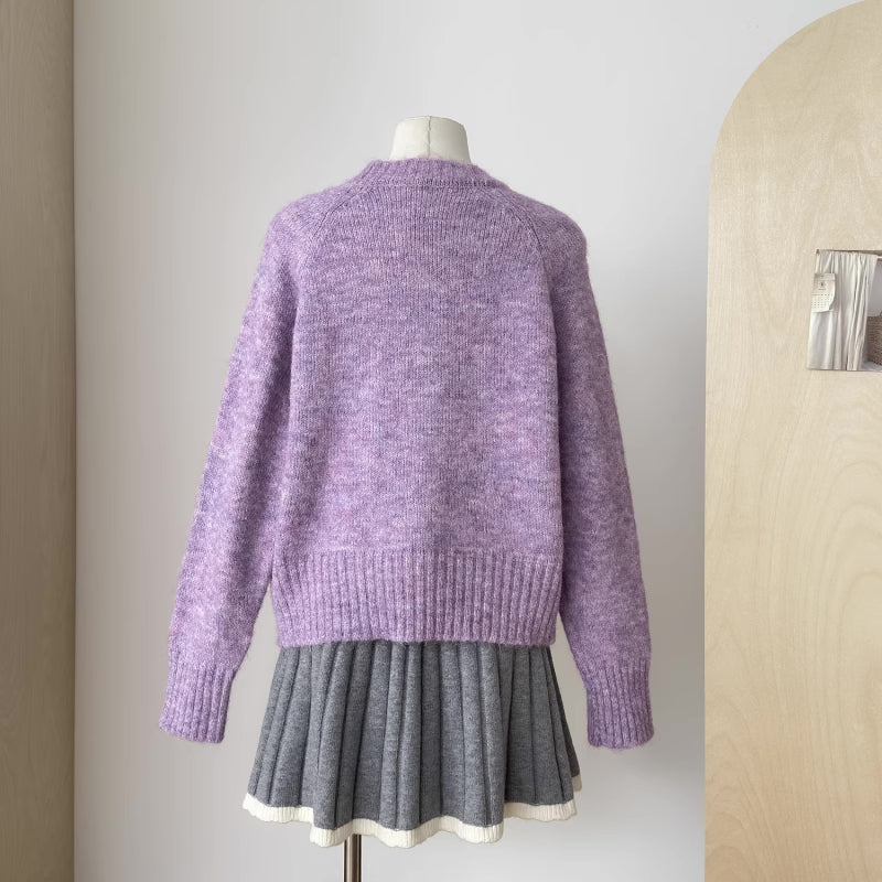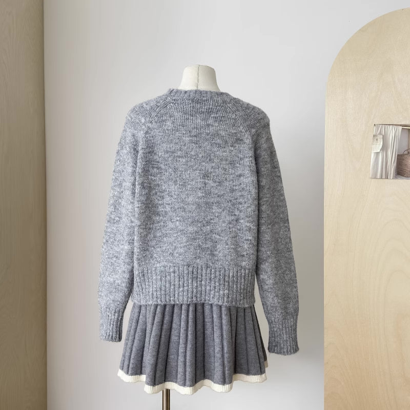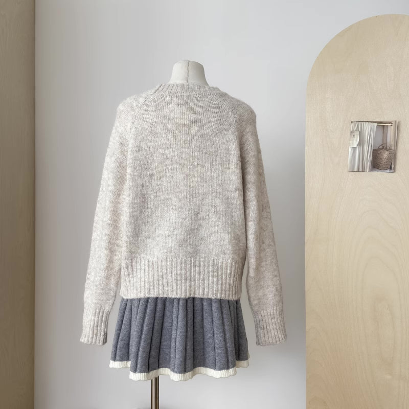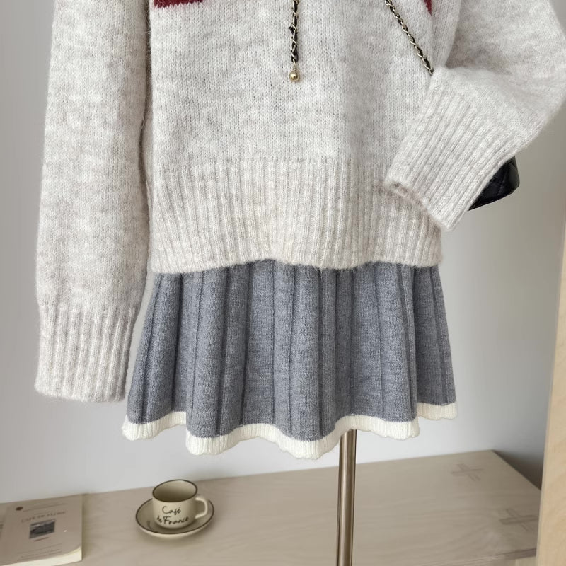 Round neck knitted sweater with a big ribbon graphic in the middle.