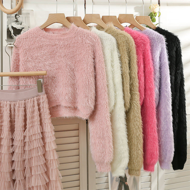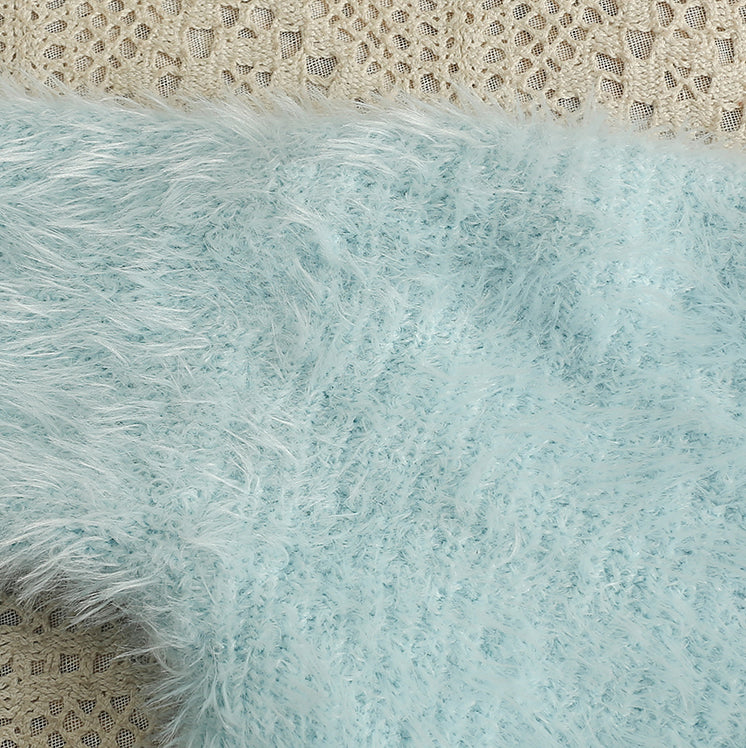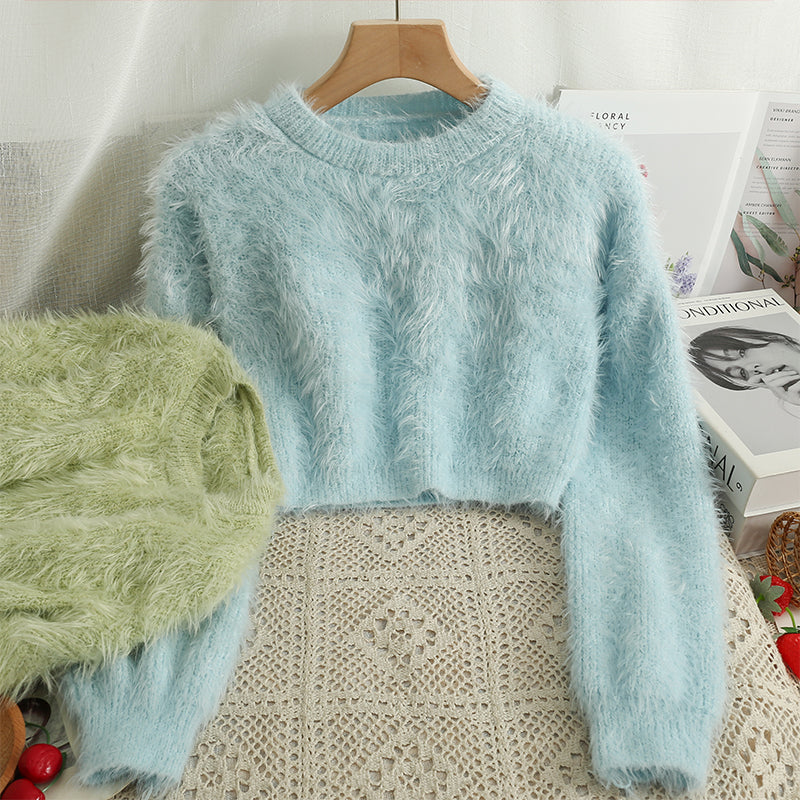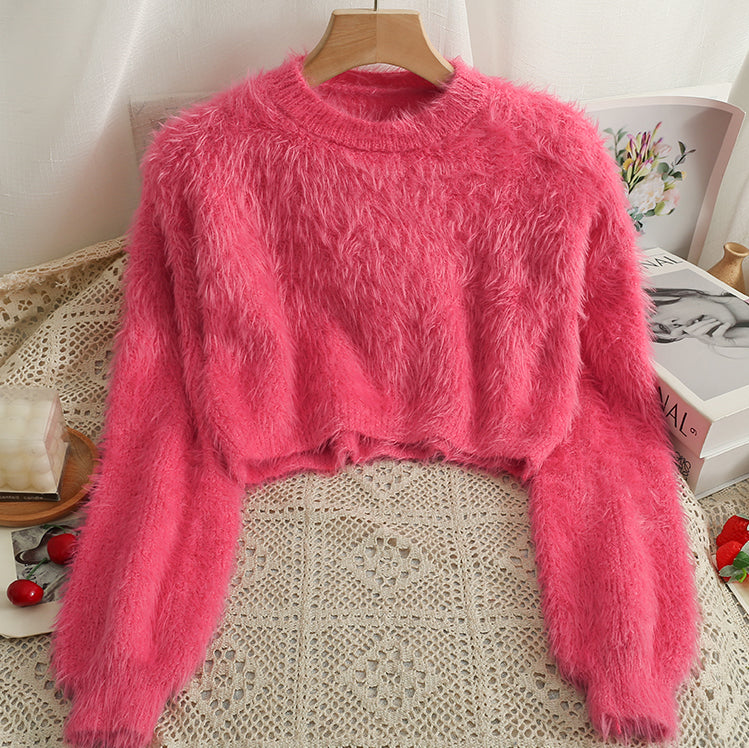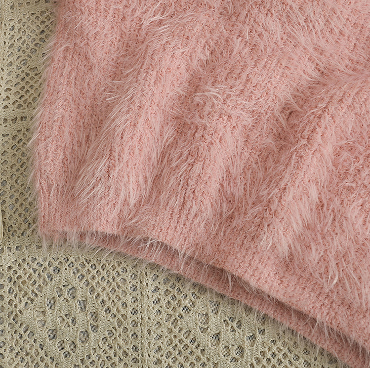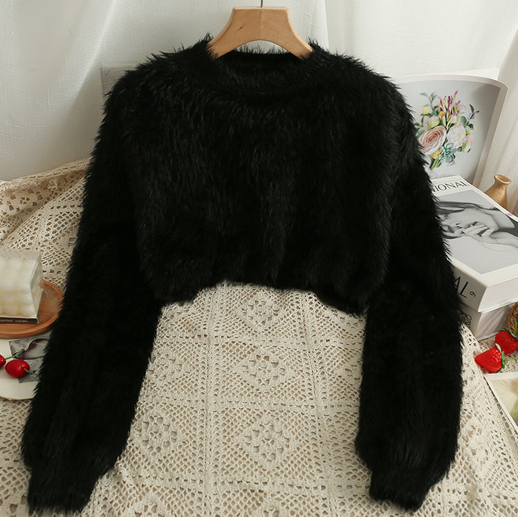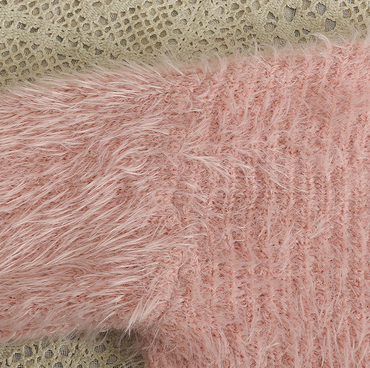 Faux mink round neck sweater with soft and fluffy fuzz all over. Keeps you warm and feeling oh so cozy!