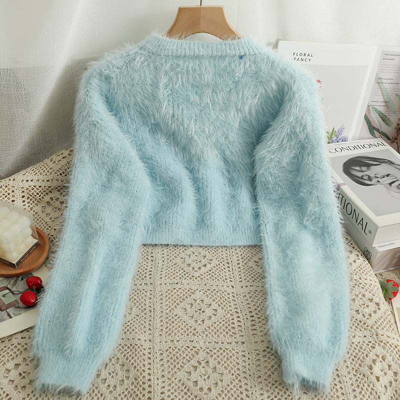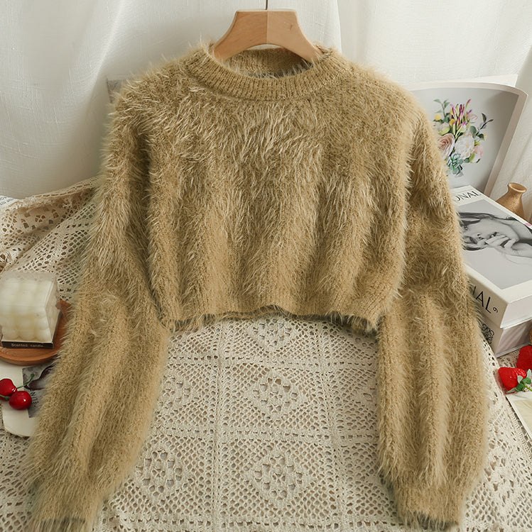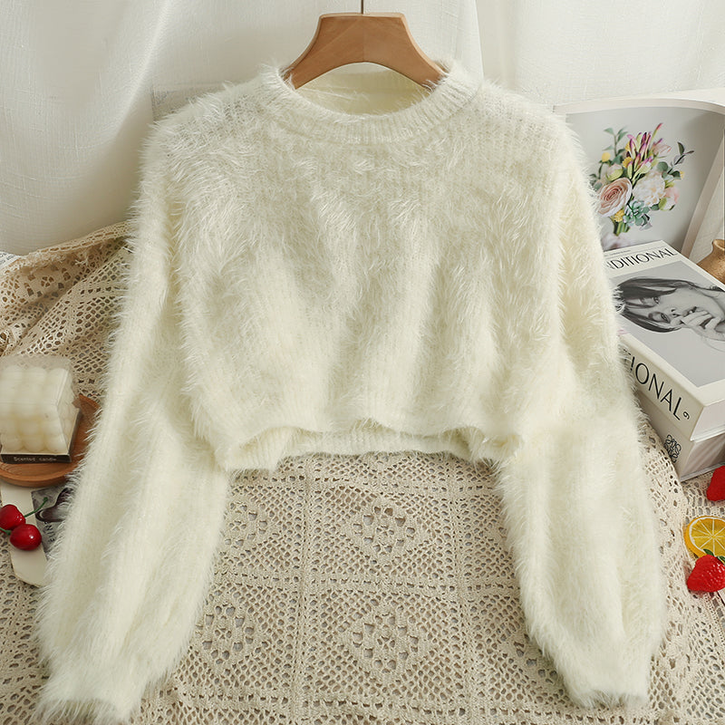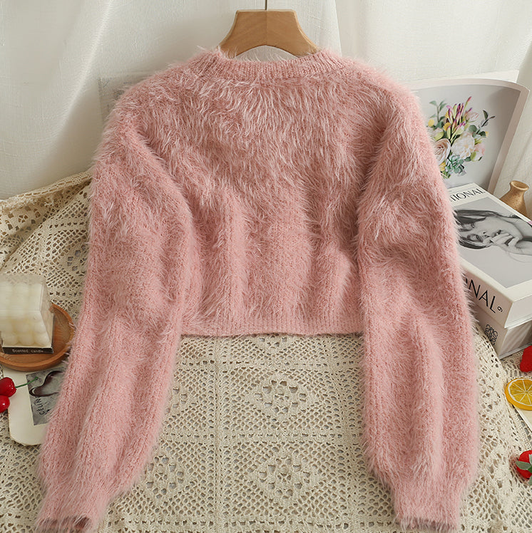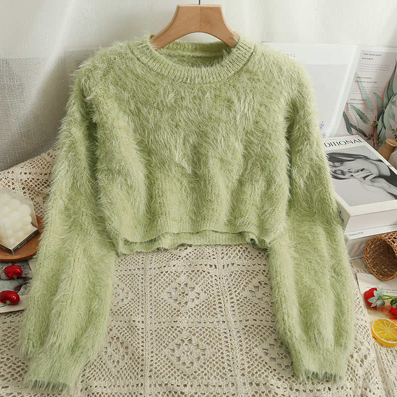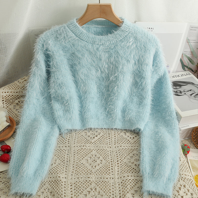 Faux mink round neck sweater with soft and fluffy fuzz all over. Keeps you warm and feeling oh so cozy!