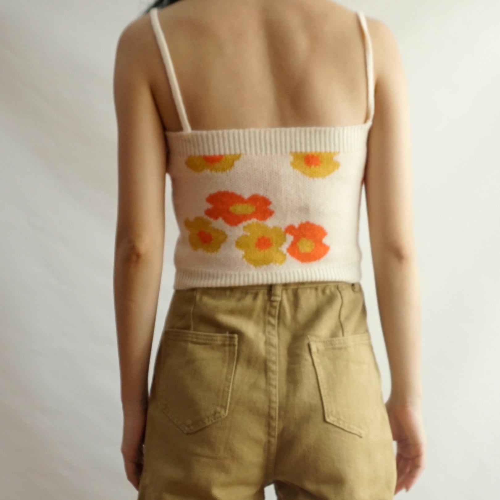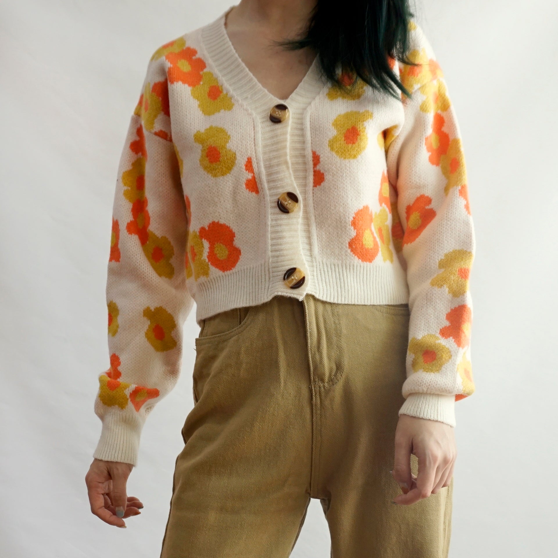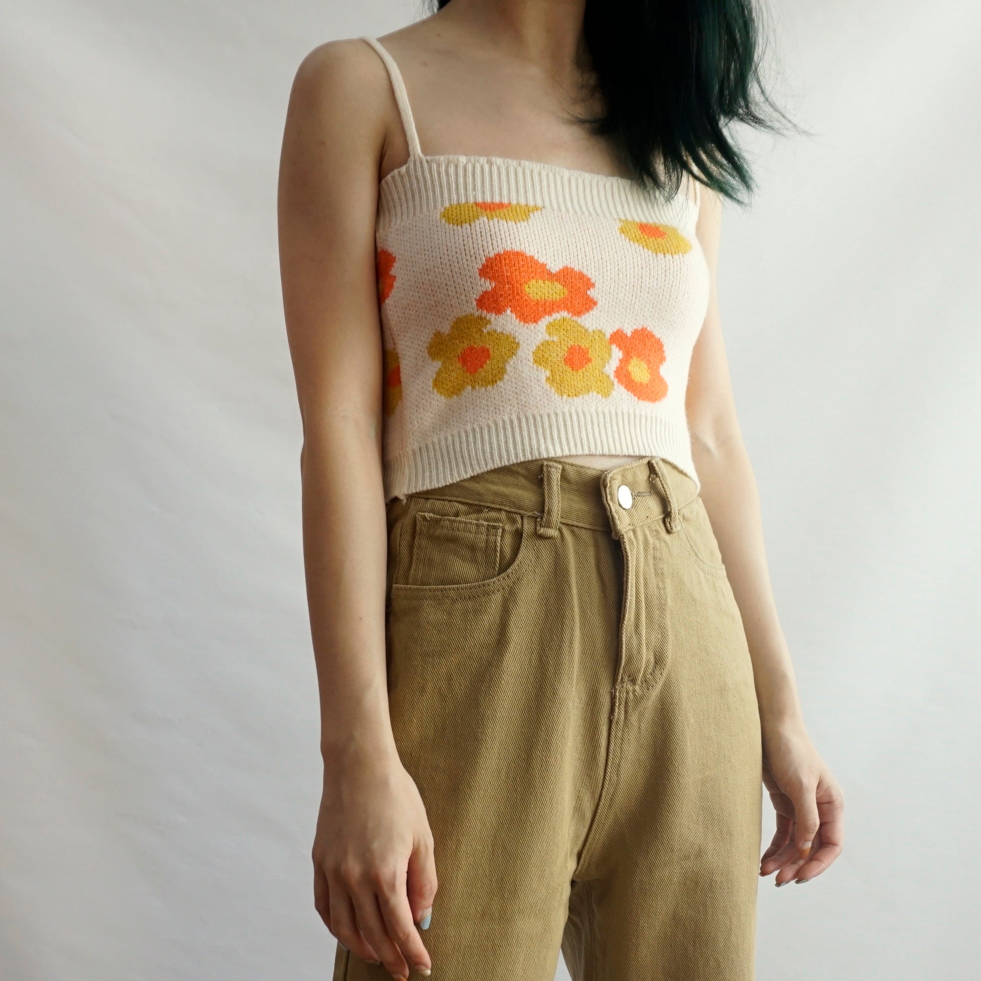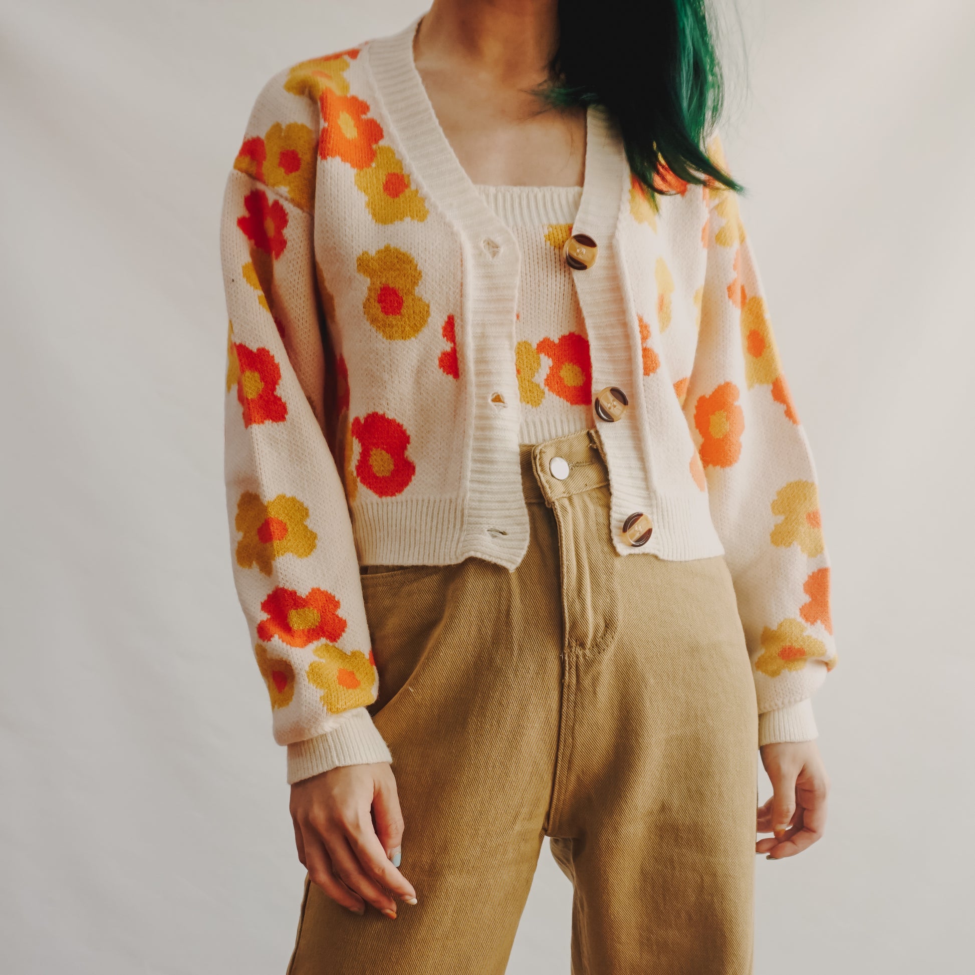 Mix and match cropped cami and cardigan set featuring orange and yellow daisies. Sold together as a set.