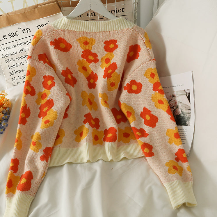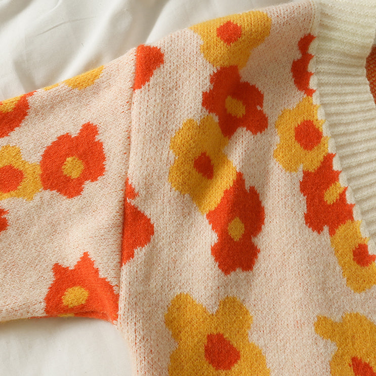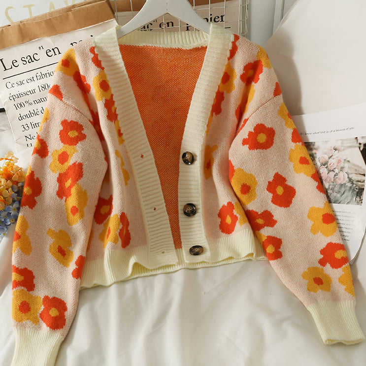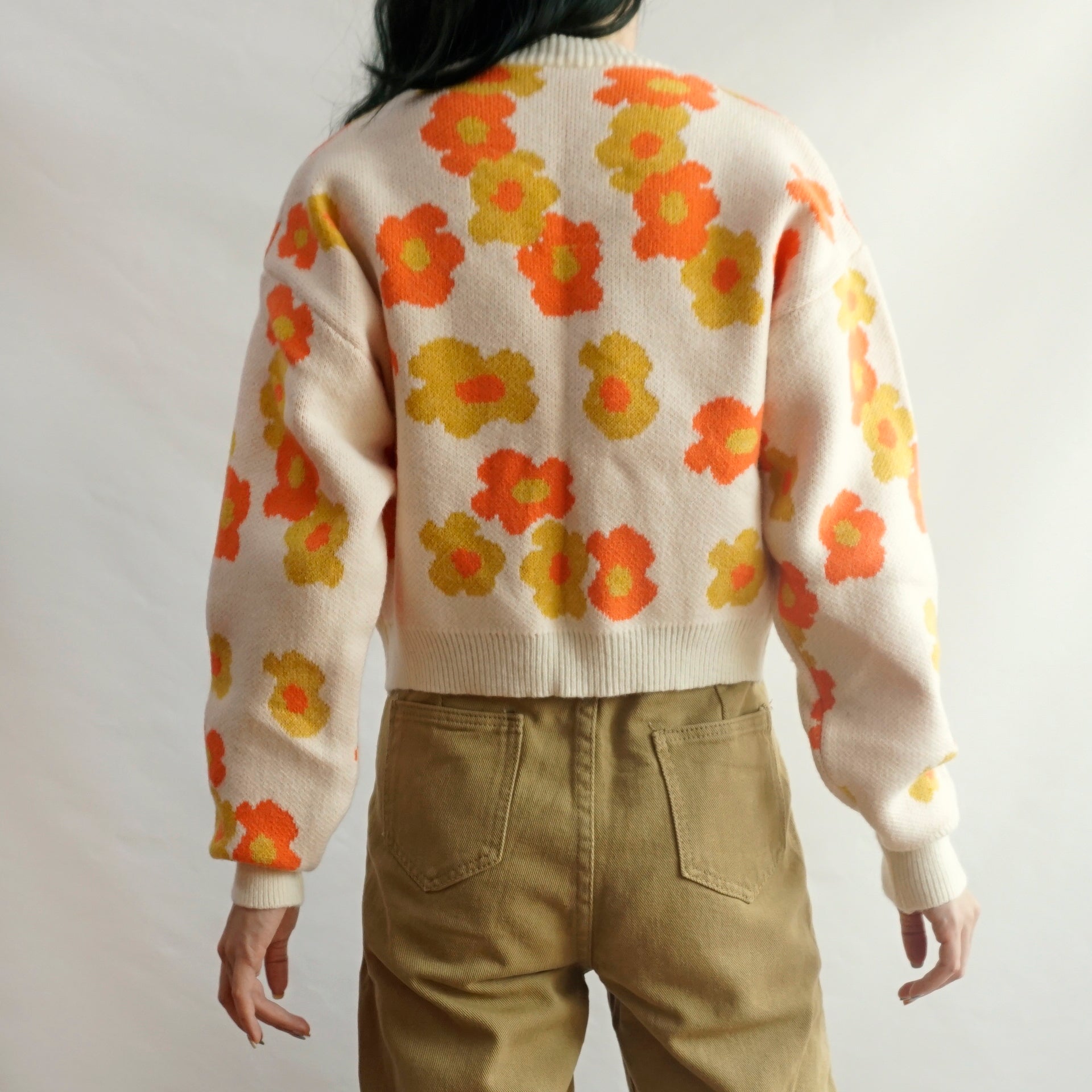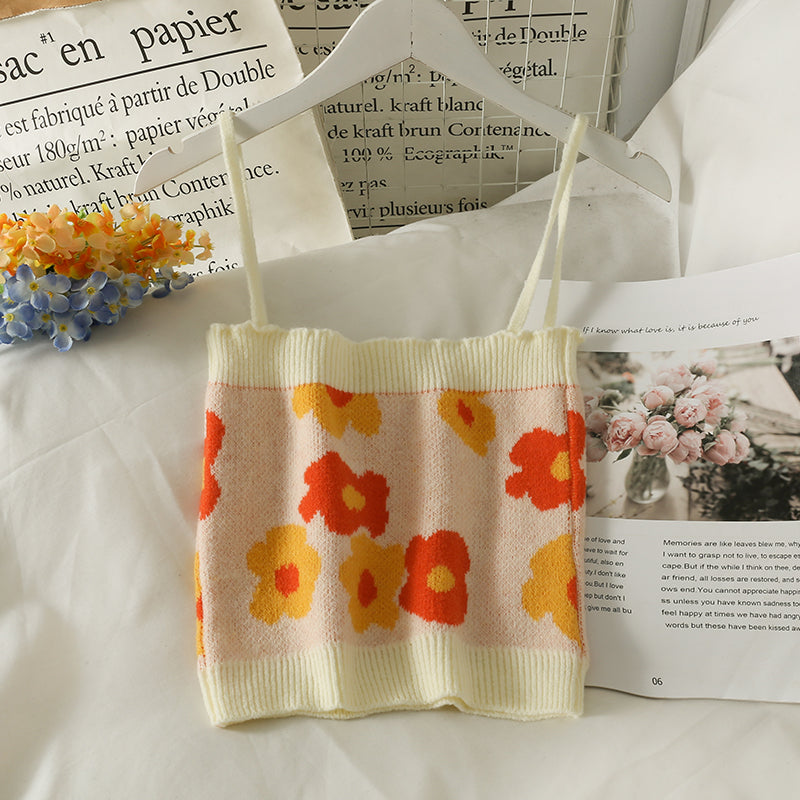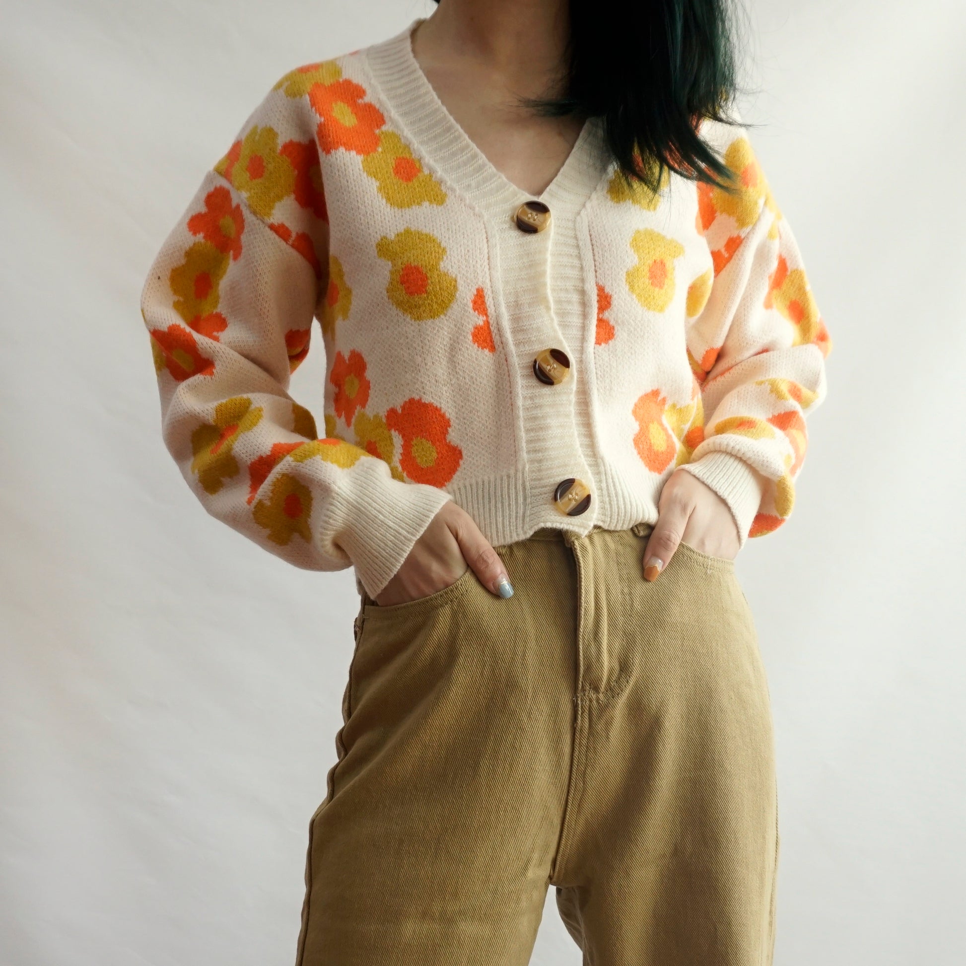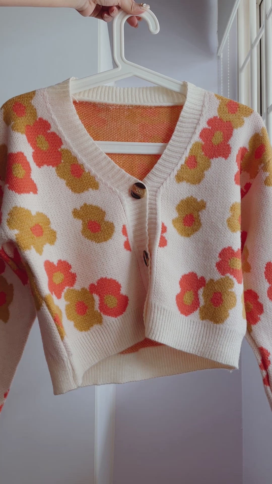 Mix and match cropped cami and cardigan set featuring orange and yellow daisies. Sold together as a set.