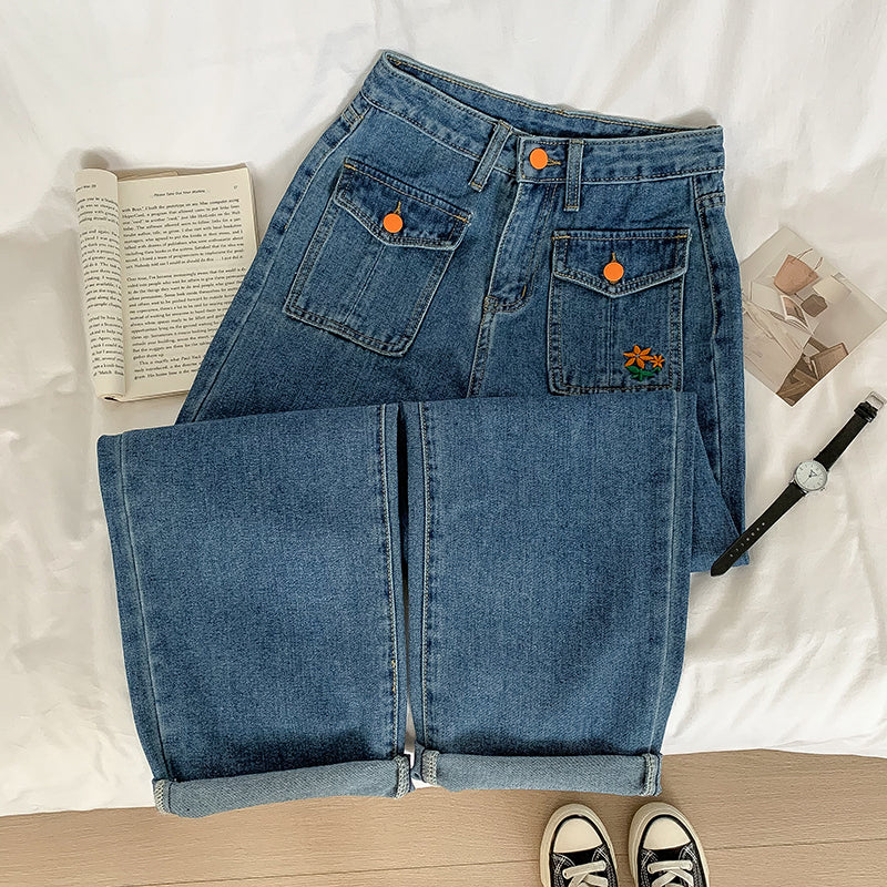 Vintage inspired denim jeans with buttoned pockets on the front, cute floral embroidery, high waisted fit and relaxed straight legs. Button and zip up closure with belt loops and back pockets.