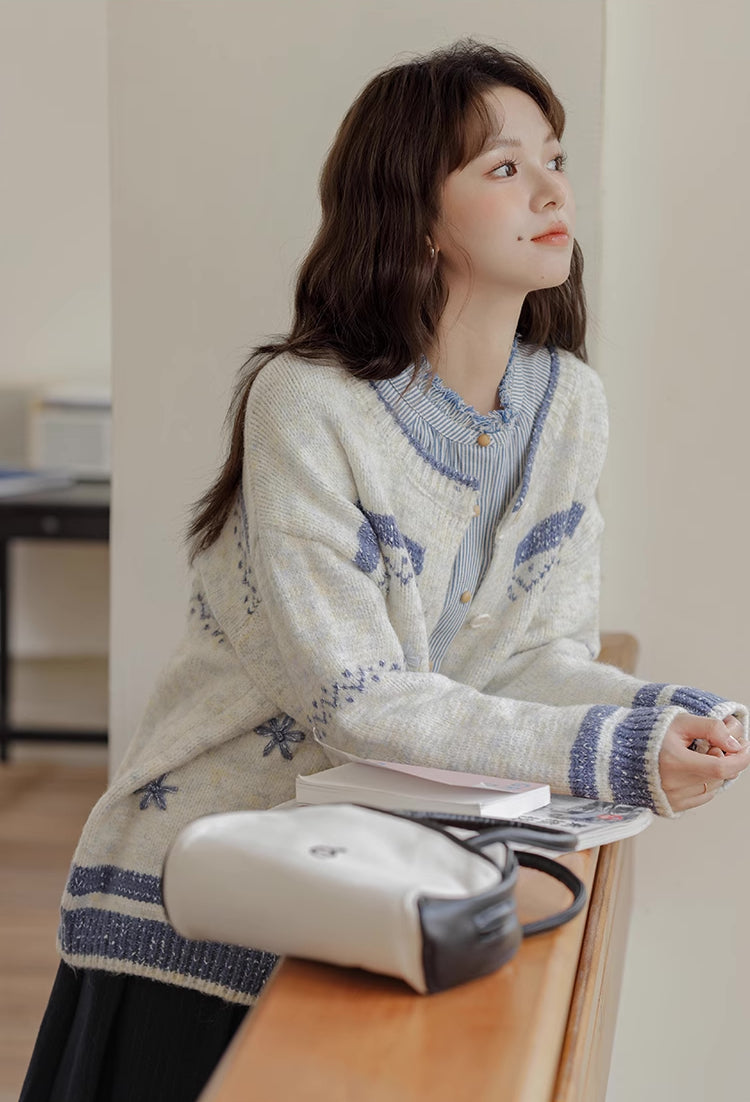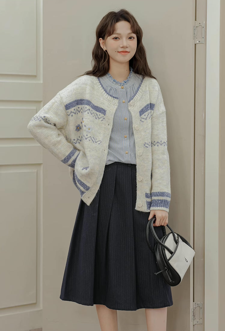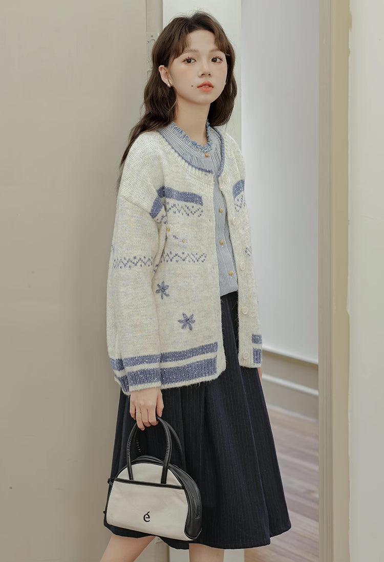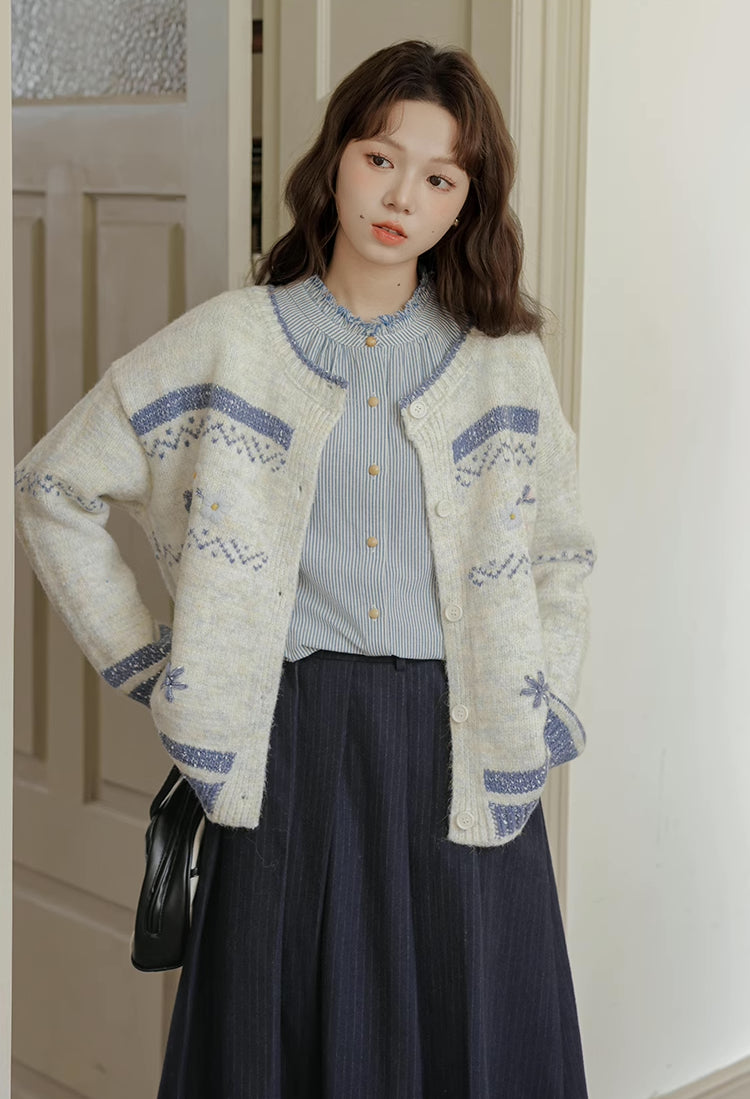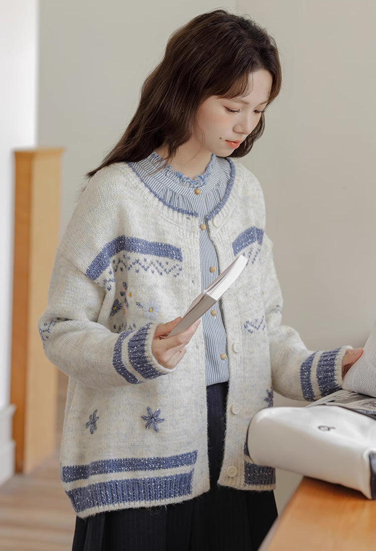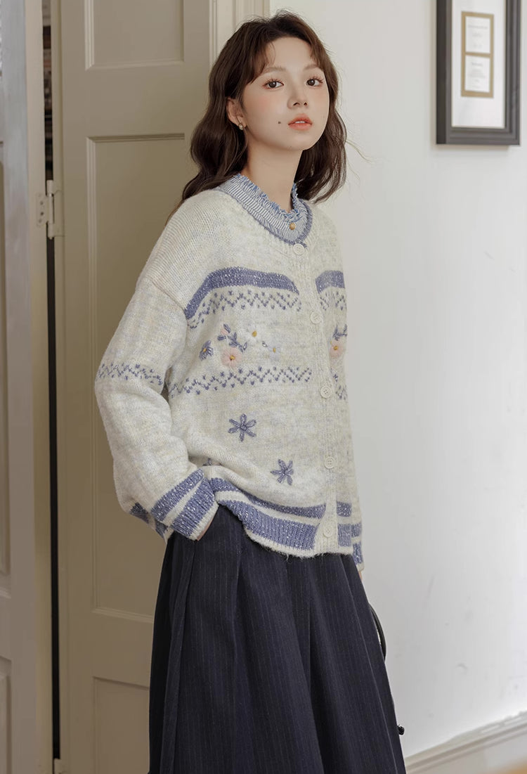 Embroidered Floral Fair Isle Cardigan (Off-White)