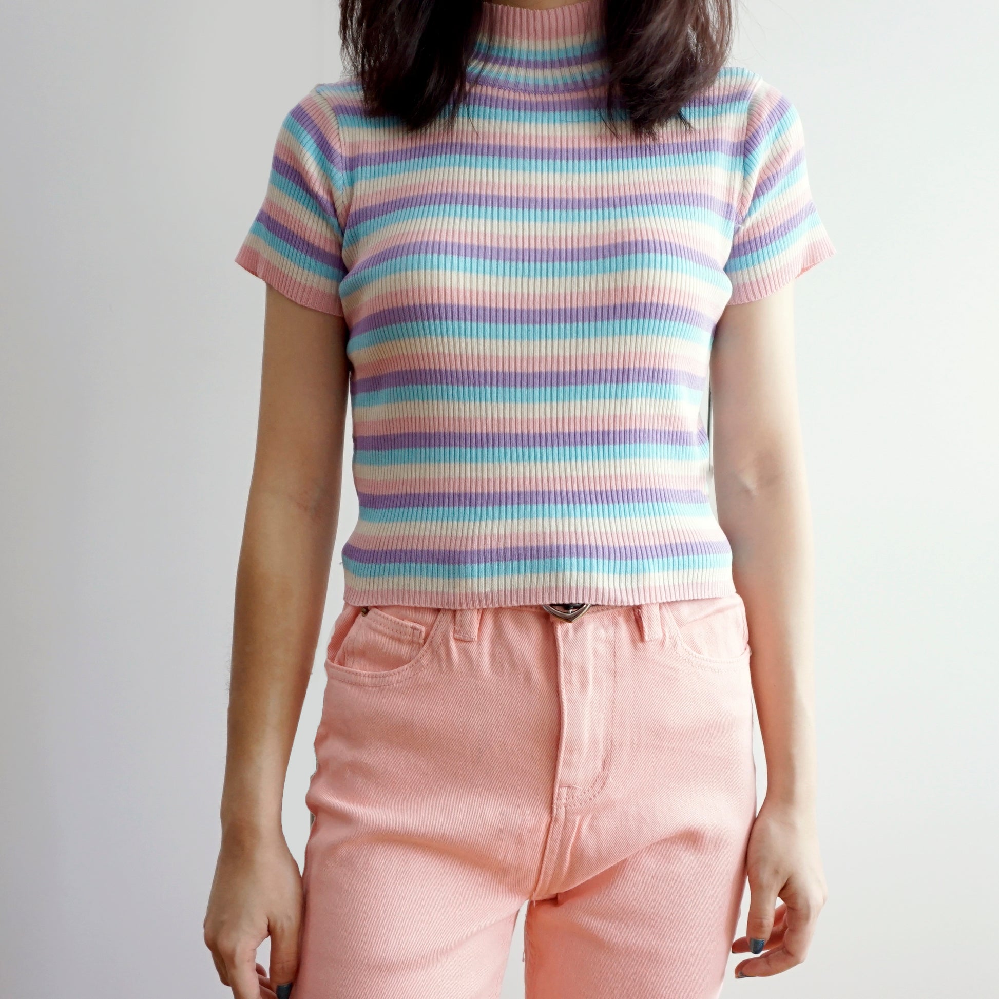 Short sleeved mock neck ribbed knit shirt with pastel rainbow stripes.