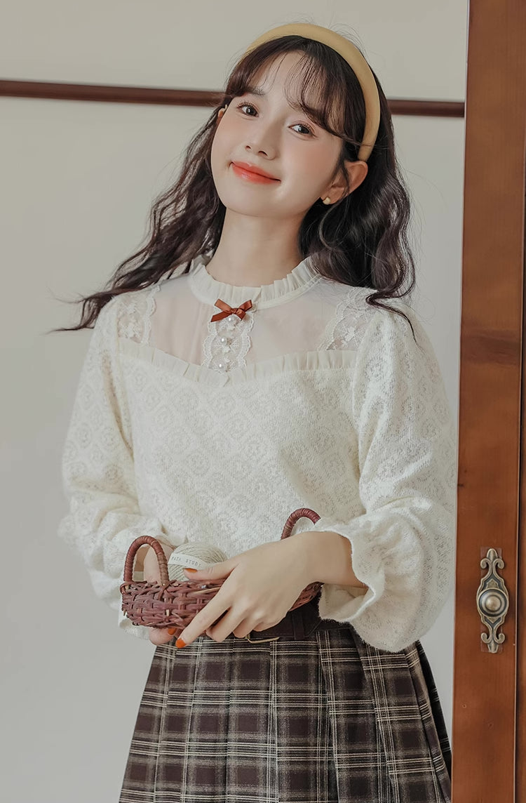 Sheer lace and chiffon layering shirt with a frilly mock neck, sweet little neck ribbon with pearl beads, sweetheart outline and frilly cuffs. Perfect for layering under pinafores or sweaters with the frills peaking out. Button loop closure.