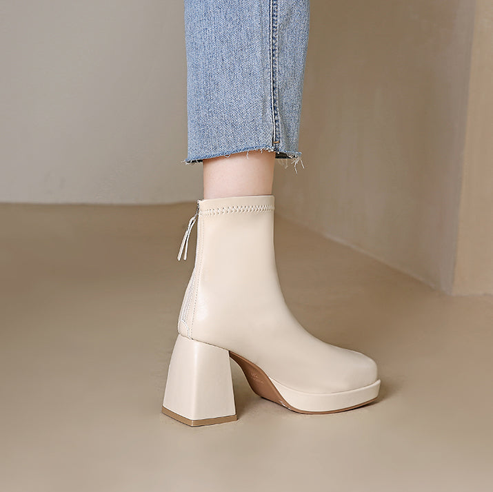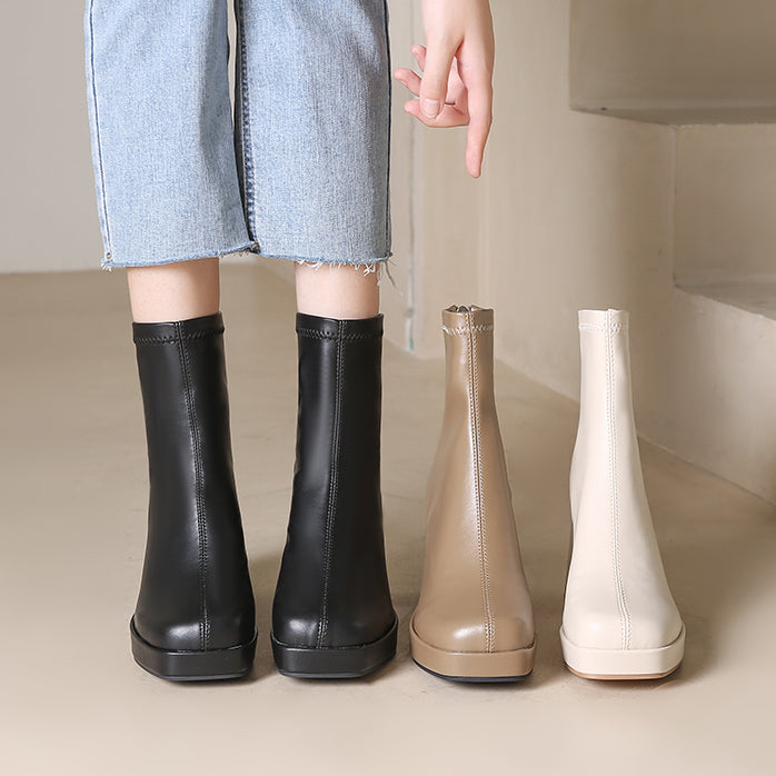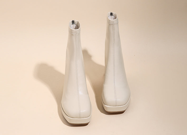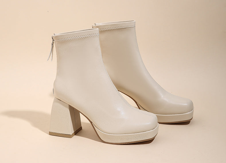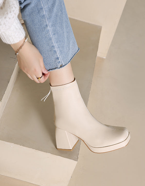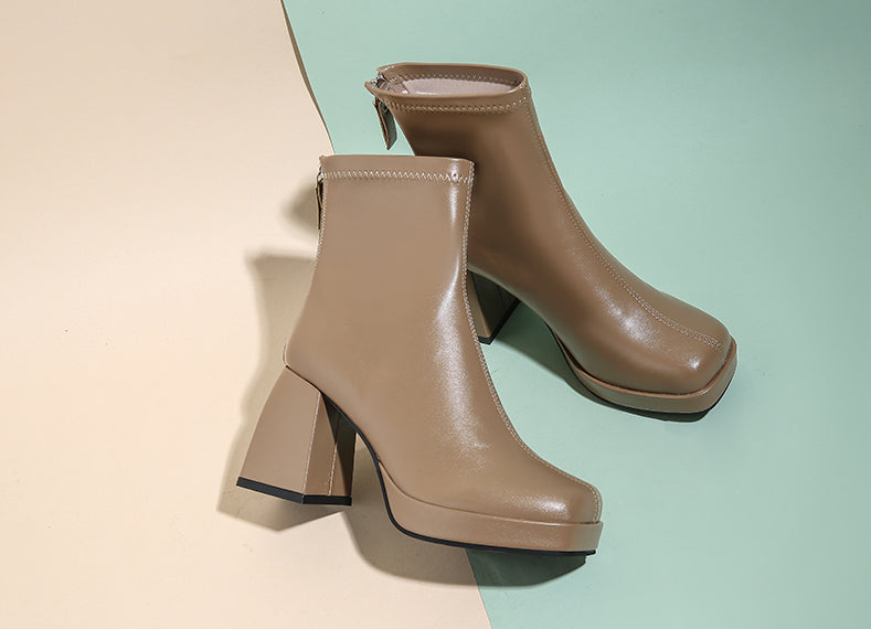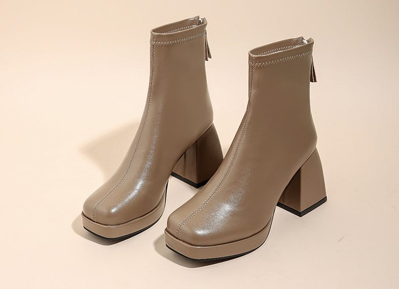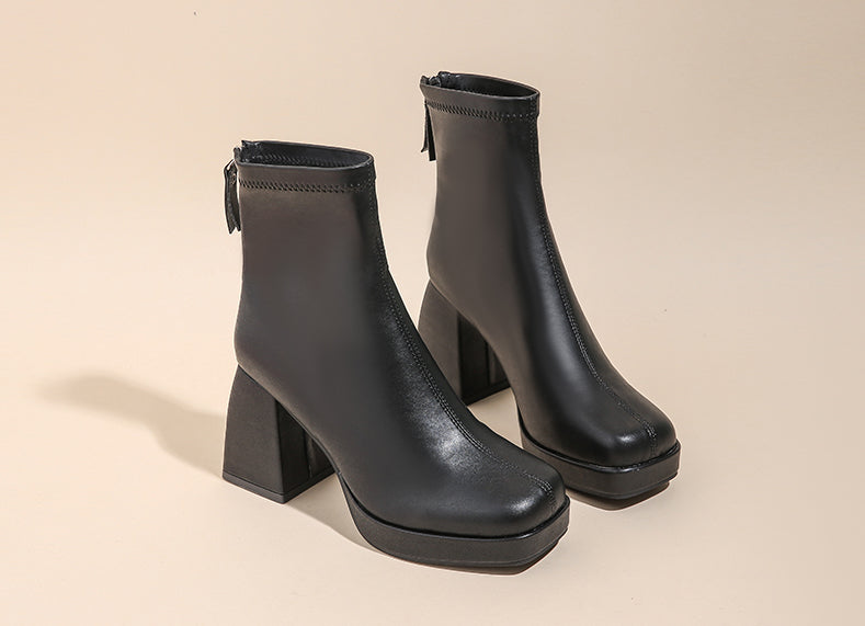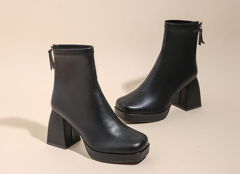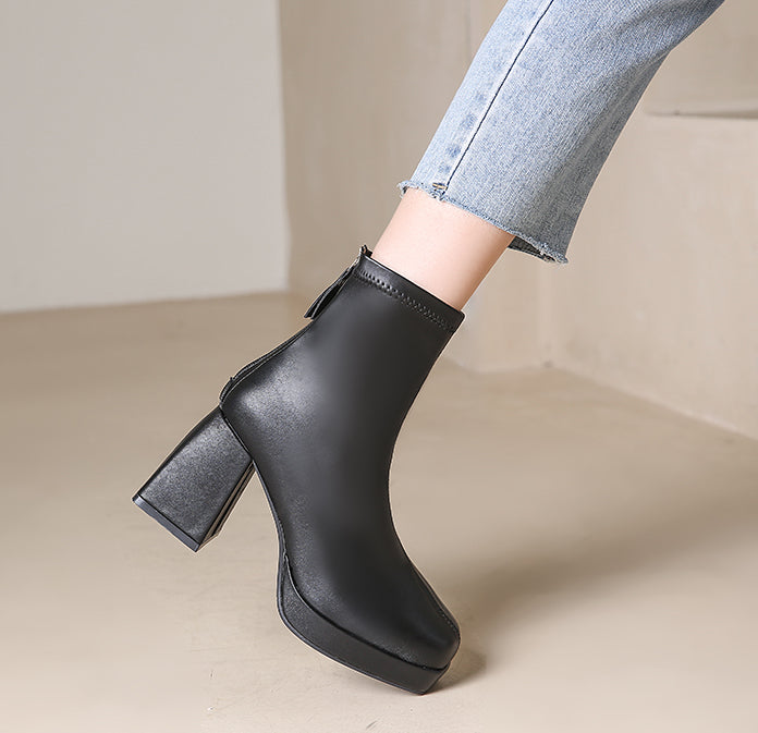 Soft and flexible PU faux leather high ankle boots with a square toe front, back zipper and chunky block heel.