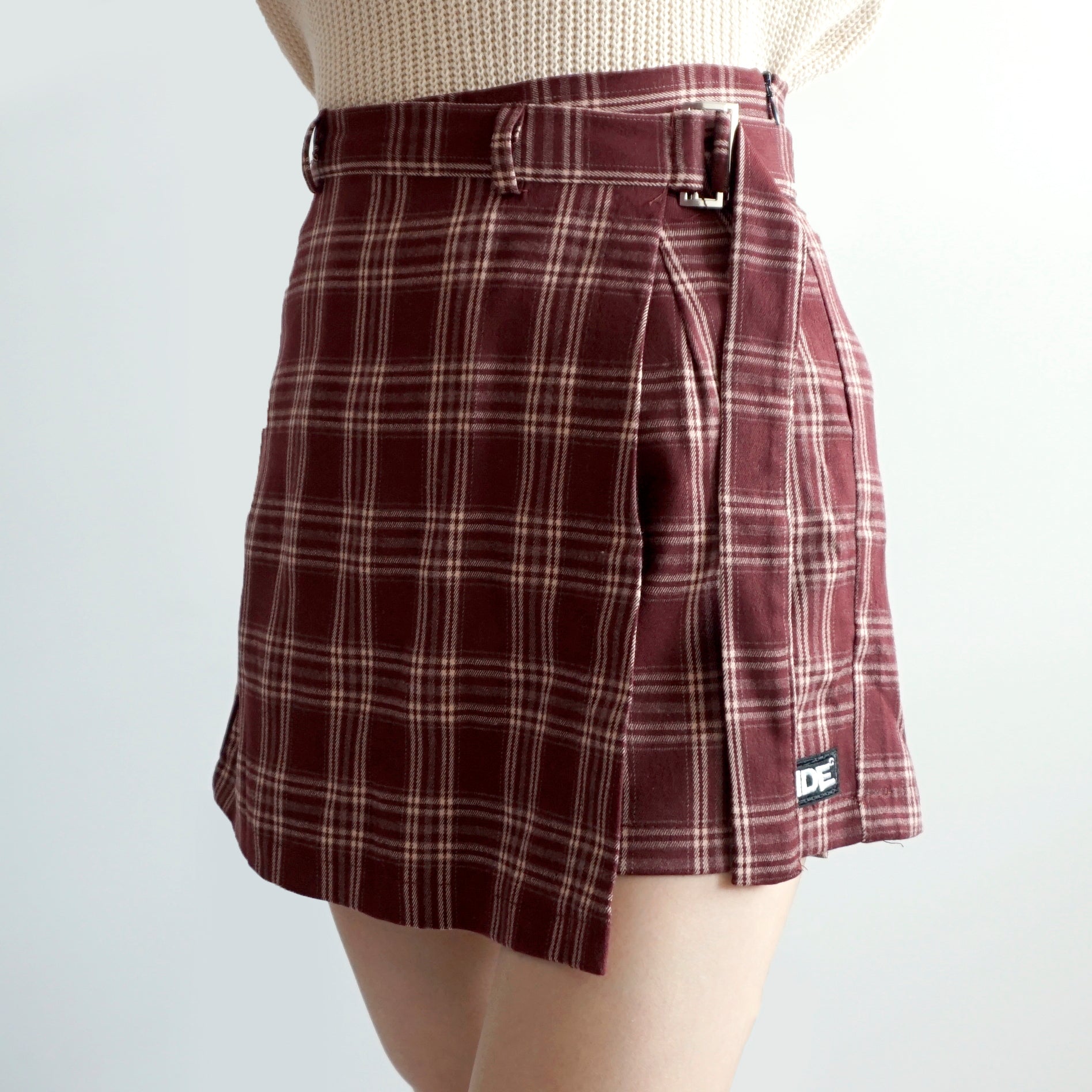 Plaid shorts with a belted skirt overlay and concealed side zipper.