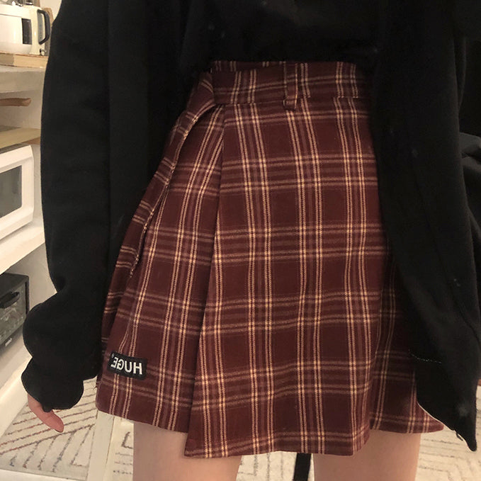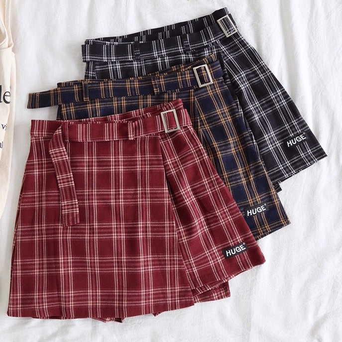 Belted Asymmetrical Plaid Skirt (3 Colors)