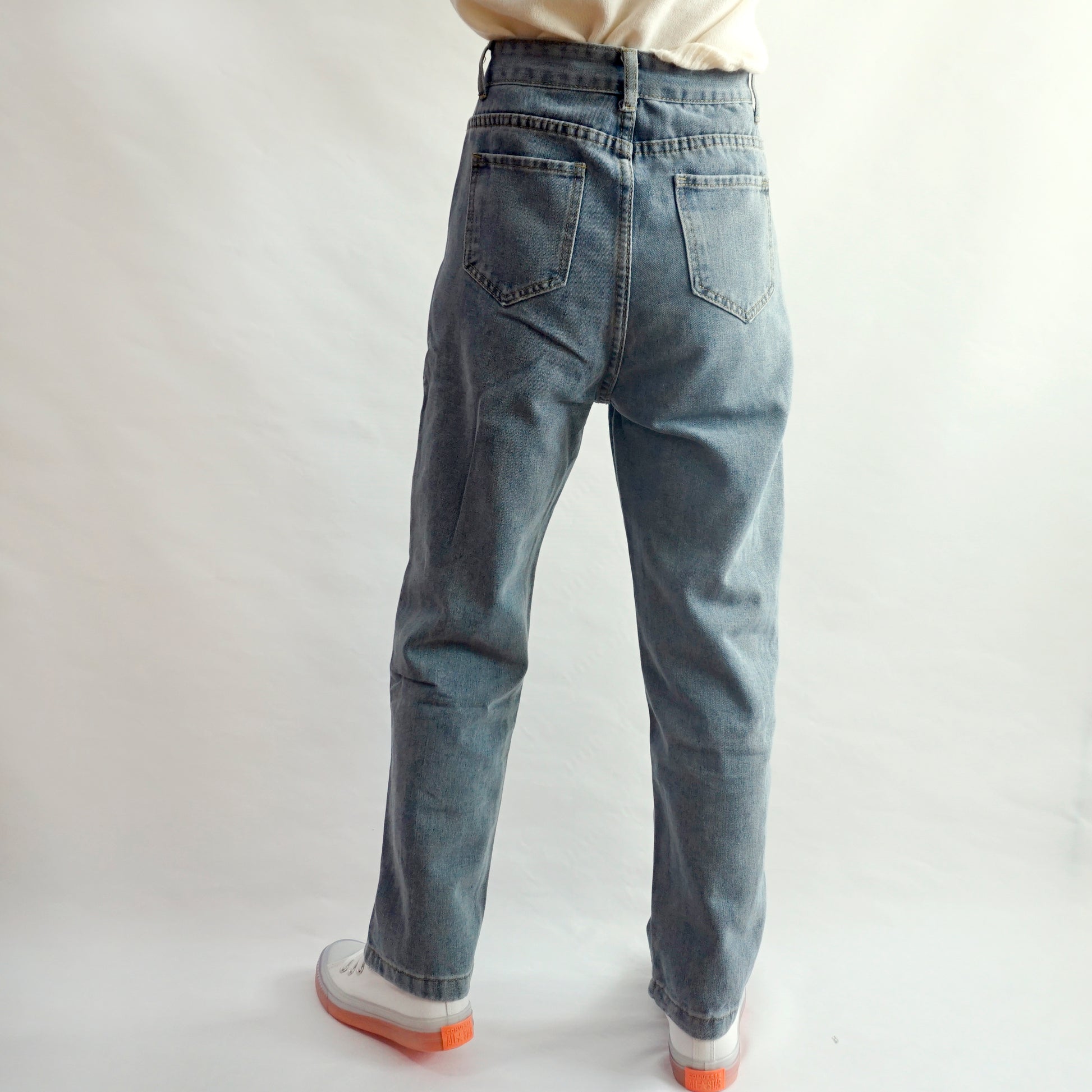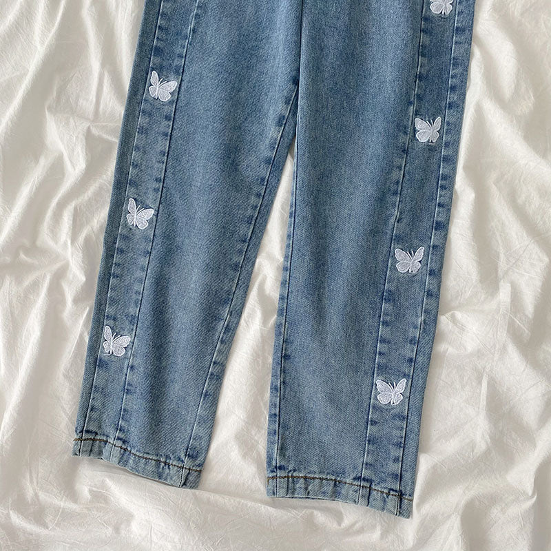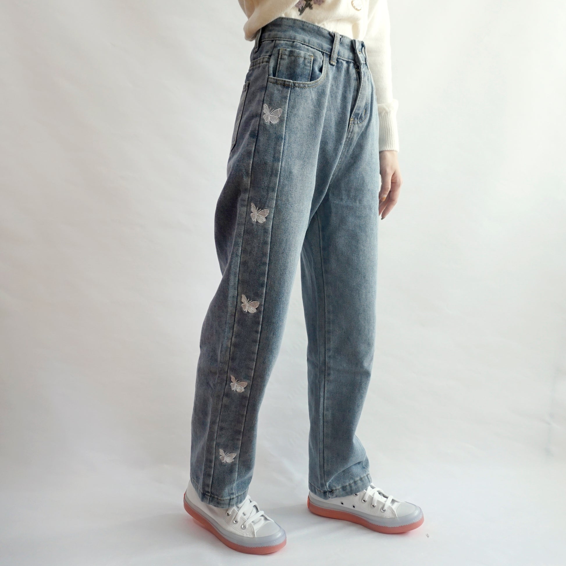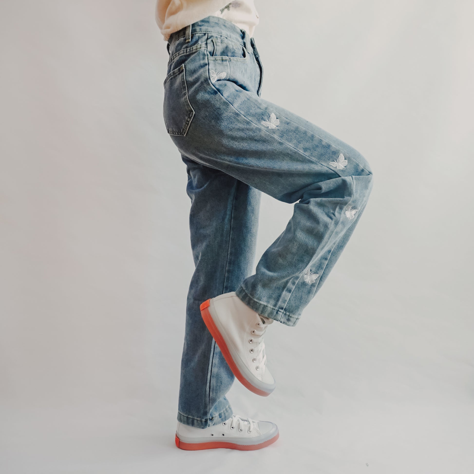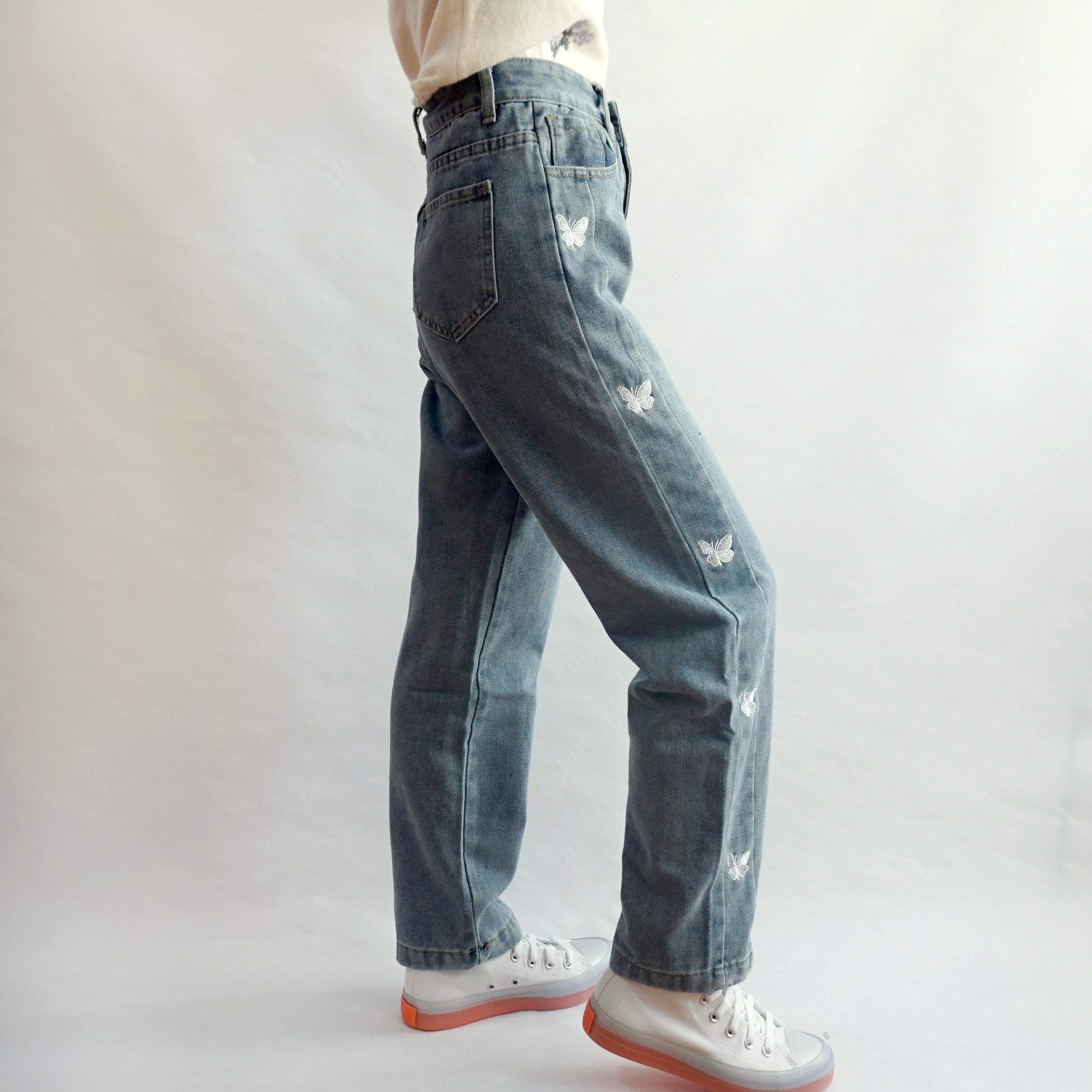 High rise mom jeans with tapered legs and embroidered butterflies down the sides. Button and zip up front with belt loops, side pockets and back pockets. Cut open button hole with scissors.