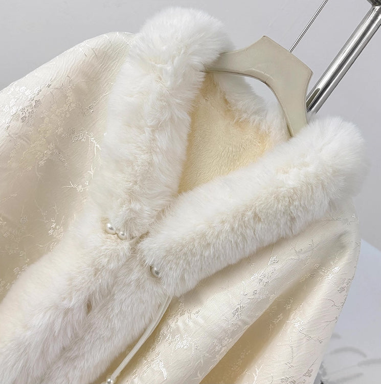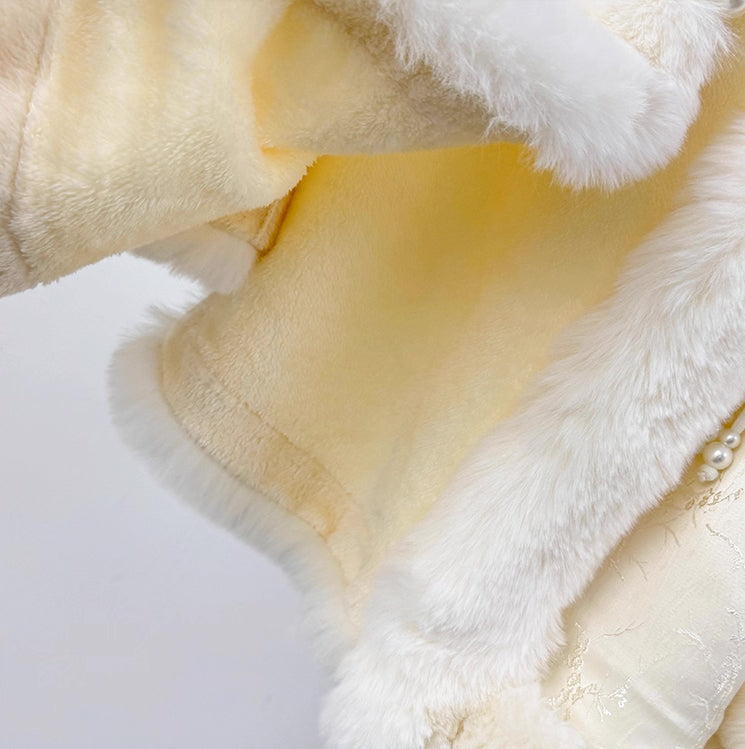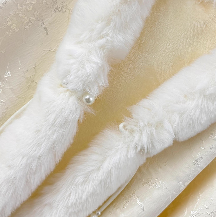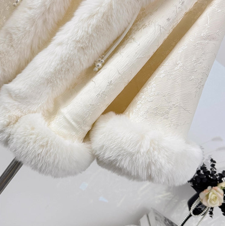 Fleece lined capelet with a jacquard cherry blossom fabric carrying a bit of sheen, fluffy faux fur hem lines and a pearl button loop closure.