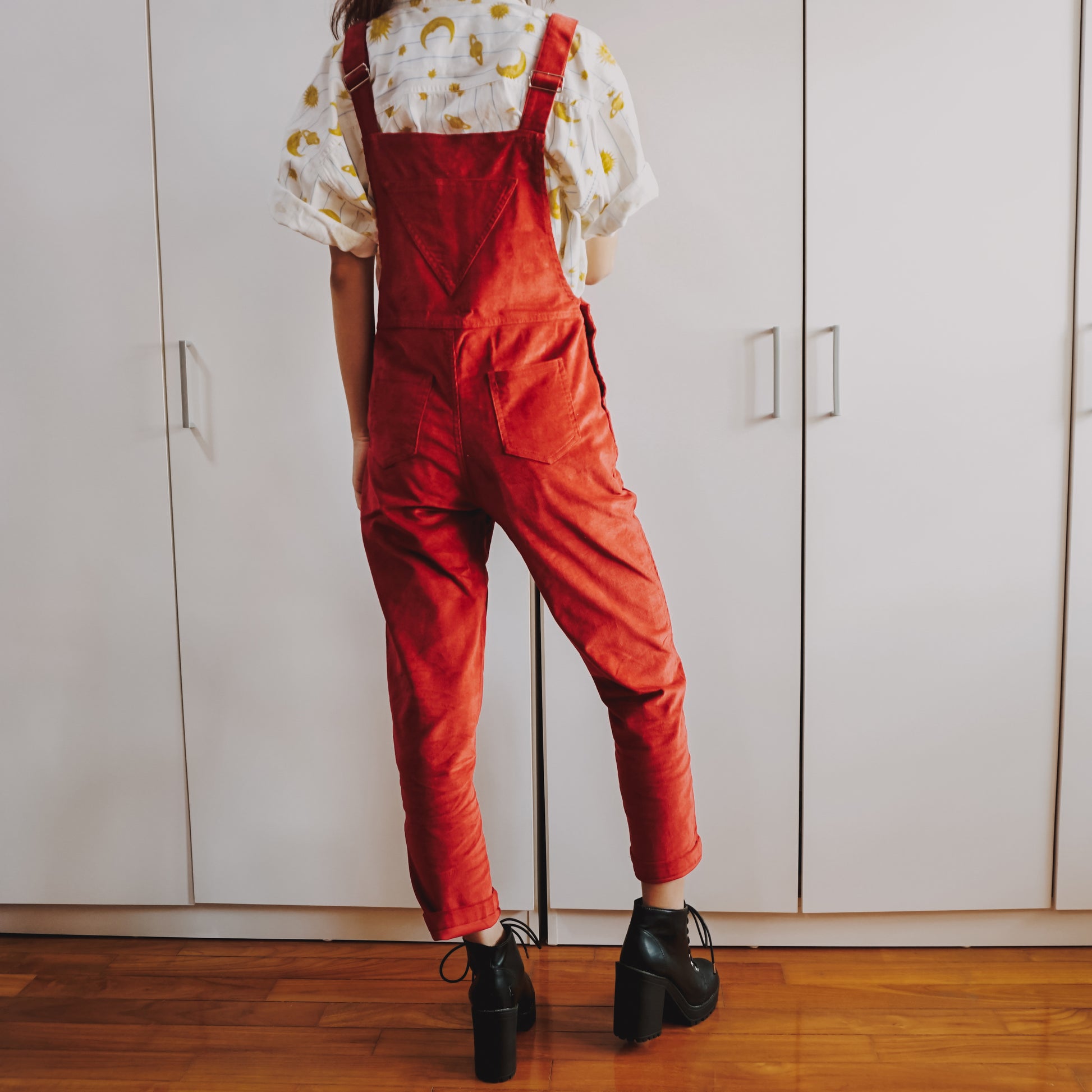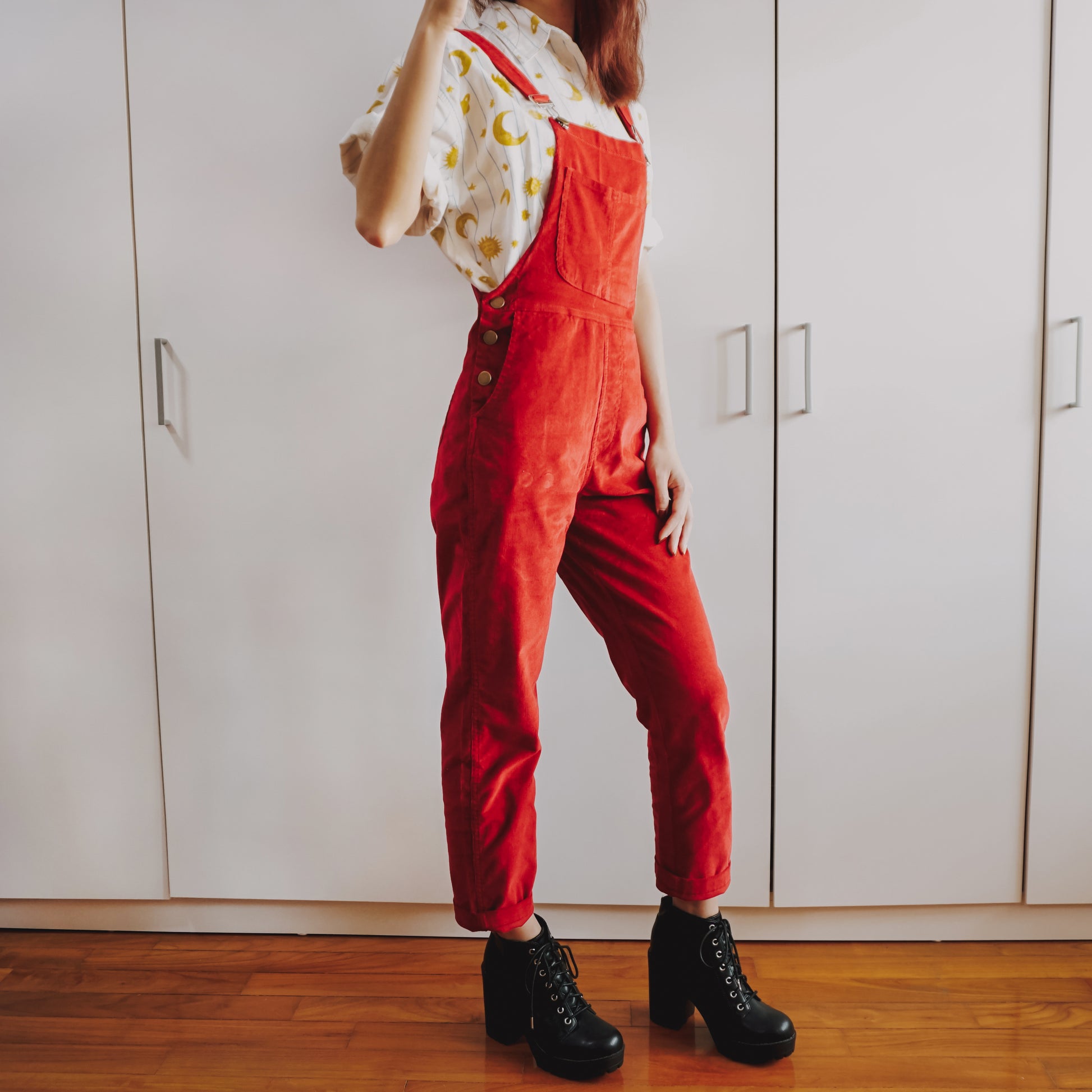 Corduroy slim fit overalls with a high waist, big front bib pocket, side pockets and back pockets. Perfect length for petites. Model is 1.58m/5'2" wearing size XS.