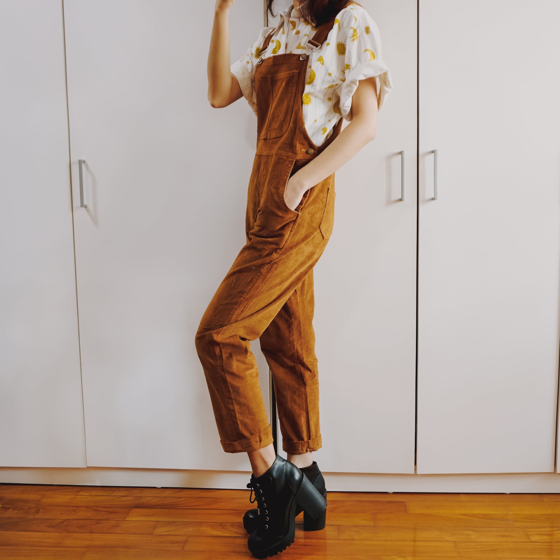 Corduroy slim fit overalls with a high waist, big front bib pocket, side pockets and back pockets. Perfect length for petites. Model is 1.58m/5'2" wearing size XS.