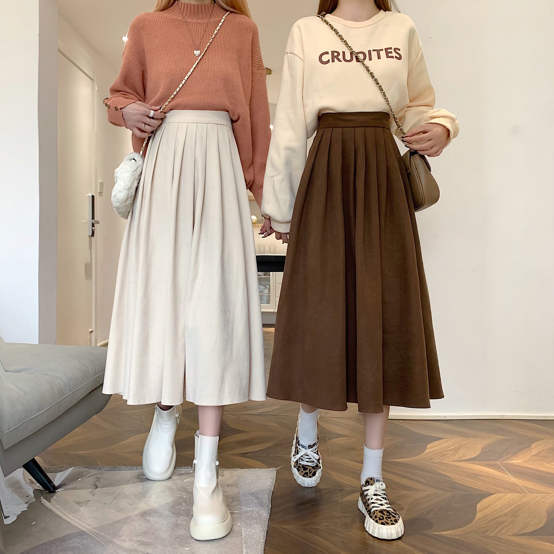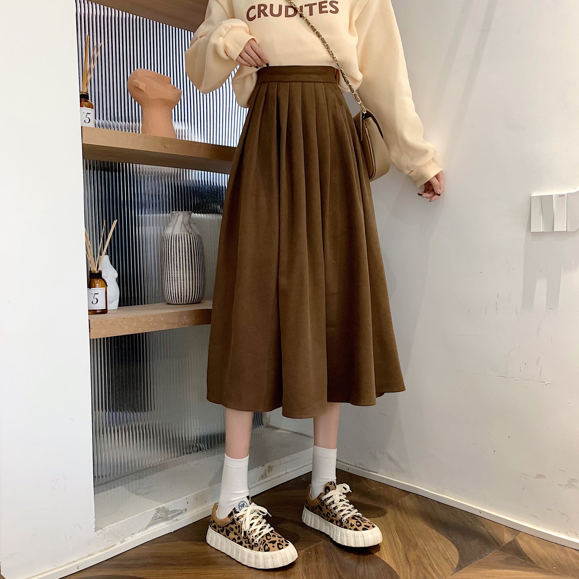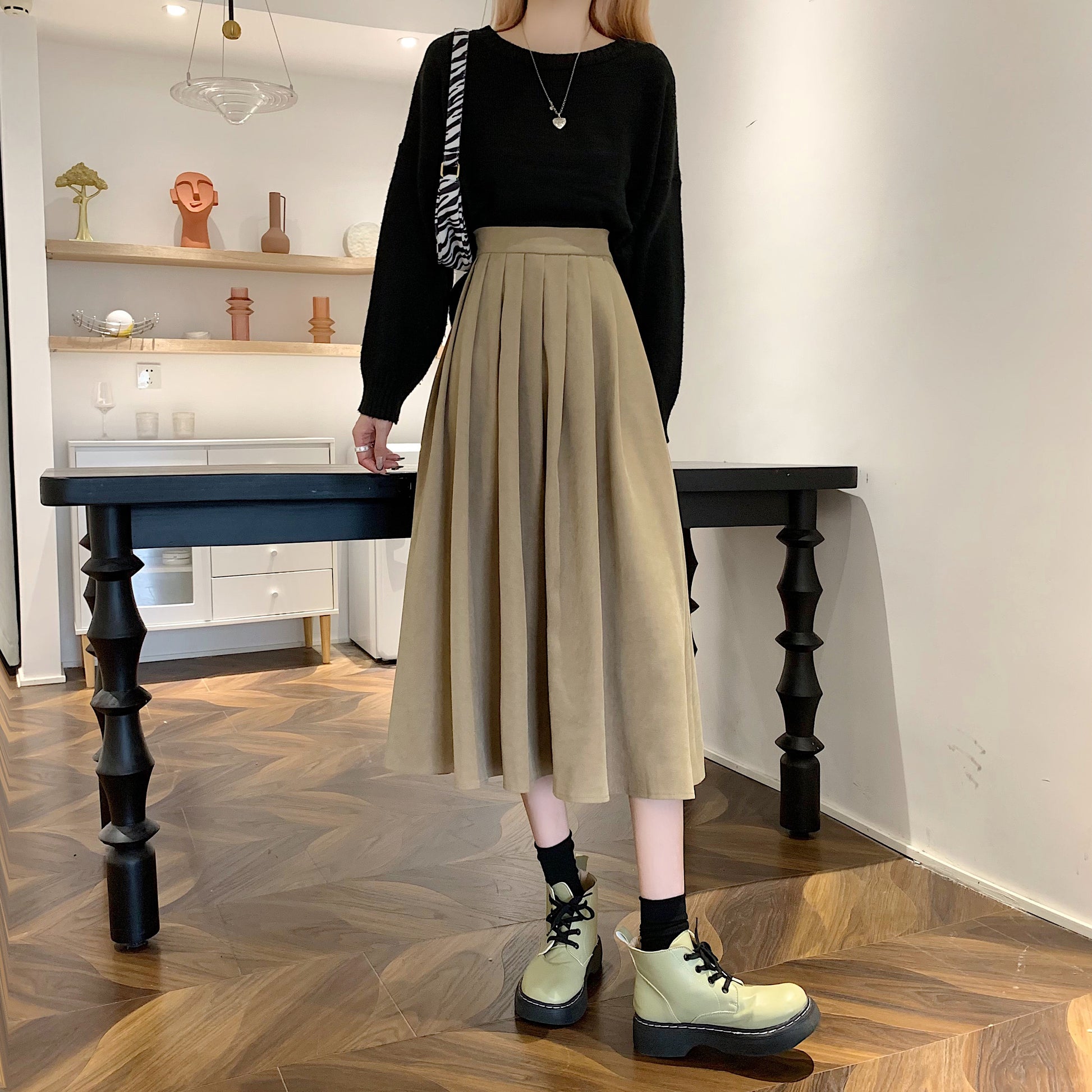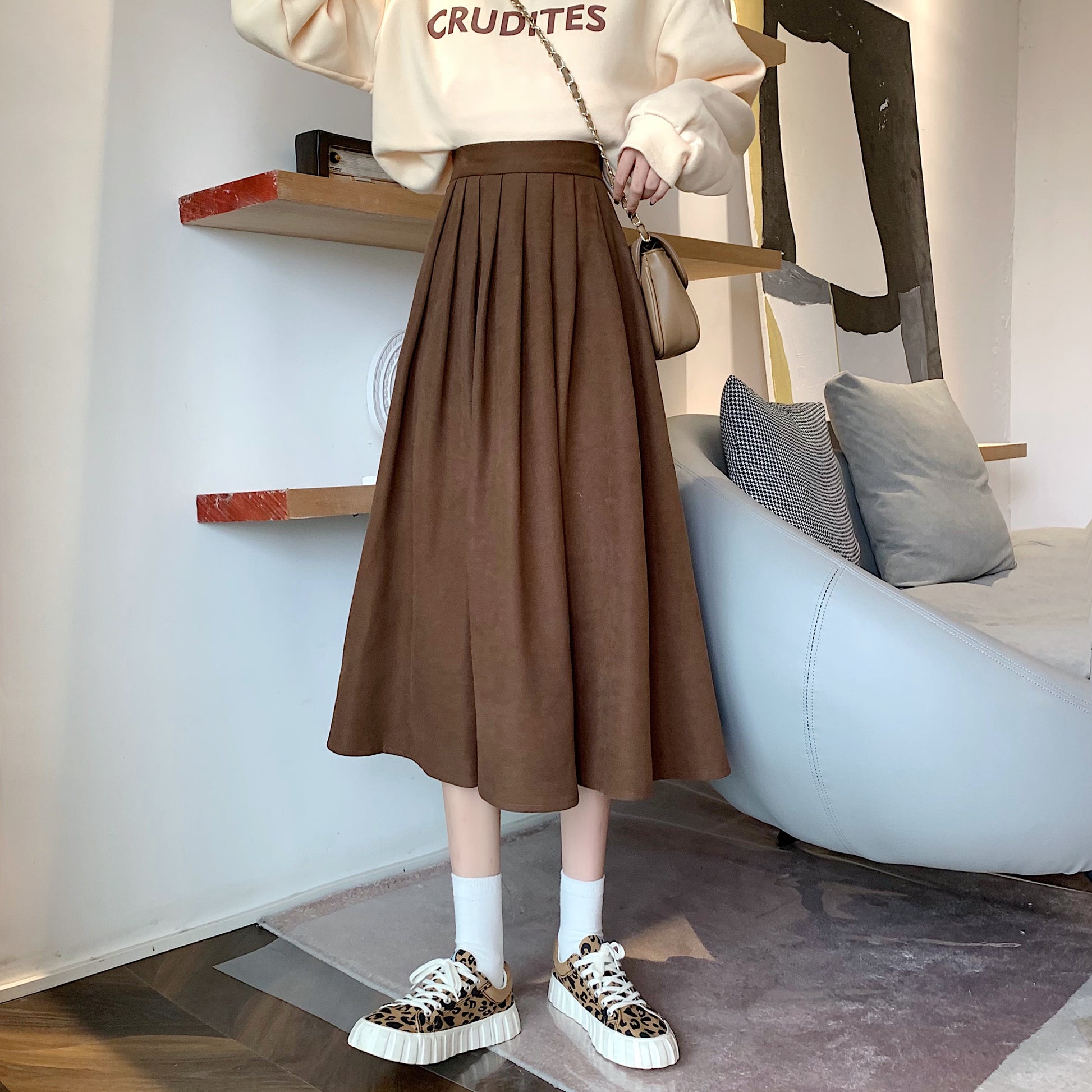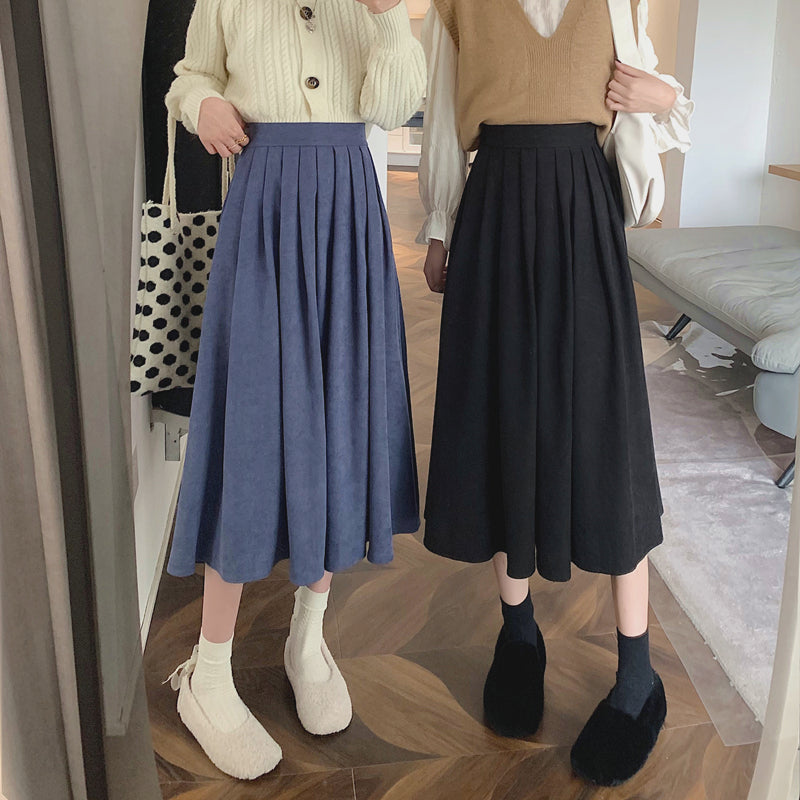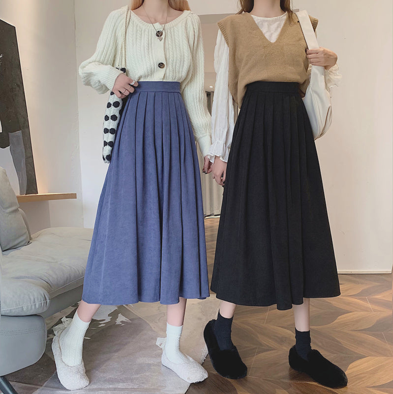 Thin ribbed corduroy suede midi skirt with pleats on the front that flare into a swing skirt. Elastic waist back. Concealed side zipper.