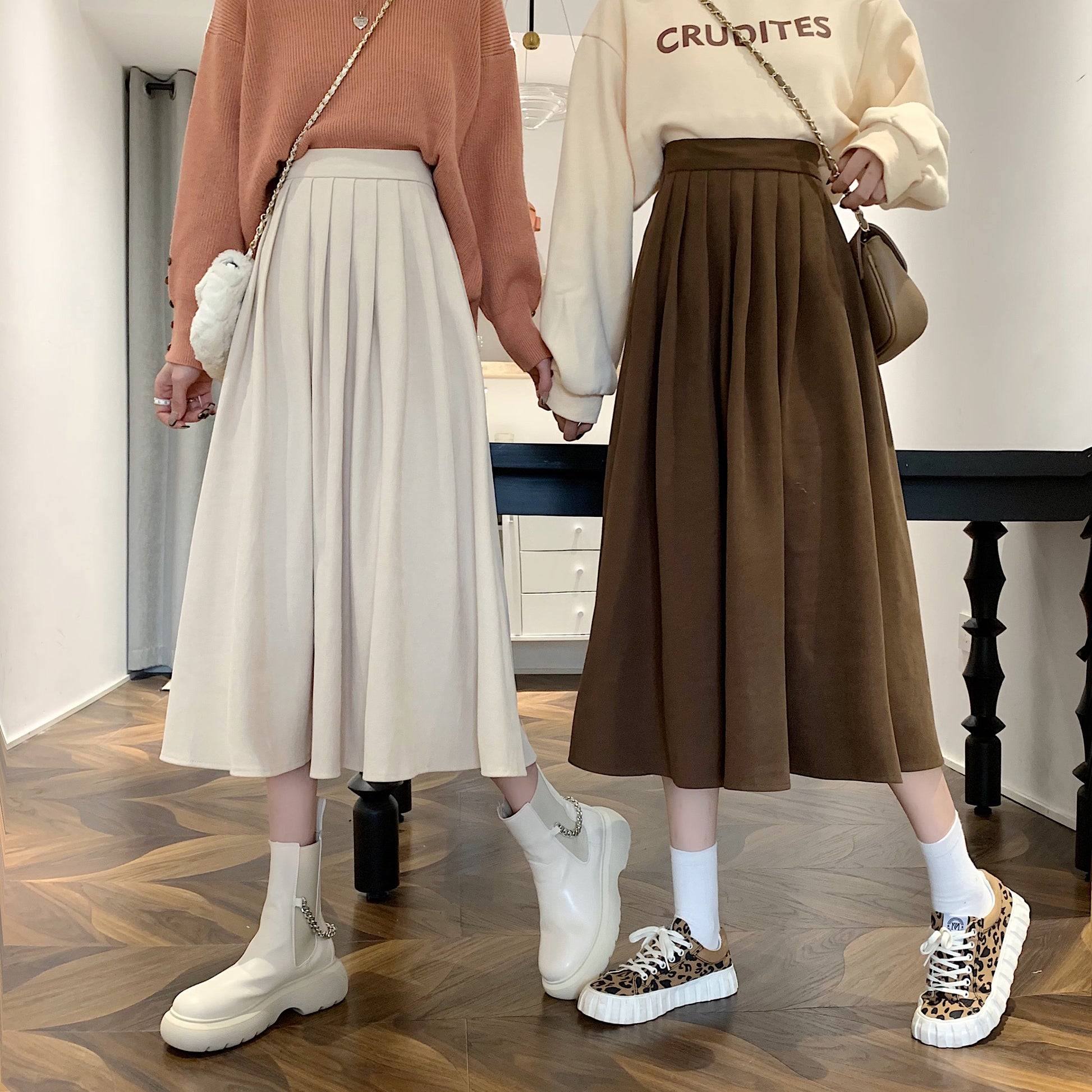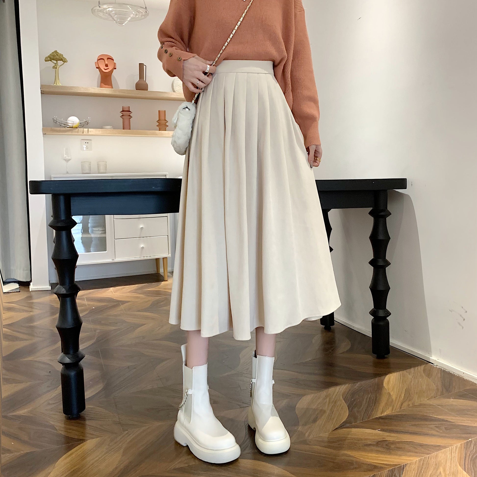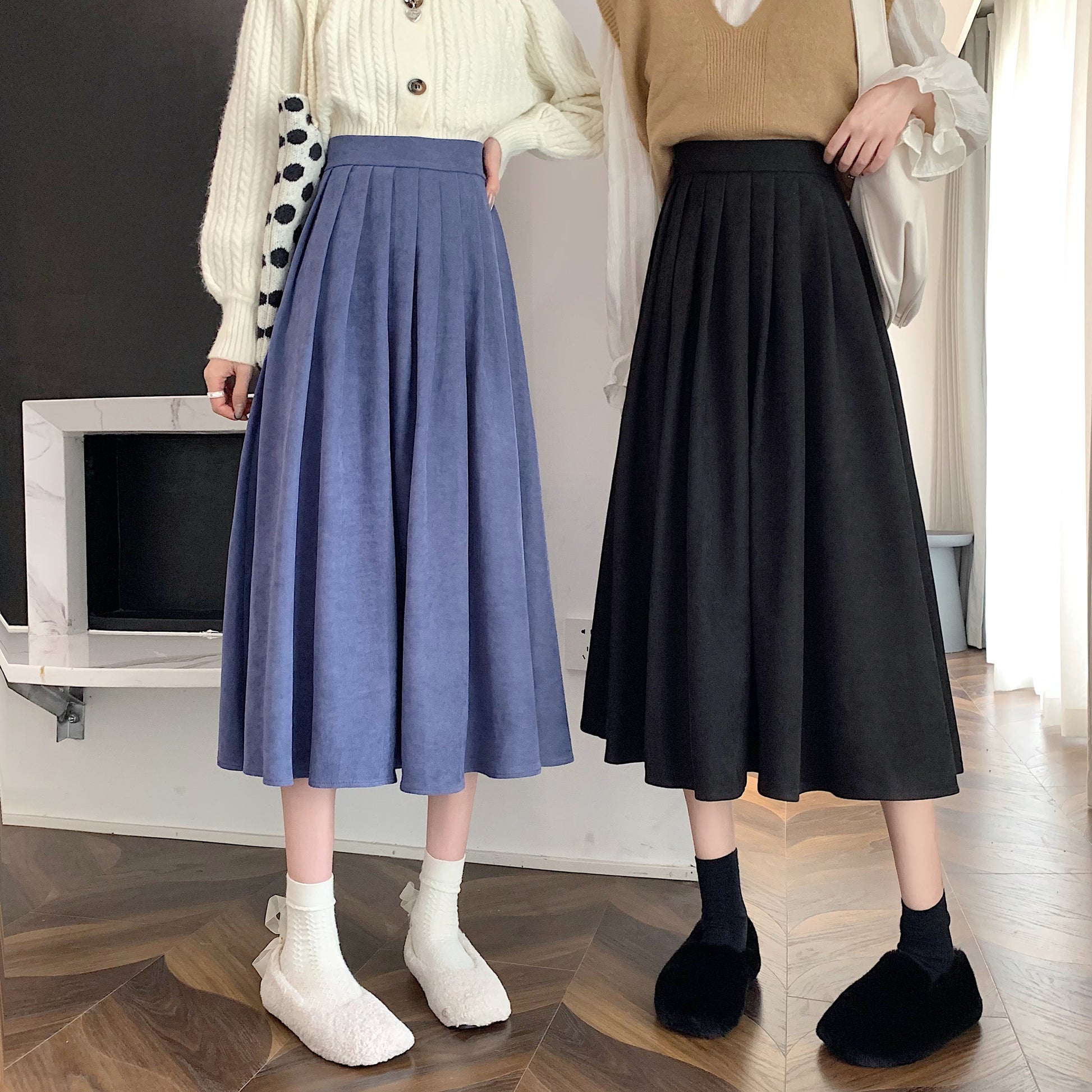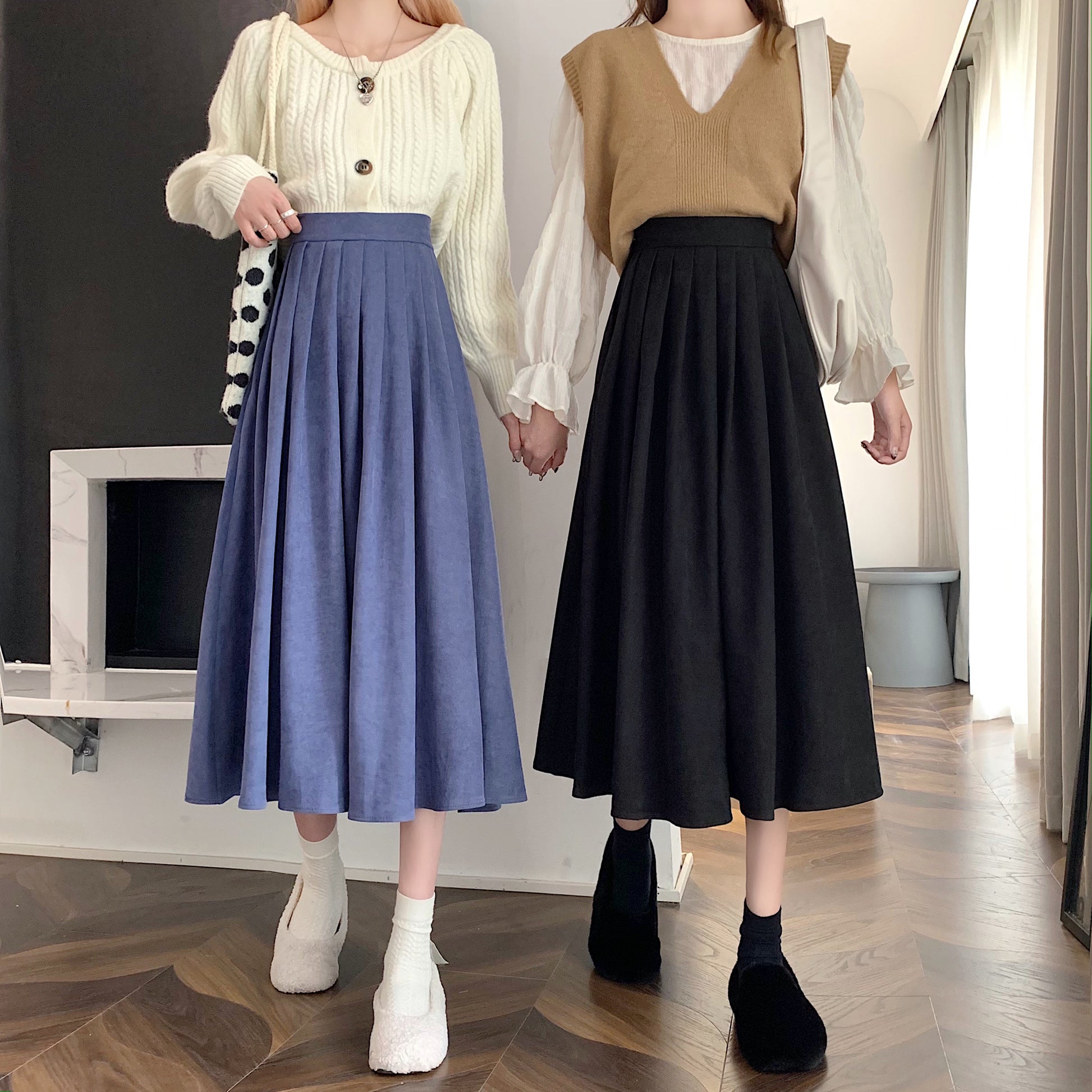 Thin ribbed corduroy suede midi skirt with pleats on the front that flare into a swing skirt. Elastic waist back. Concealed side zipper.