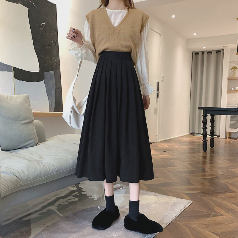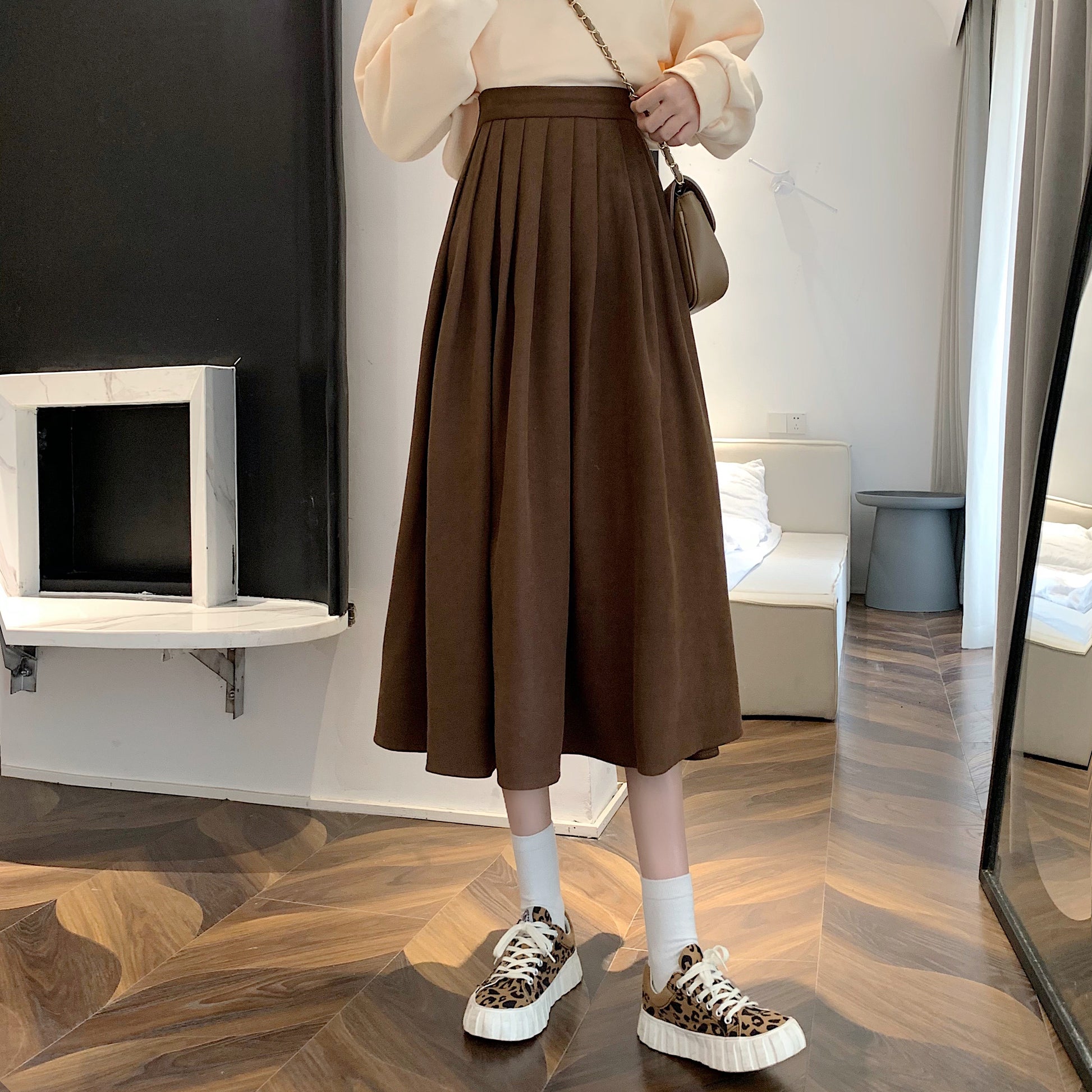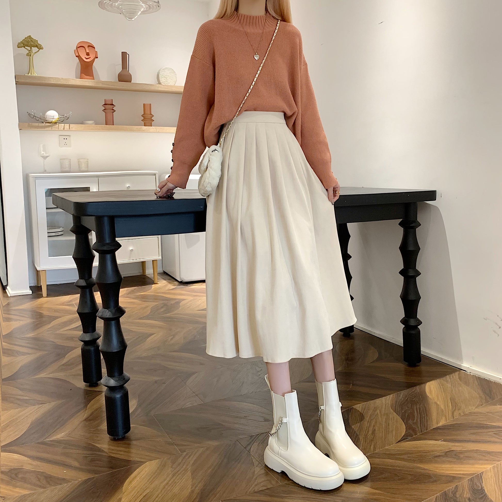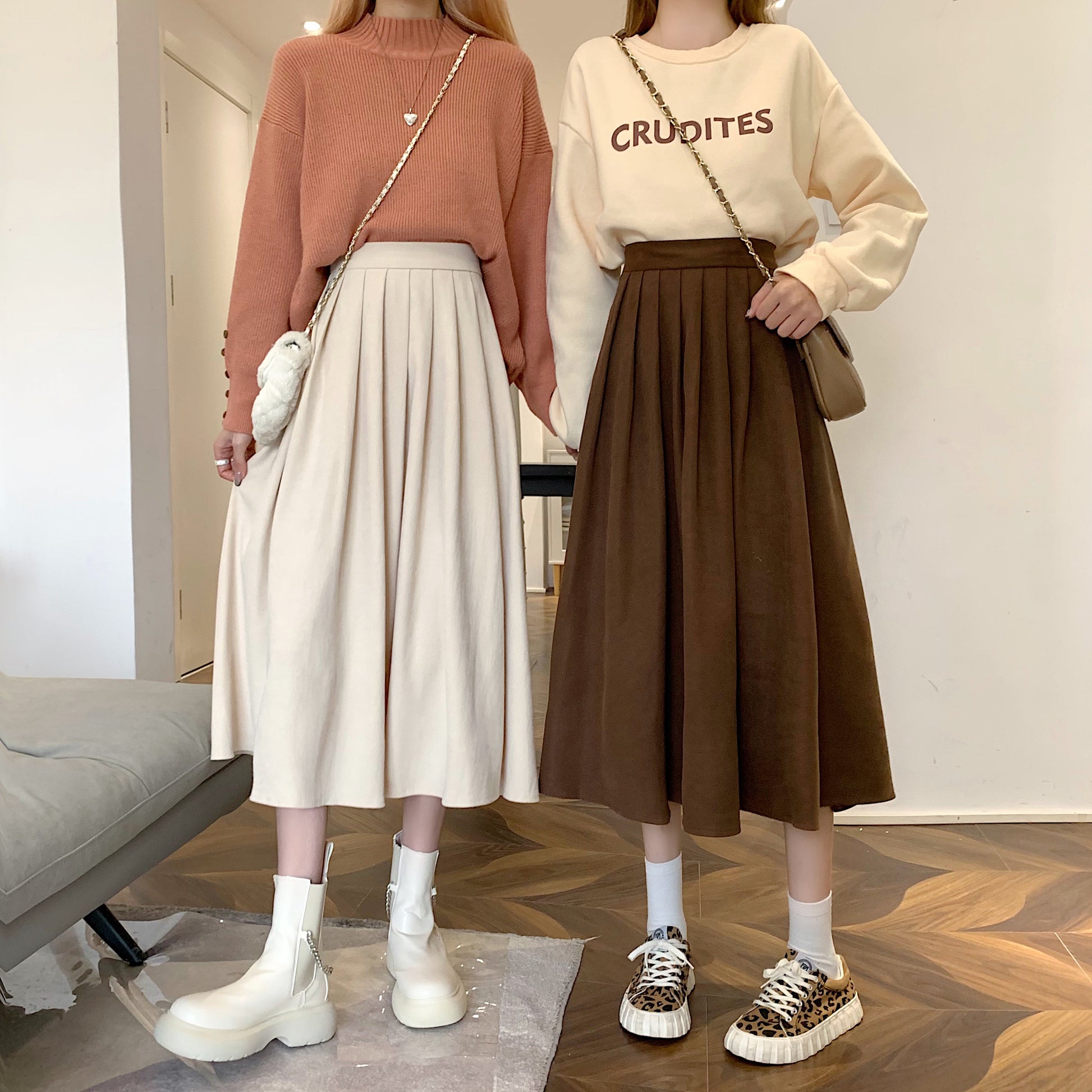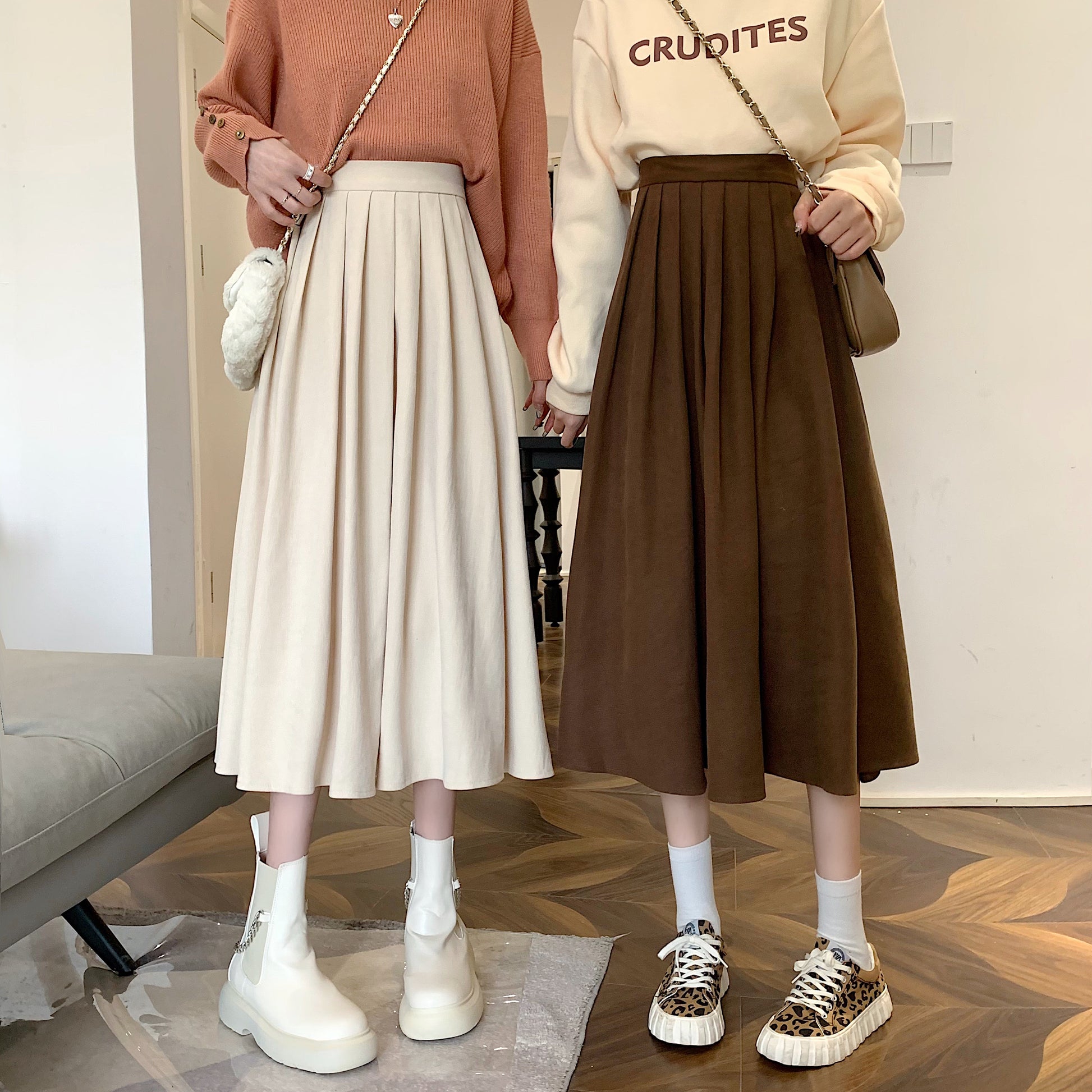 Thin ribbed corduroy suede midi skirt with pleats on the front that flare into a swing skirt. Elastic waist back. Concealed side zipper.