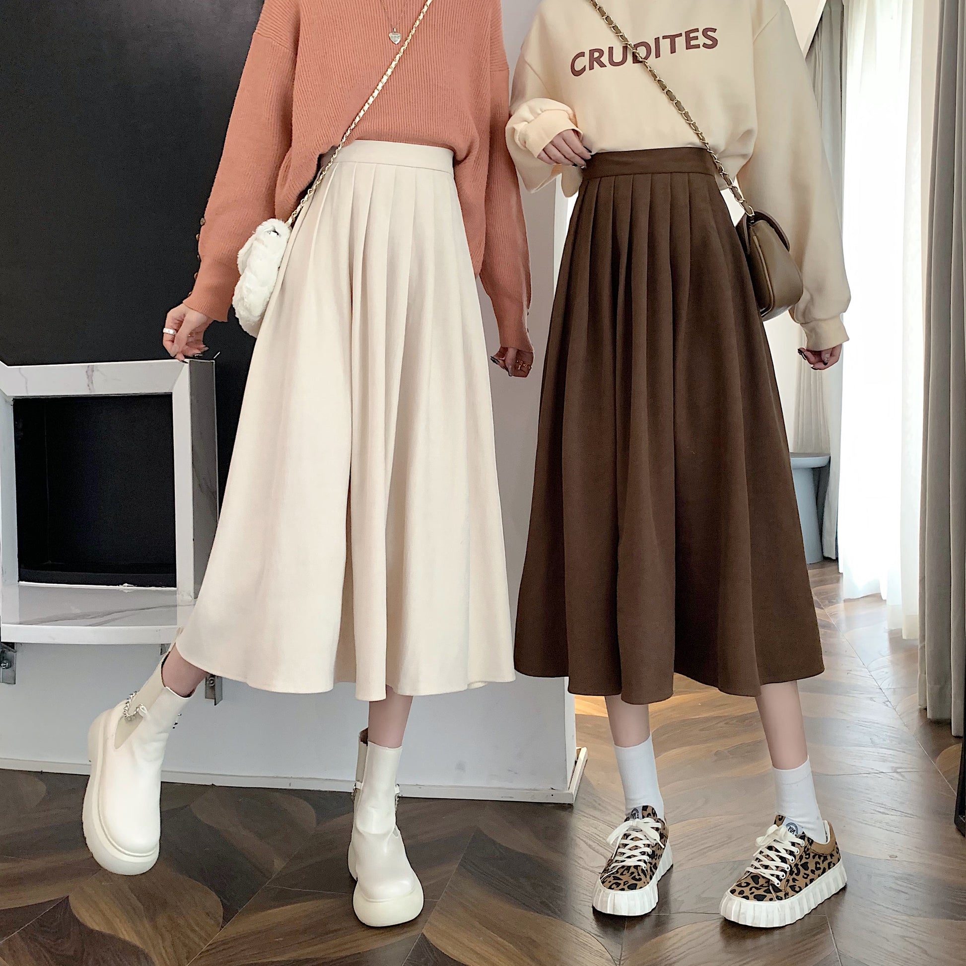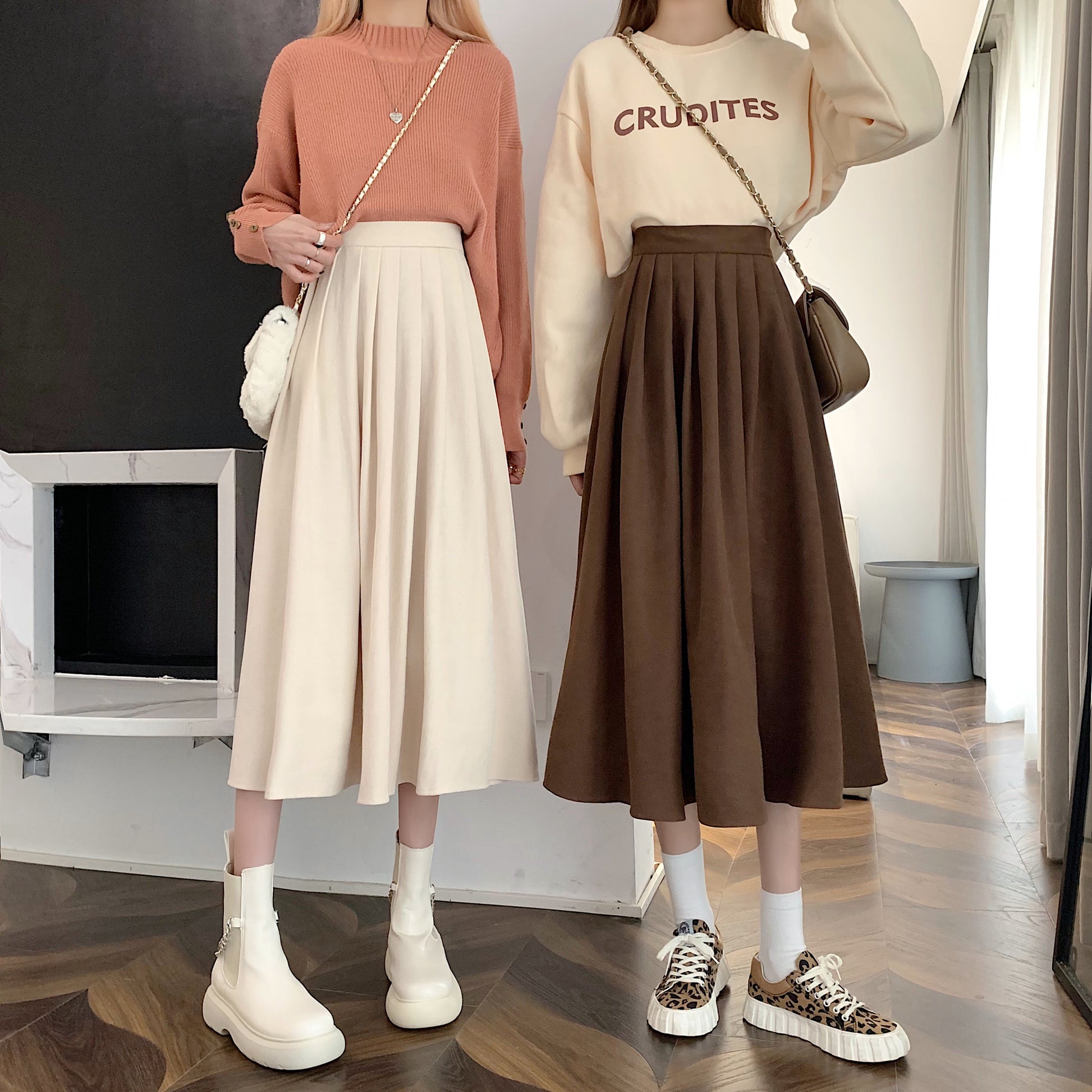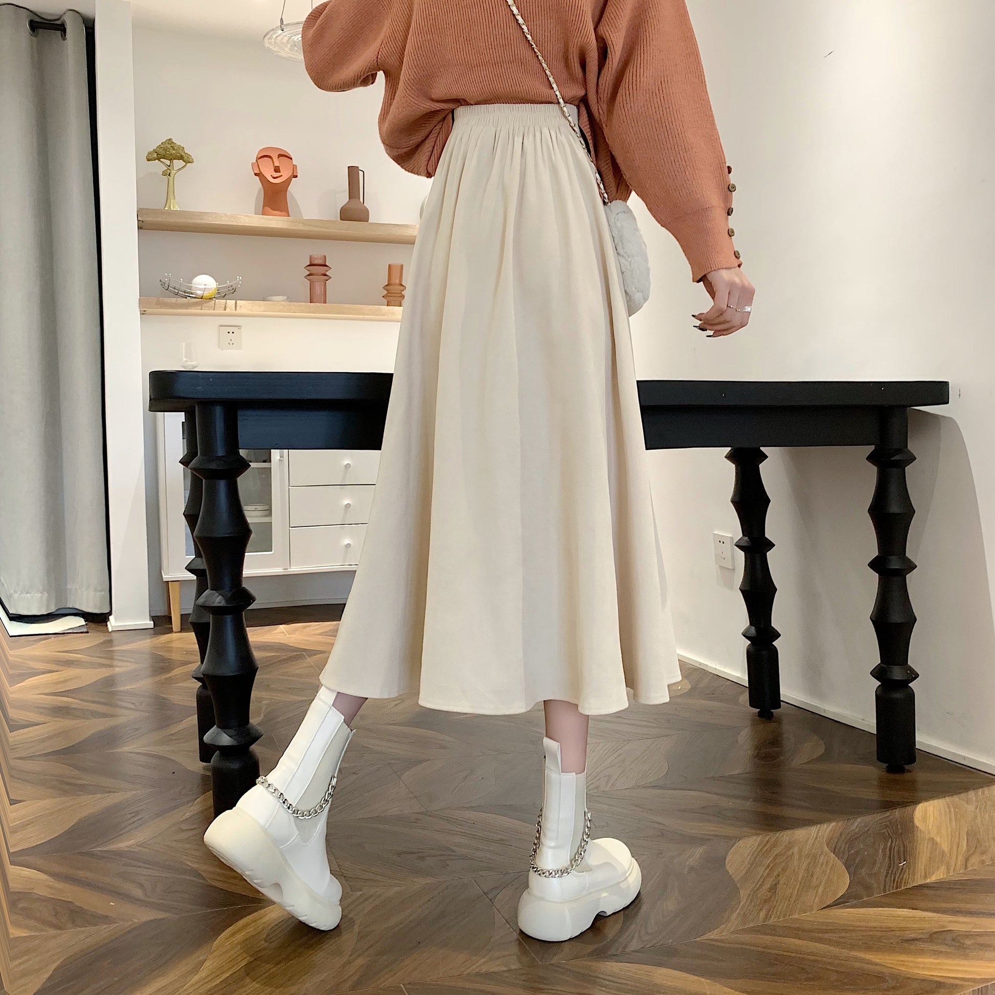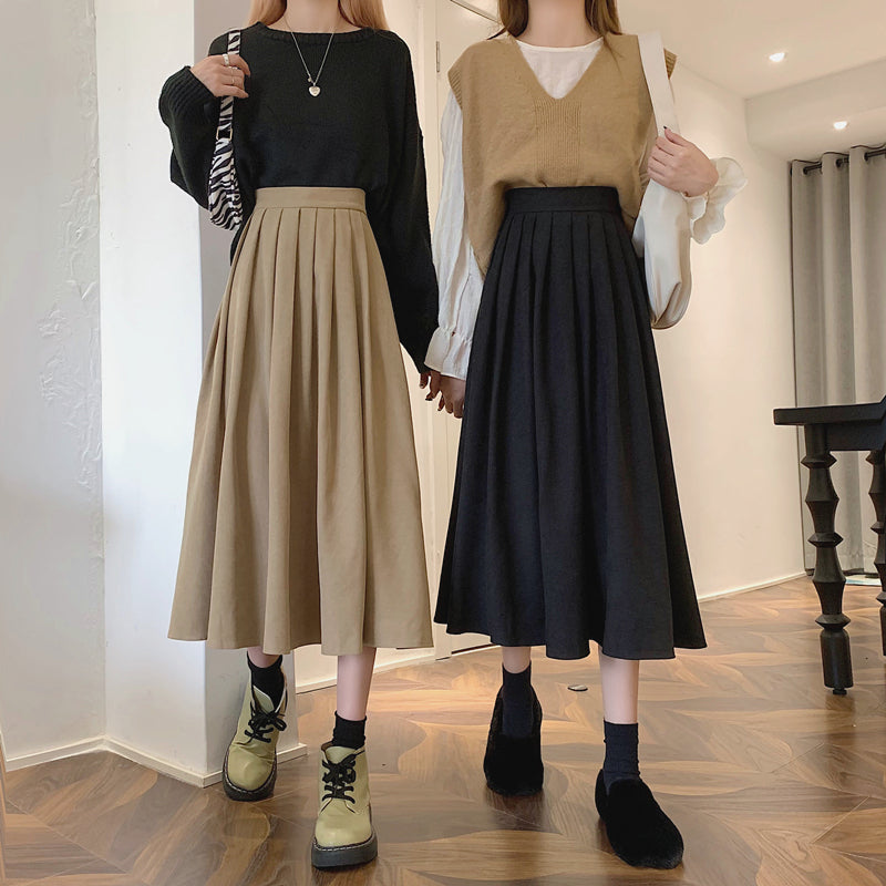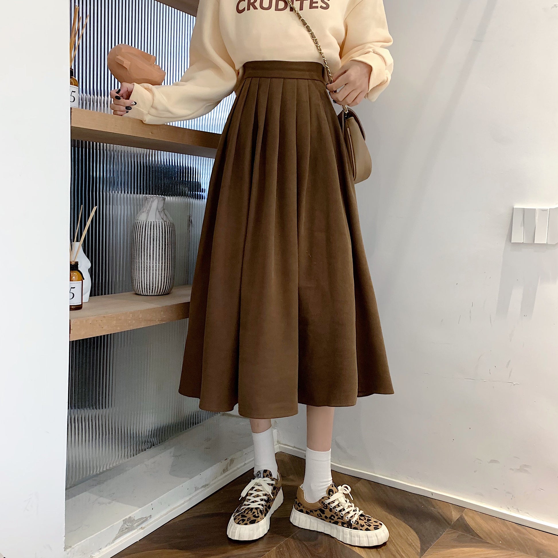 Thin ribbed corduroy suede midi skirt with pleats on the front that flare into a swing skirt. Elastic waist back. Concealed side zipper.