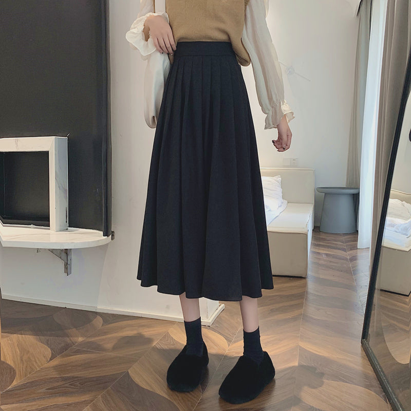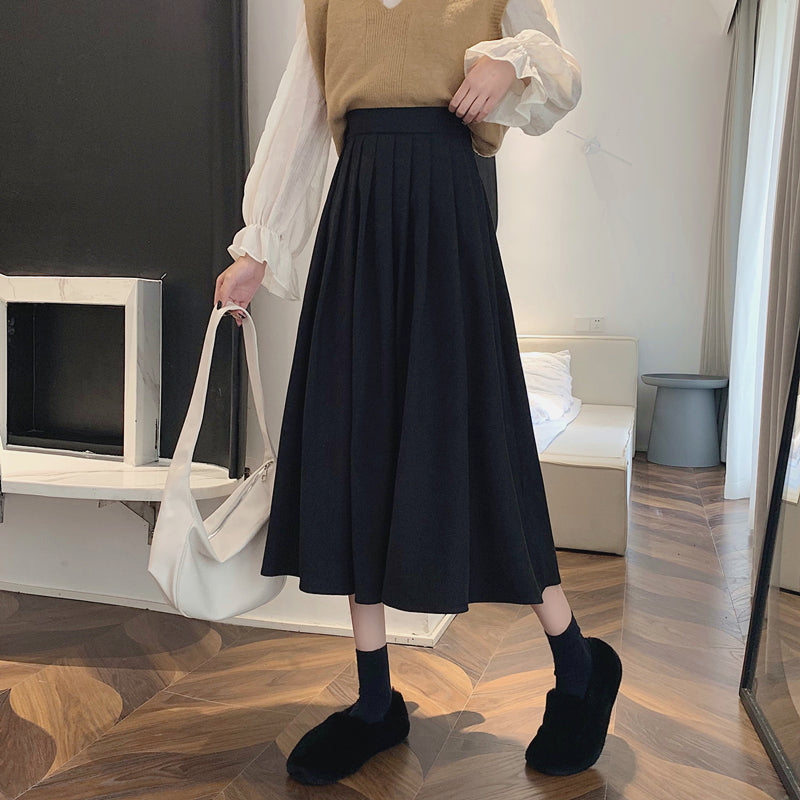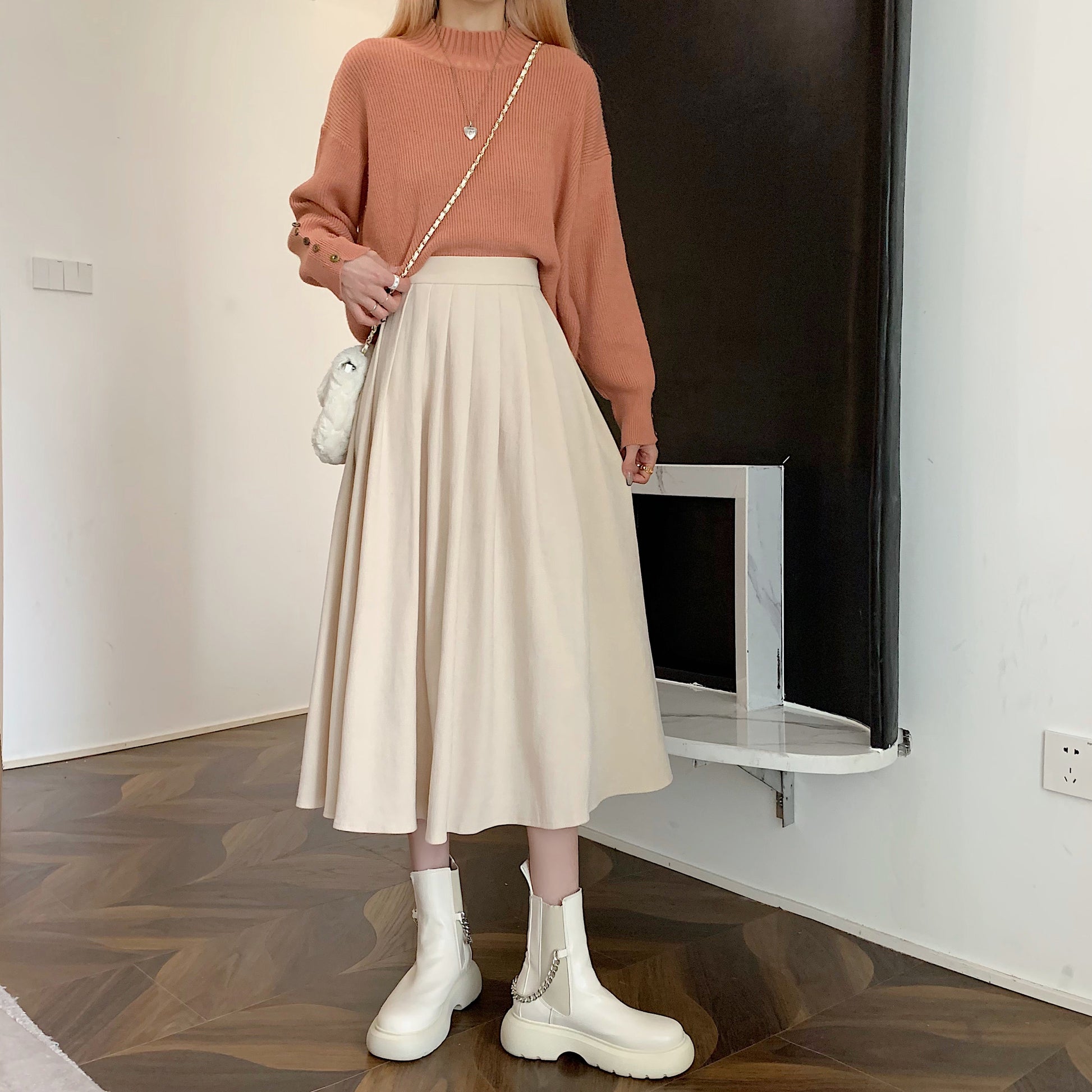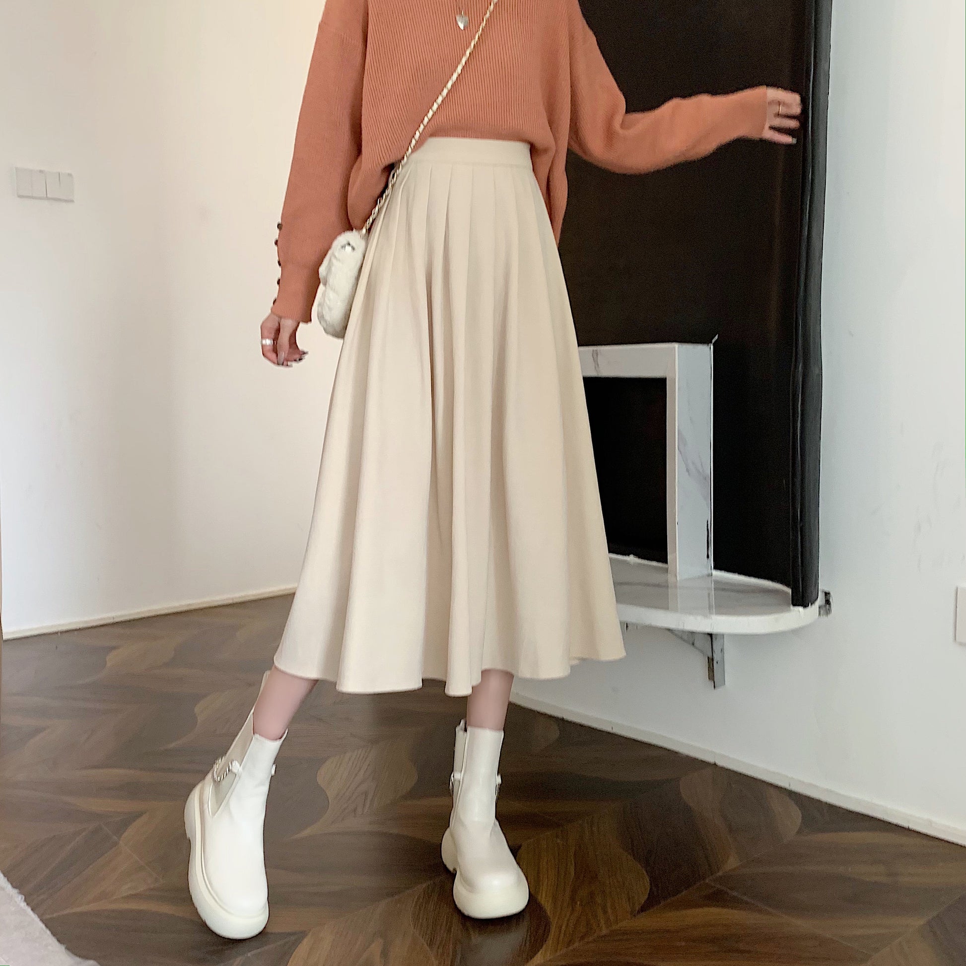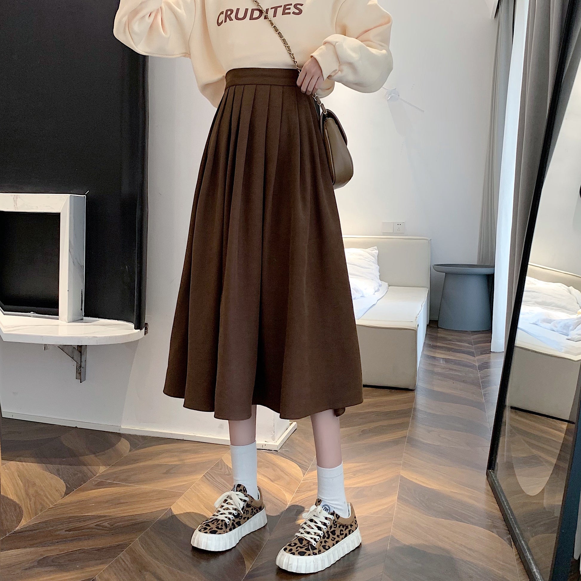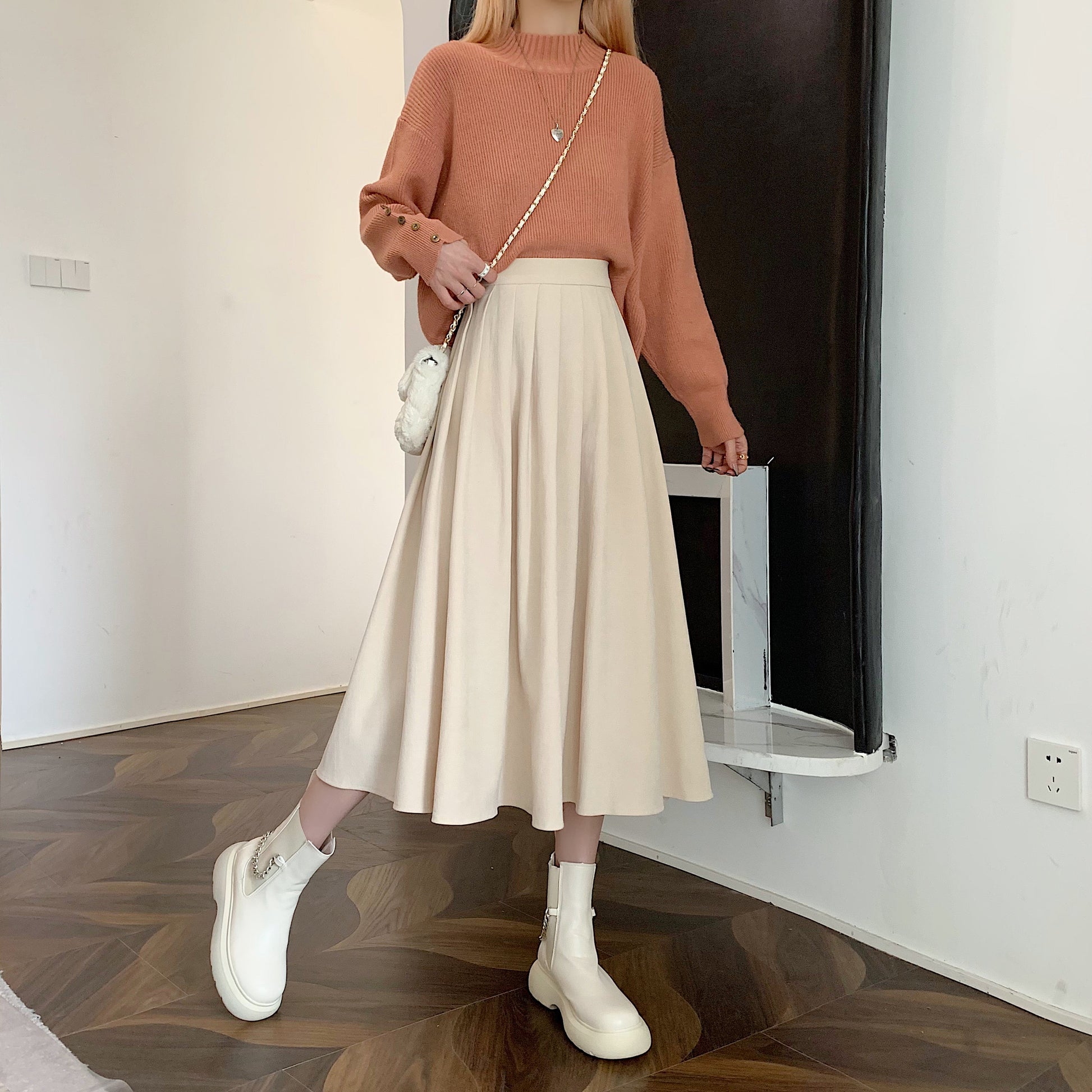 Thin ribbed corduroy suede midi skirt with pleats on the front that flare into a swing skirt. Elastic waist back. Concealed side zipper.