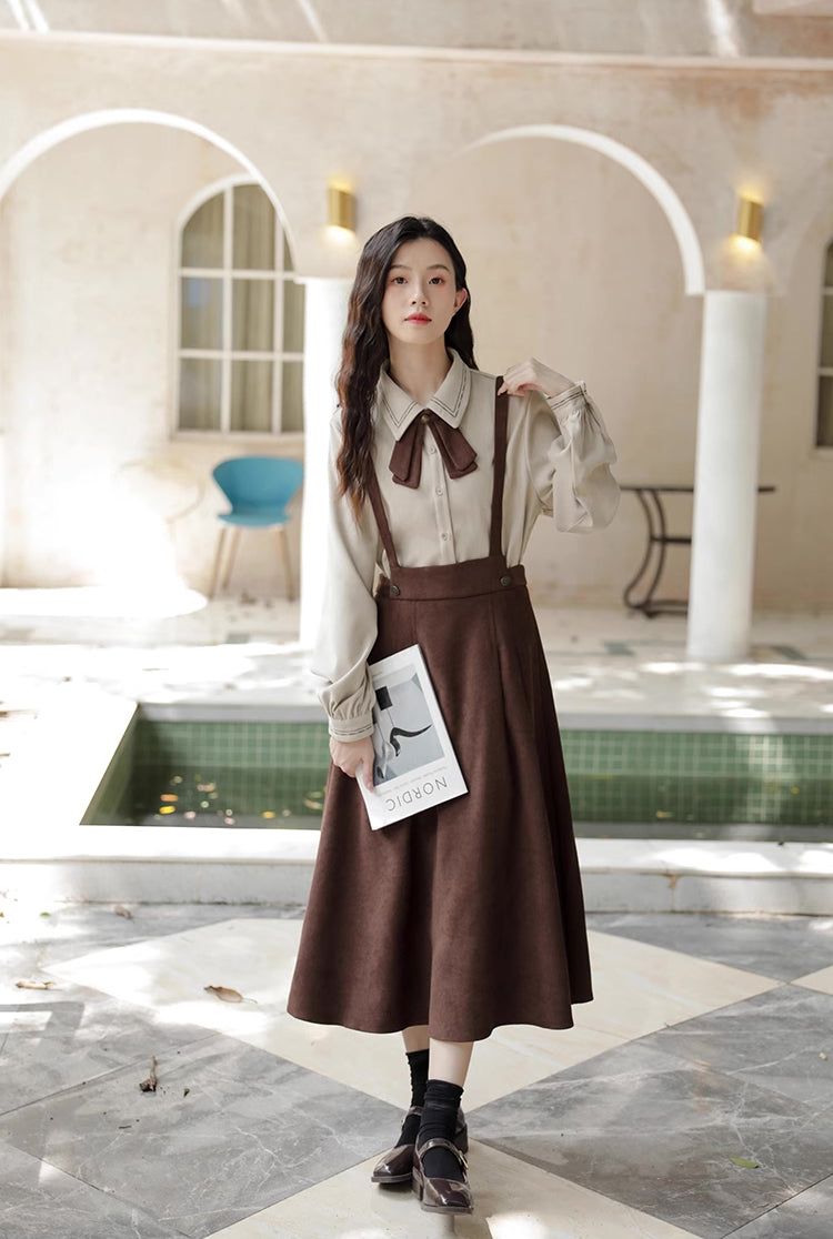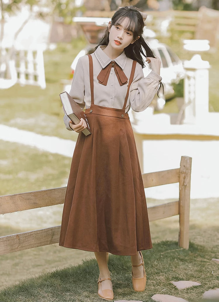 Corduroy Suede Suspender Skirt / Blouse (Brown)