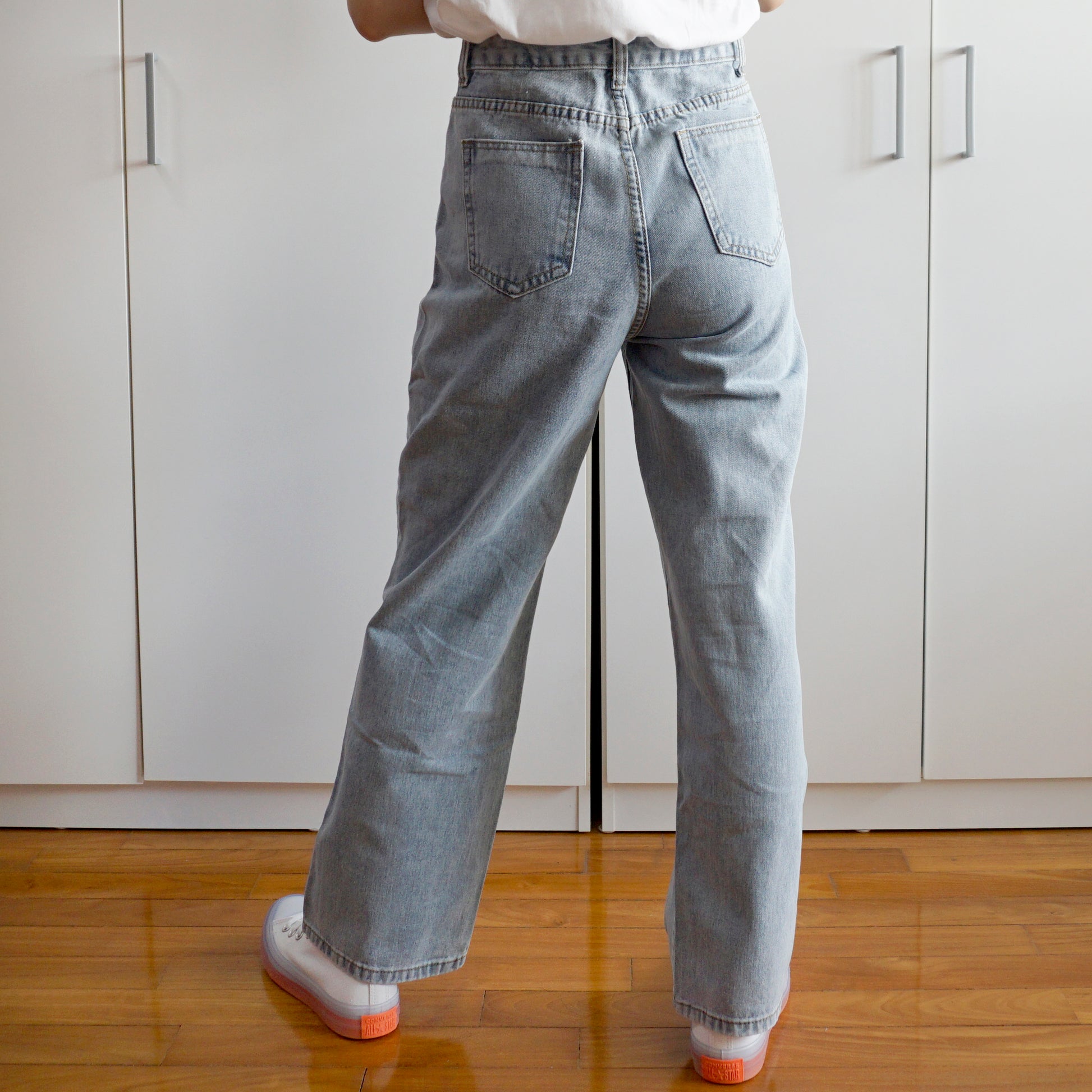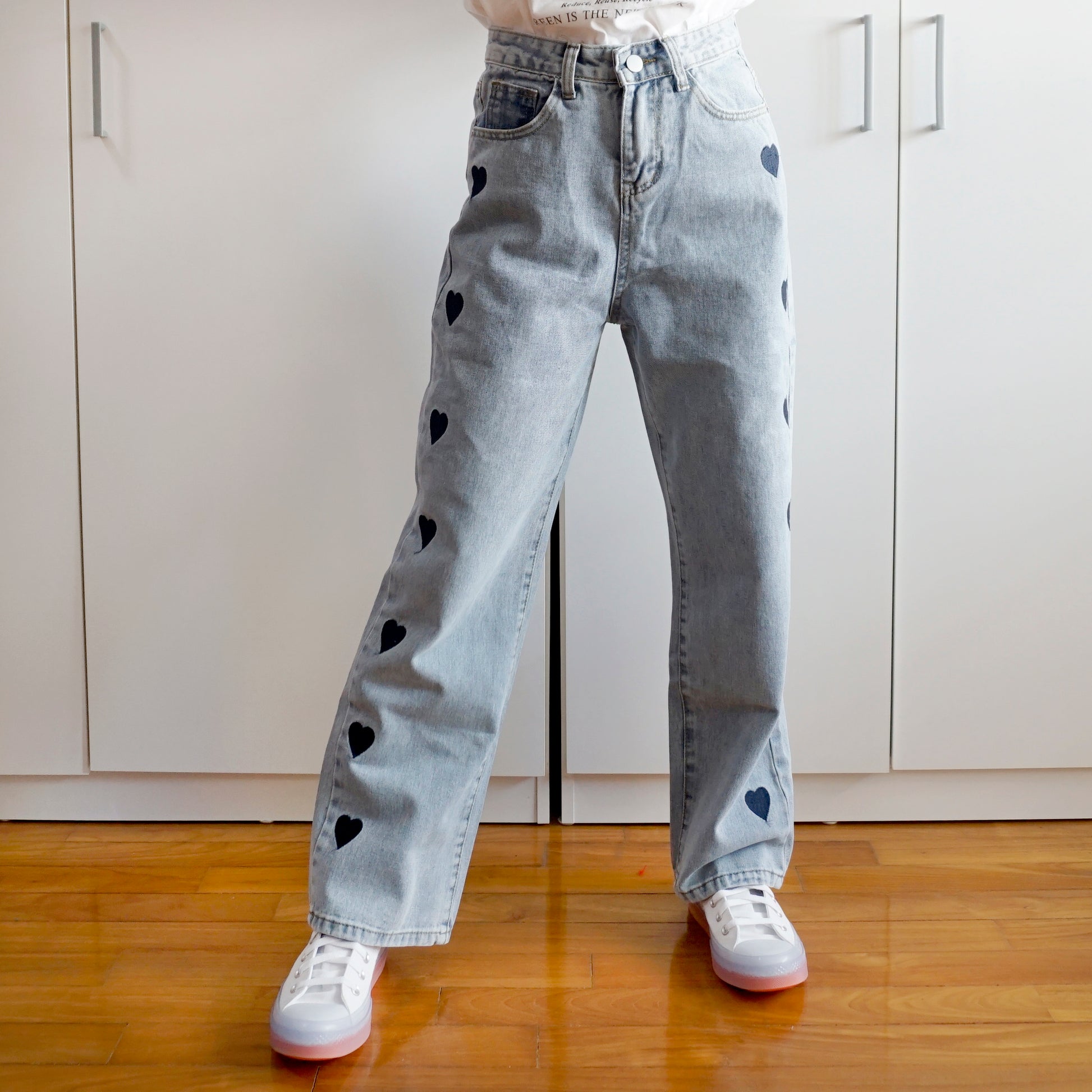 High waist straight leg denim jeans with embroidered hearts running down the sides.