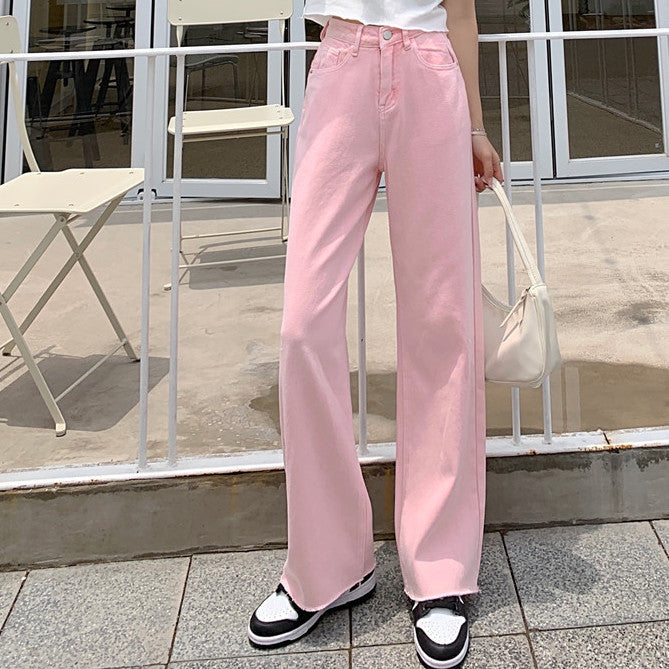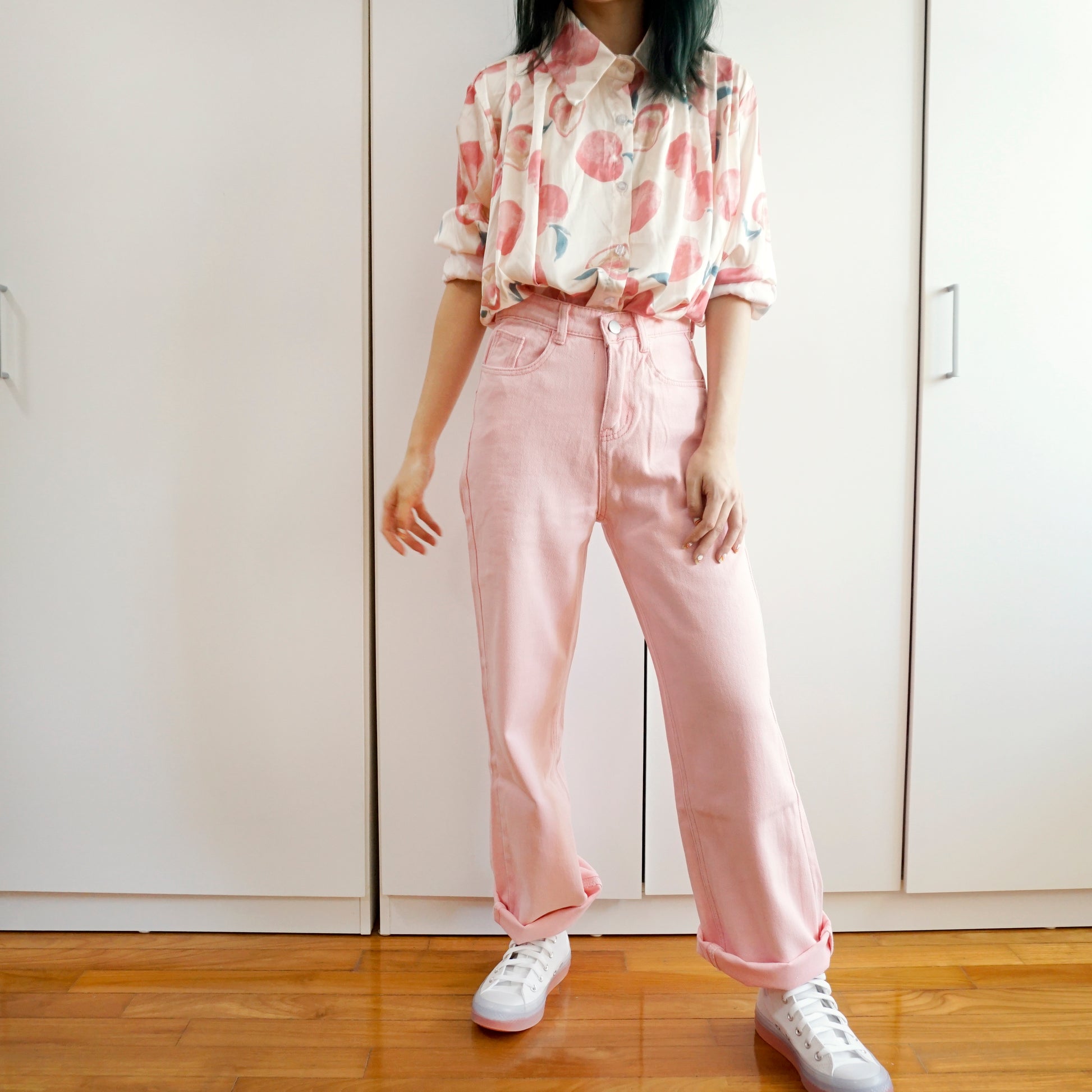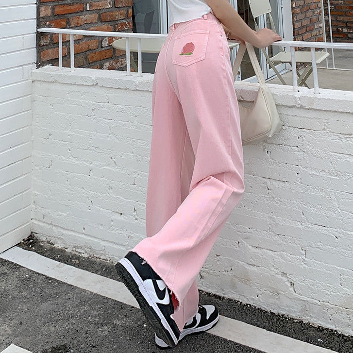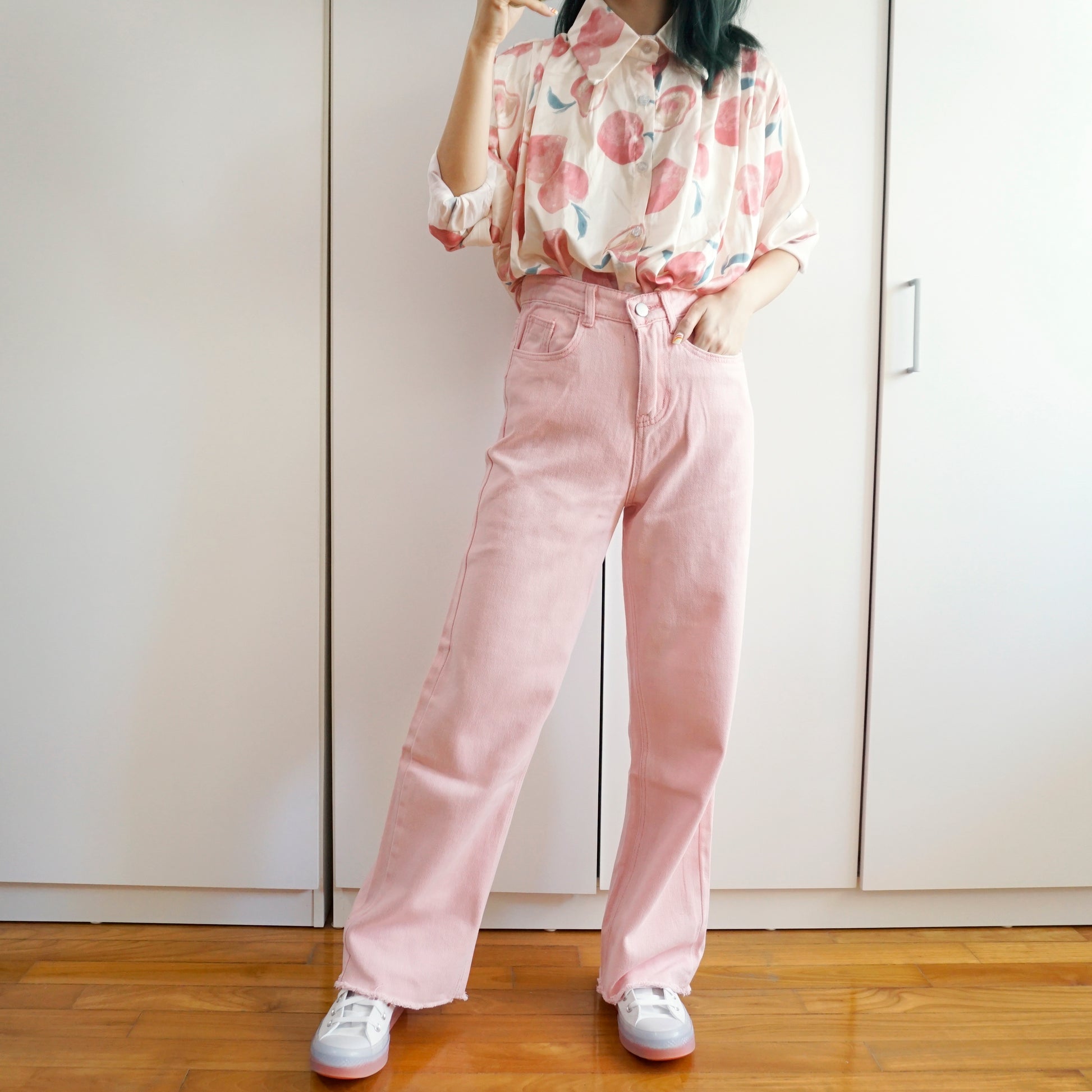 Everything is peachy with this high waisted pink jeans with straight legs and an embroidered peach back pocket. Raw hems. Button and zip closure with belt loops, side pockets and back pockets. Cut open button hole with scissors.
