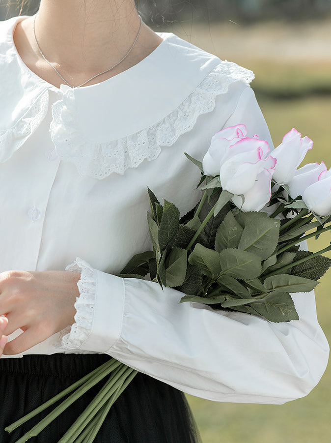 Long sleeve blouse with a frilly peter pan collar with floral eyelet trims and cuffs.