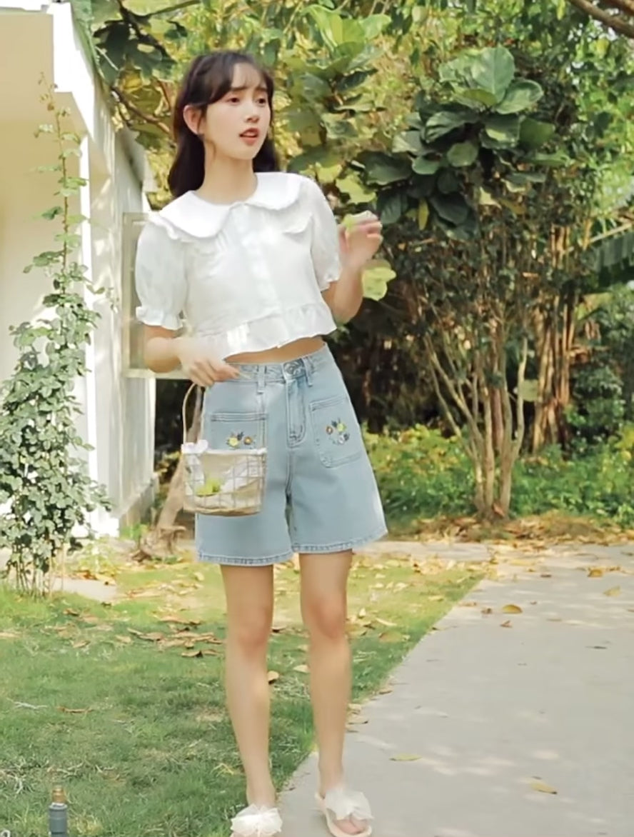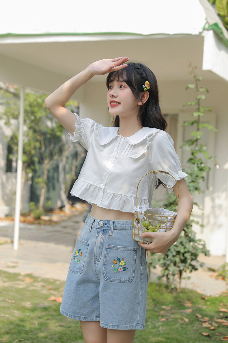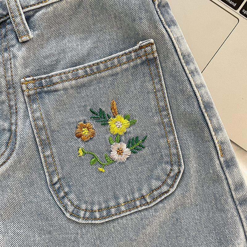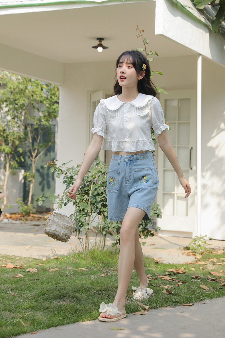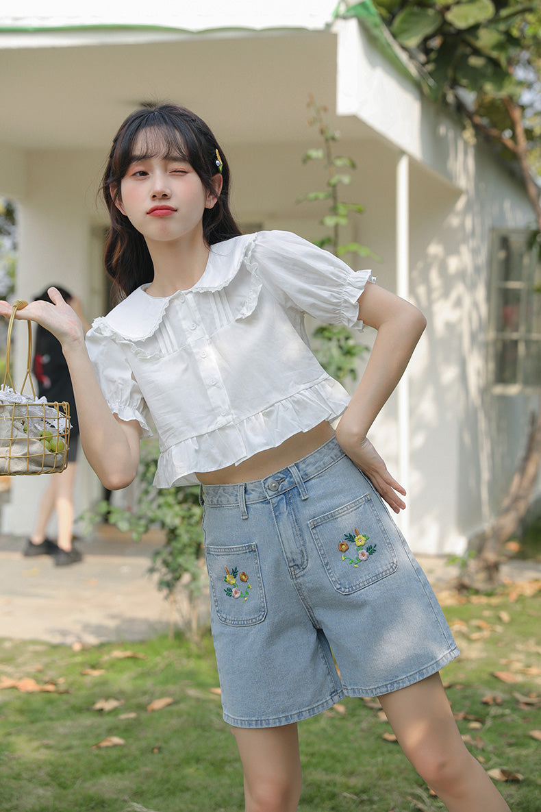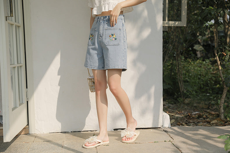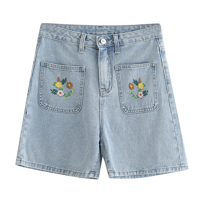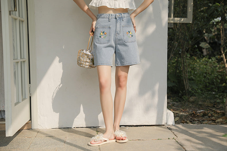 Vintage inspired denim shorts with retro looking front pockets, cute floral embroidery, high waisted fit and relaxed legs. Button and zip up front with belt loops and back pockets. Cut open button hole with scissors.
