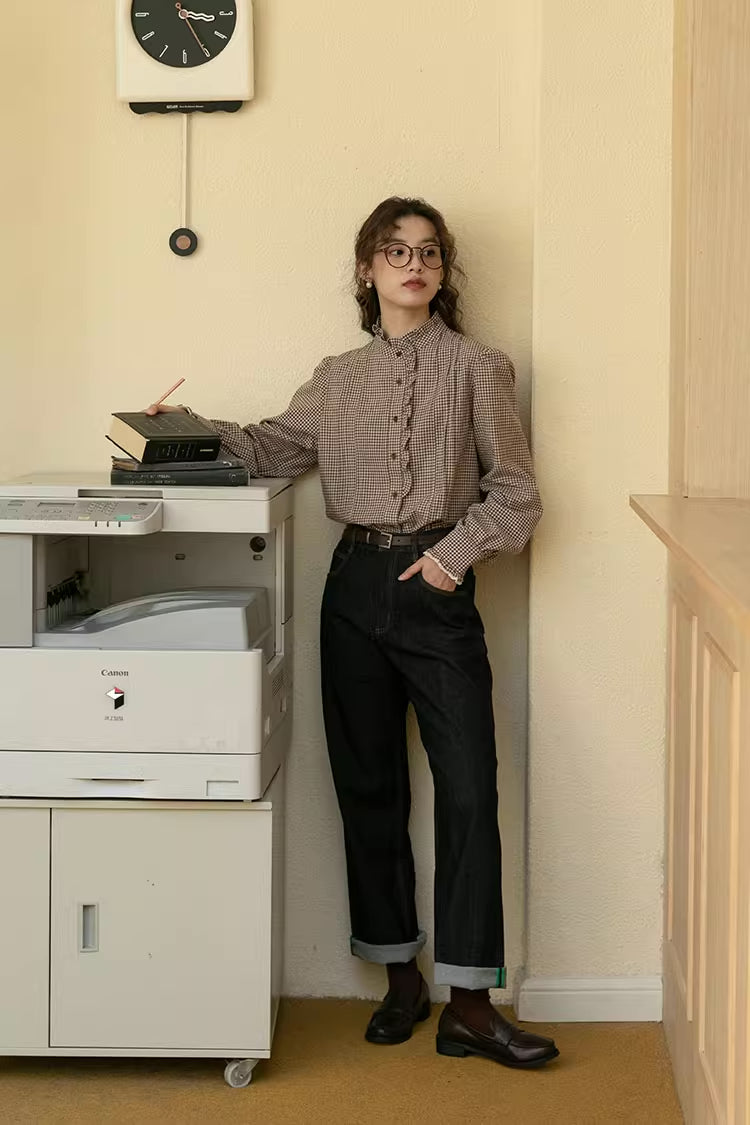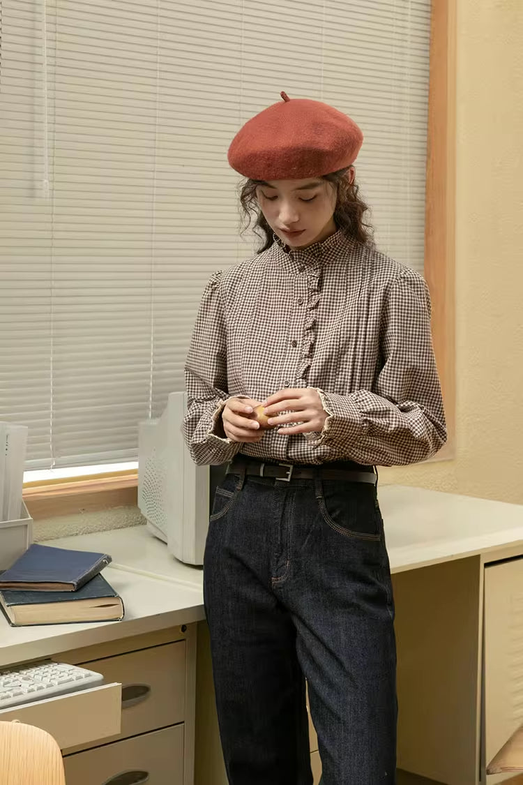 Gingham Plaid Ruffle Blouse (Coffee)