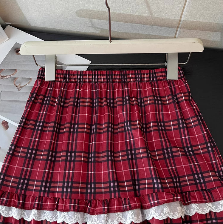 Holiday Plaid Tiered Lace Midi Skirt (Red)