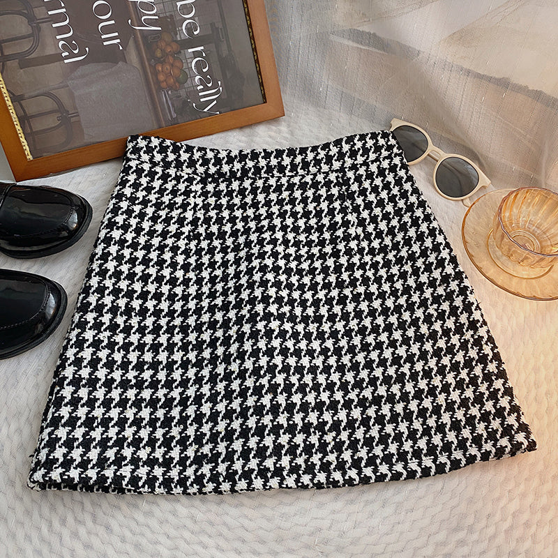 Short A-line skirt in a houndstooth plaid print with a concealed back zipper and lined with safety shorts.