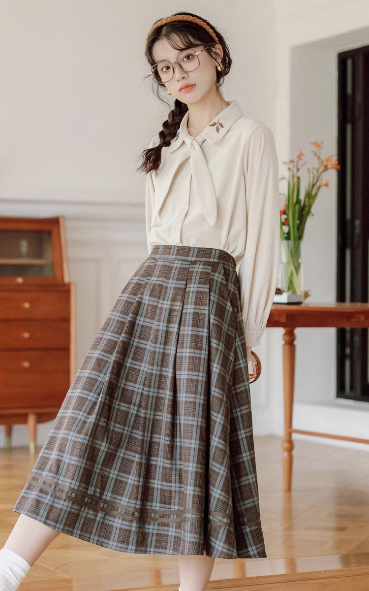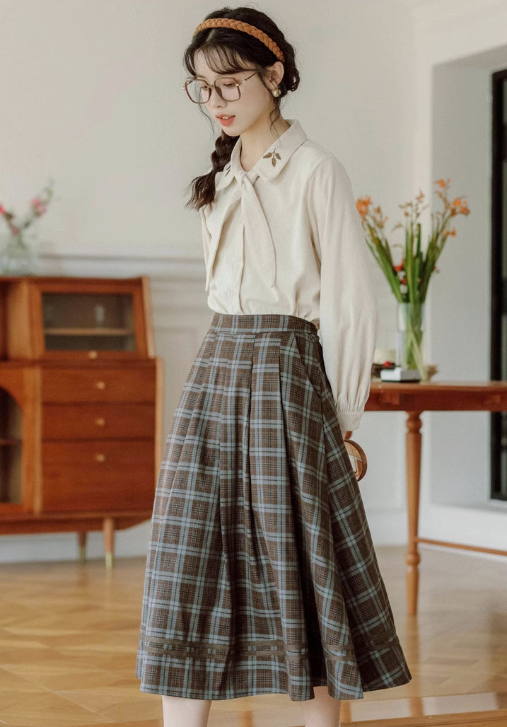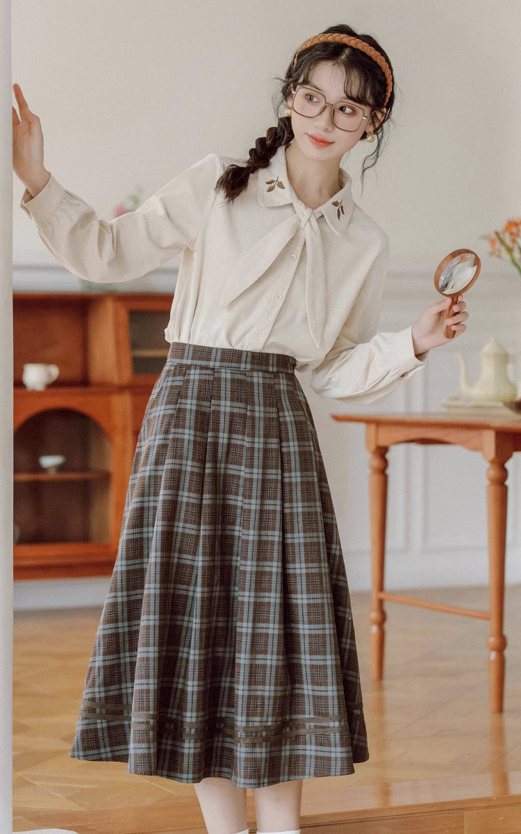 Leafy Corduroy Tie-Neck Blouse (Cream)