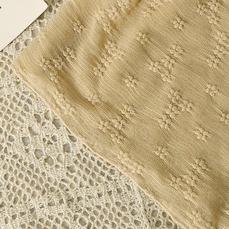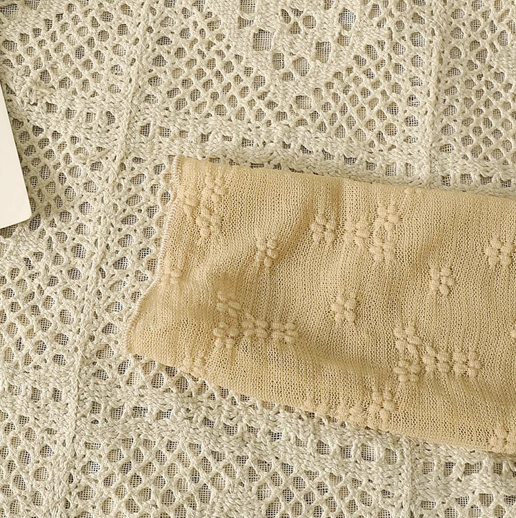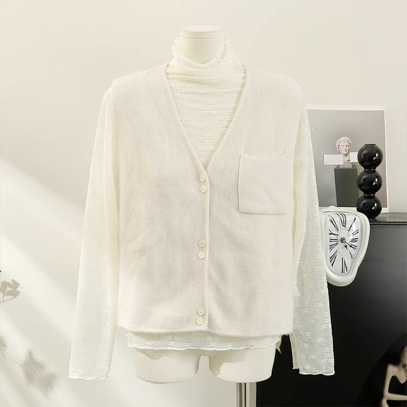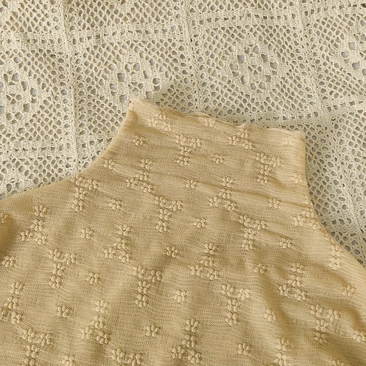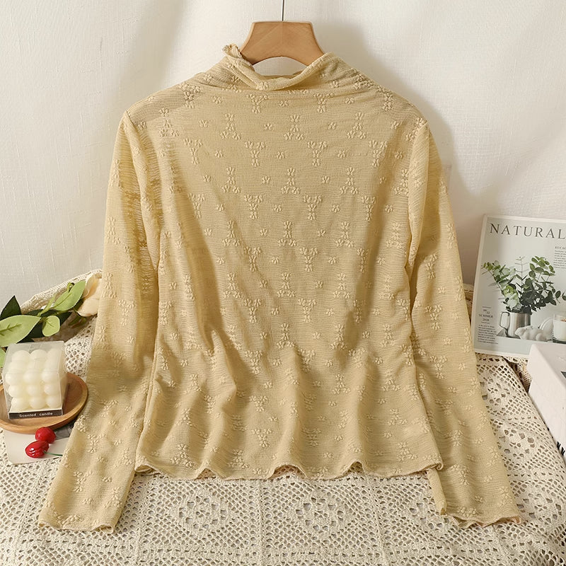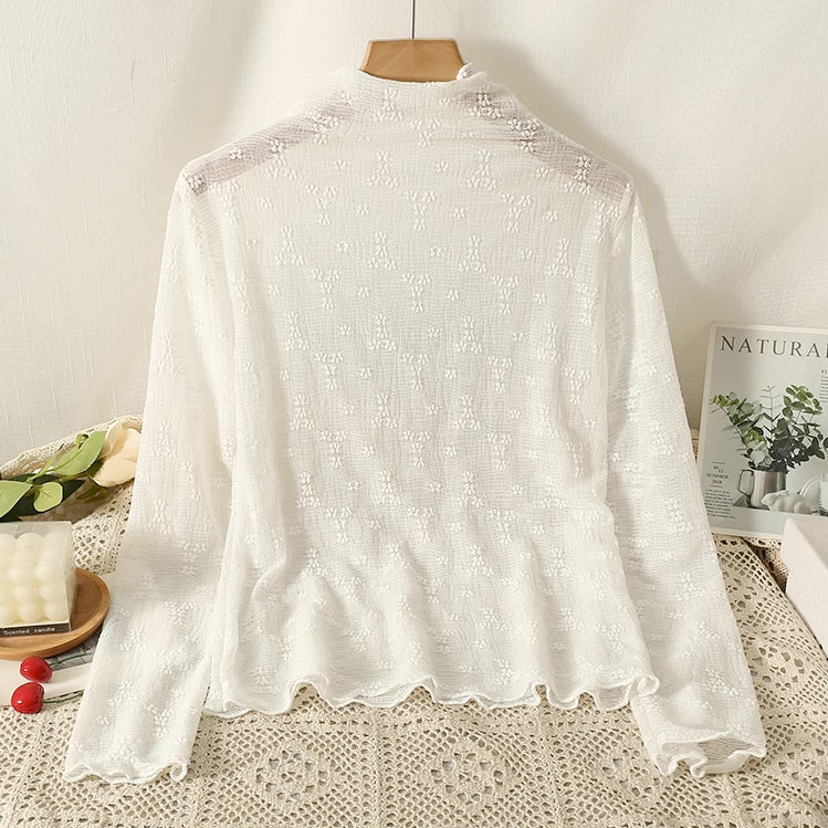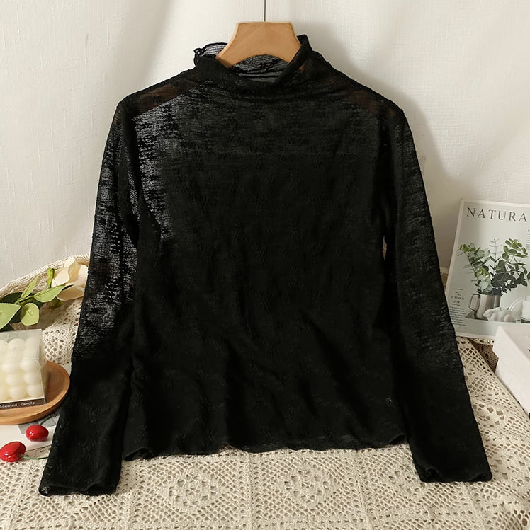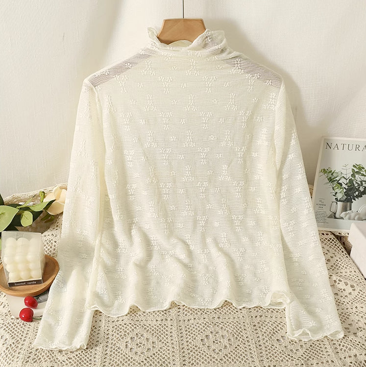 Long sleeved sheer knit shirt with a high mock neckline and embossed little flowers.