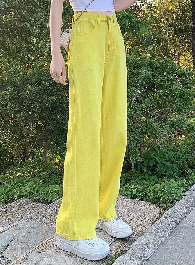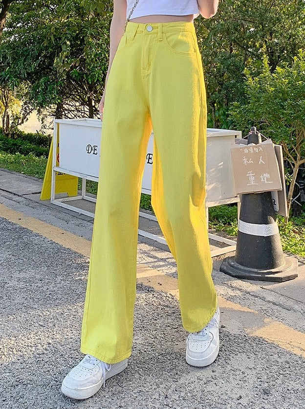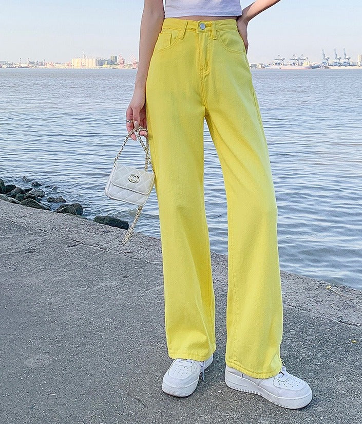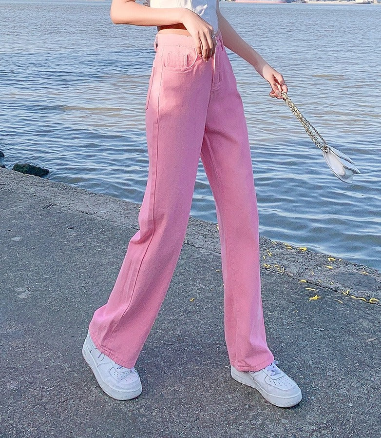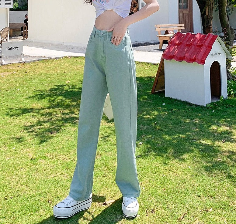 Classic high waist and straight leg jeans in yummy ice cream colors. Features a button and zip up front, belt loops, side pockets and back pockets.