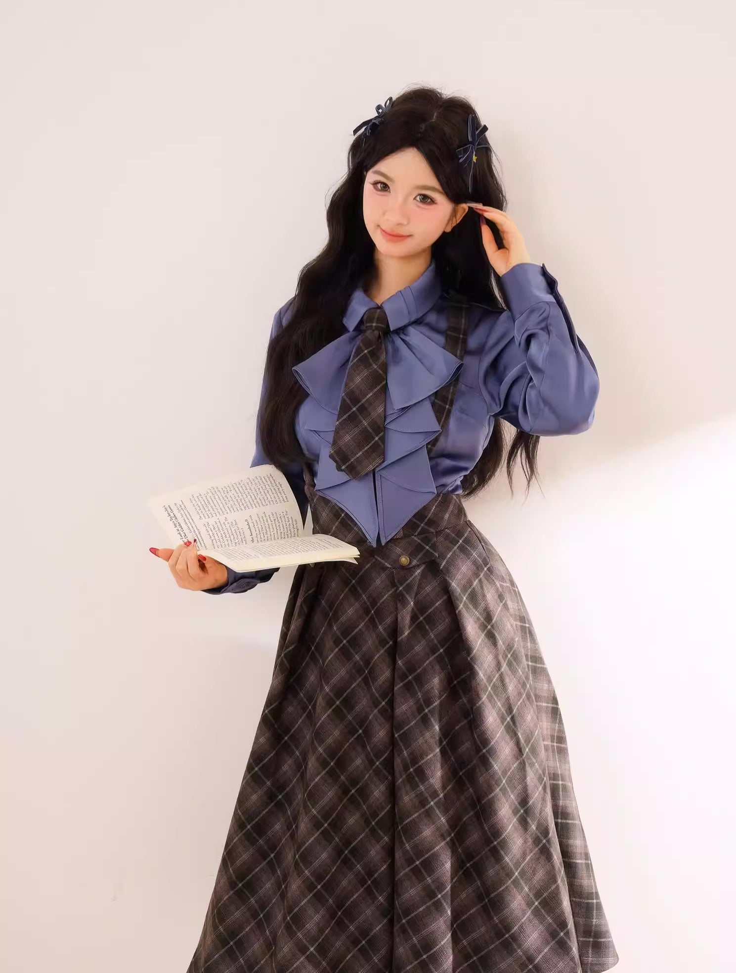 Newsgirl Plaid Suspender Skirt & Blouse Set (2 Colors)