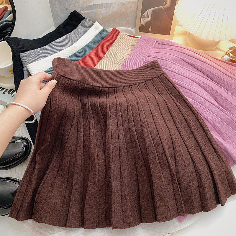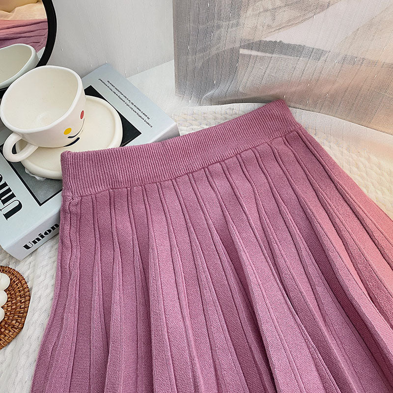 Knitted mini skirt with permanent pleats and elastic waistband.