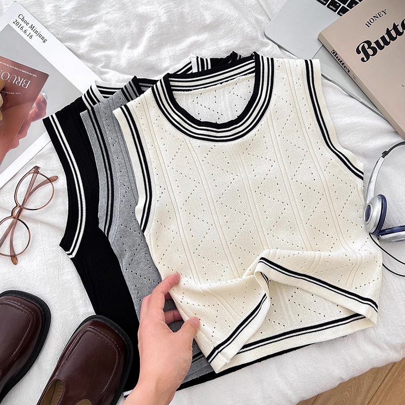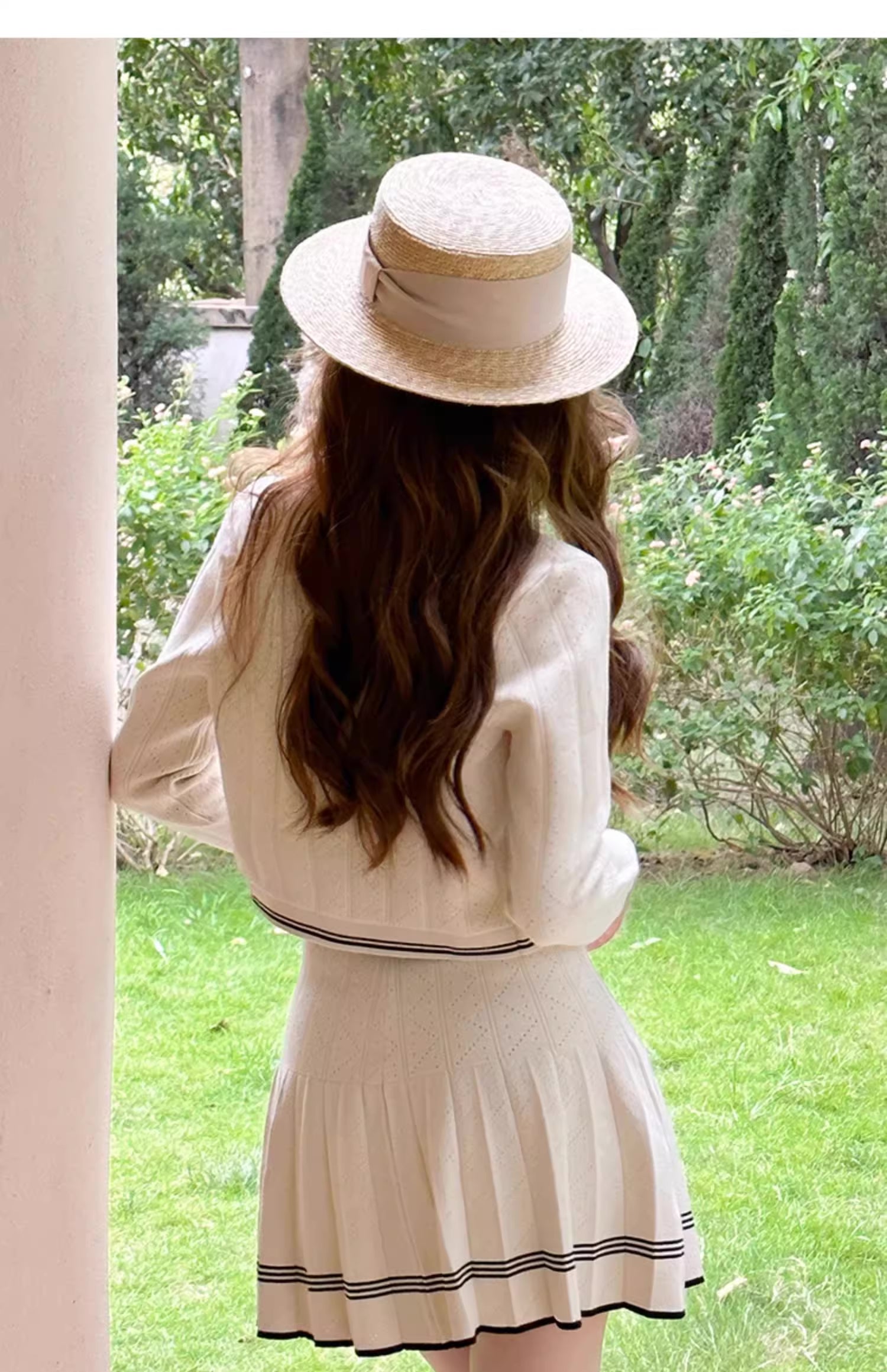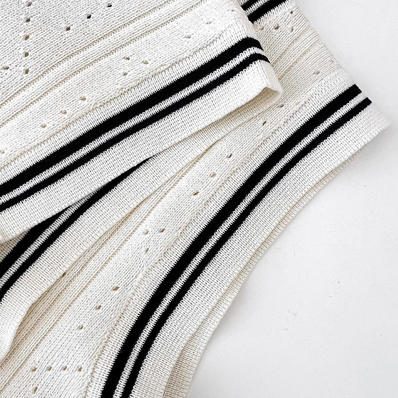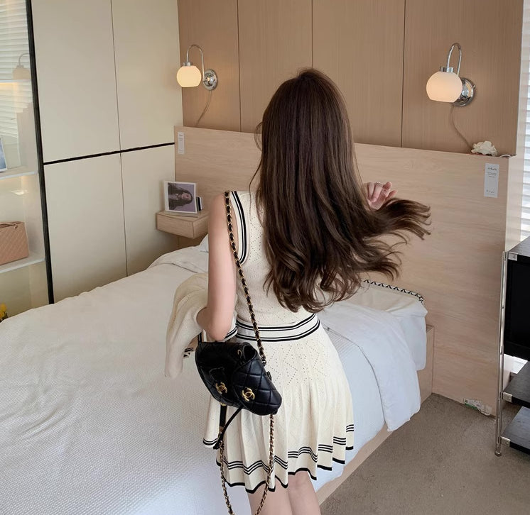 Lightweight open knit set featuring a round neck cardigan, round neck sleeveless top and pleated mini skirt. Finished with striped ends for an old money vibe.