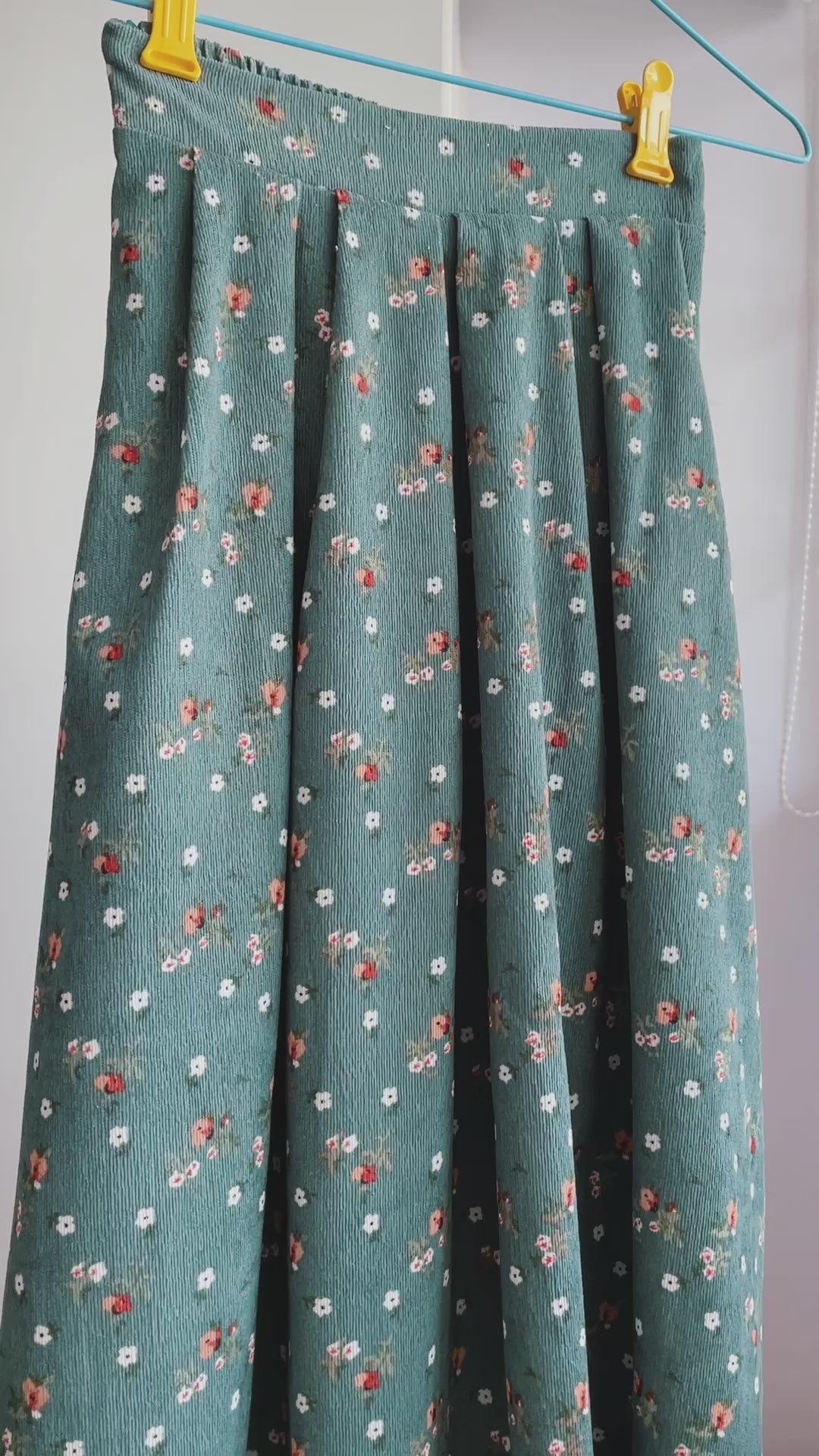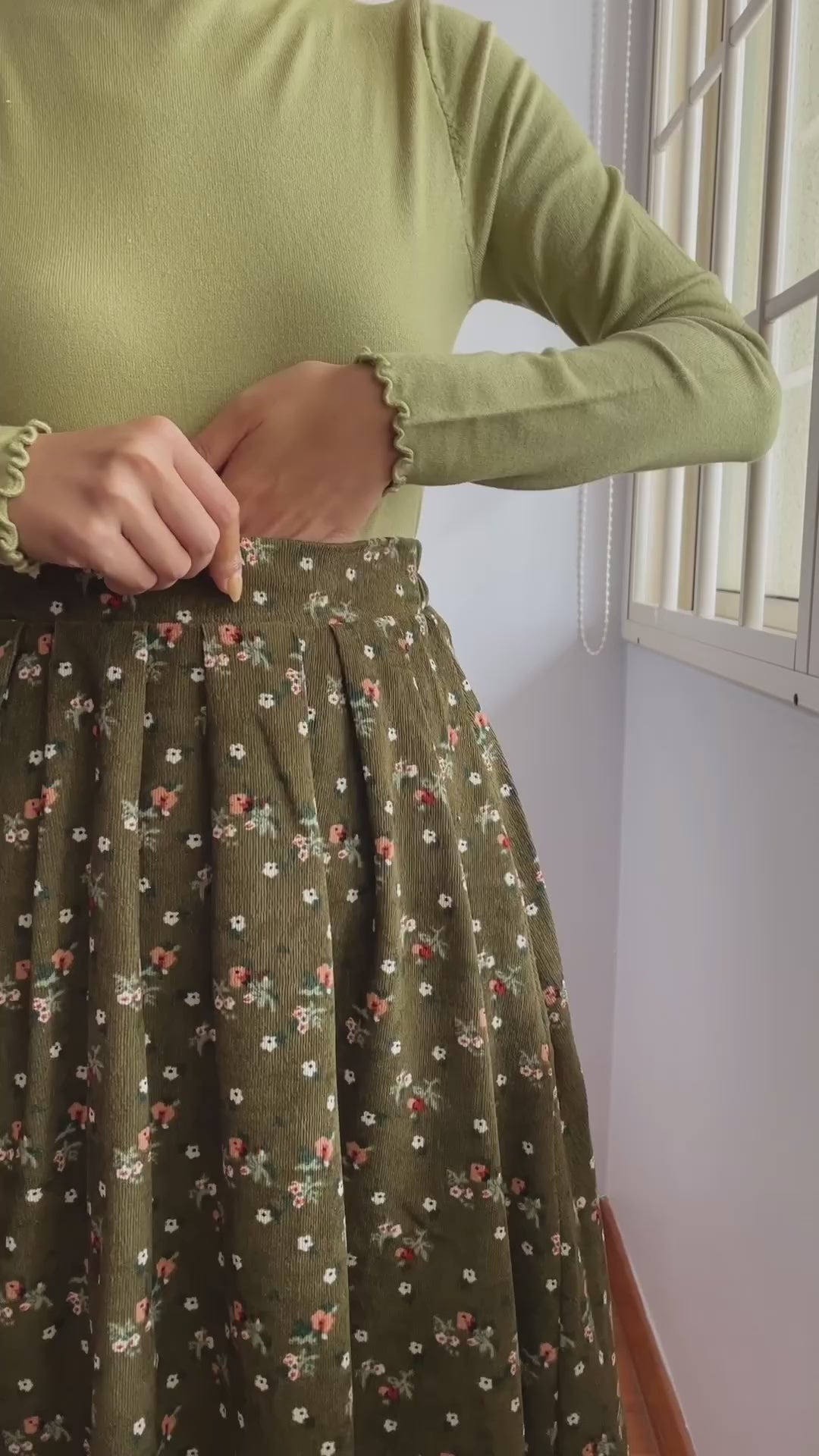 Corduroy midi skirt with a mix of ditsy florals, pleated front, elastic back and concealed side zipper. Lined.