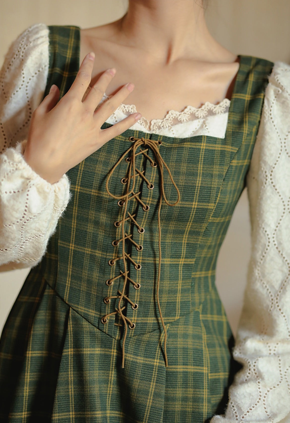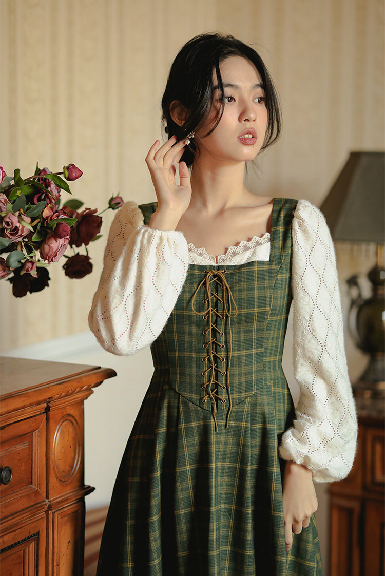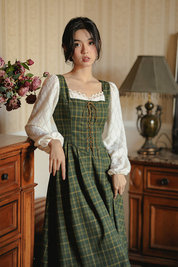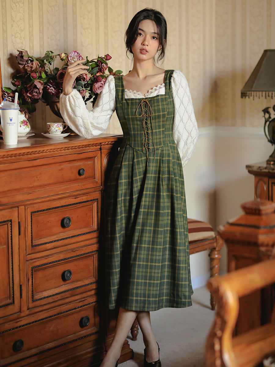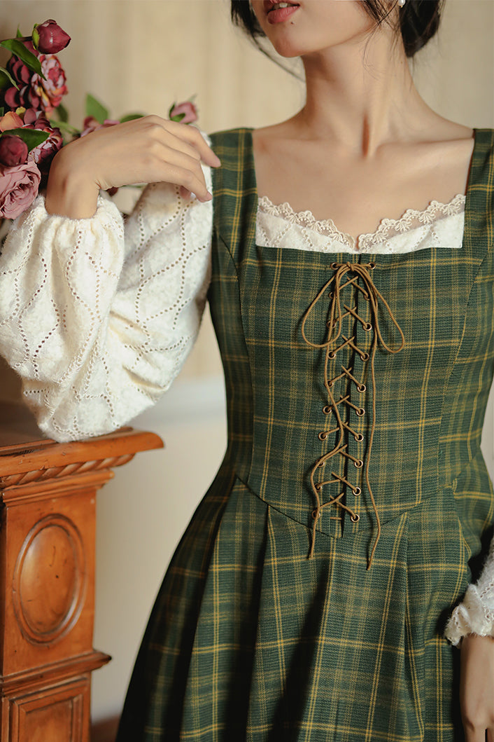 Rustic Plaid Lace Up Corset Midi Dress (Green)