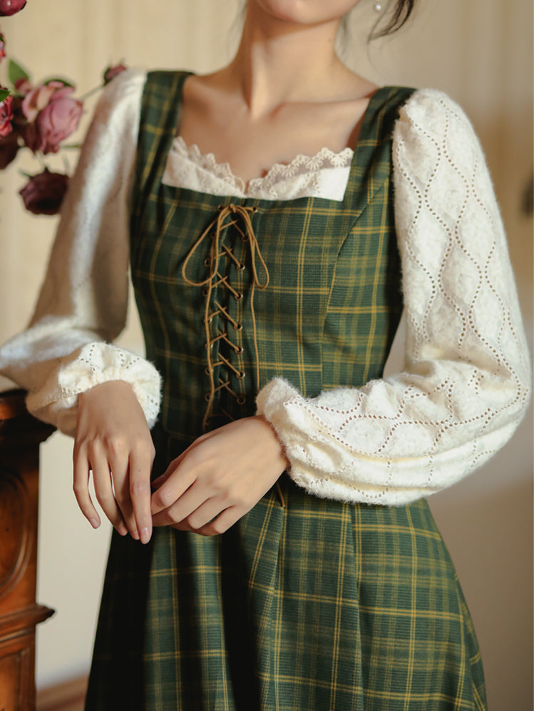 Twofer midi dress with lace sleeves and knitted plaid dress with a lace up corset bodice. Concealed back zipper. Lined.