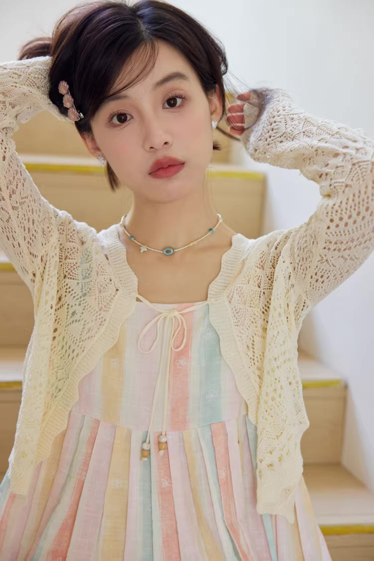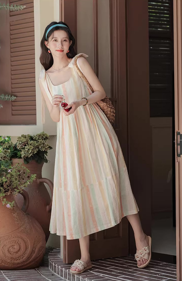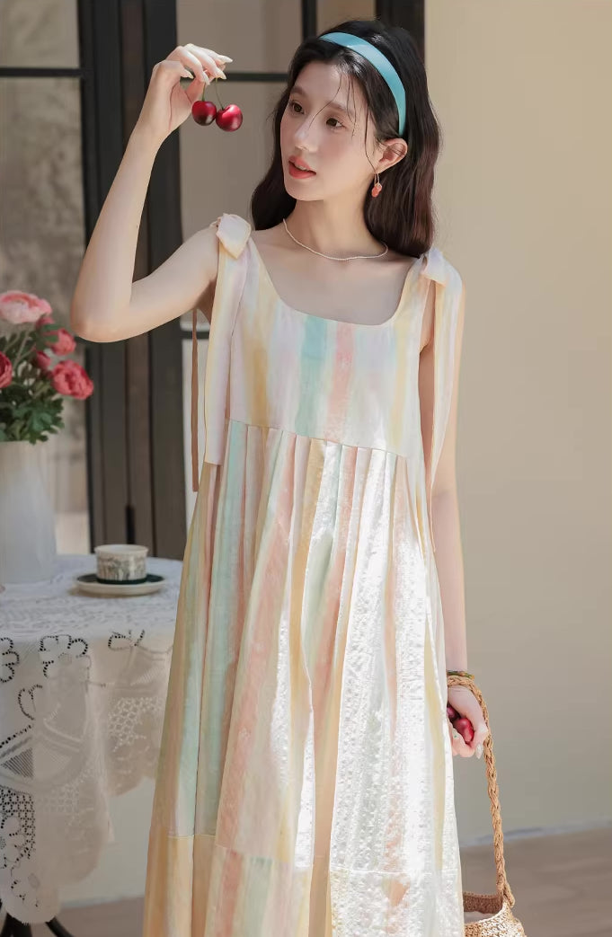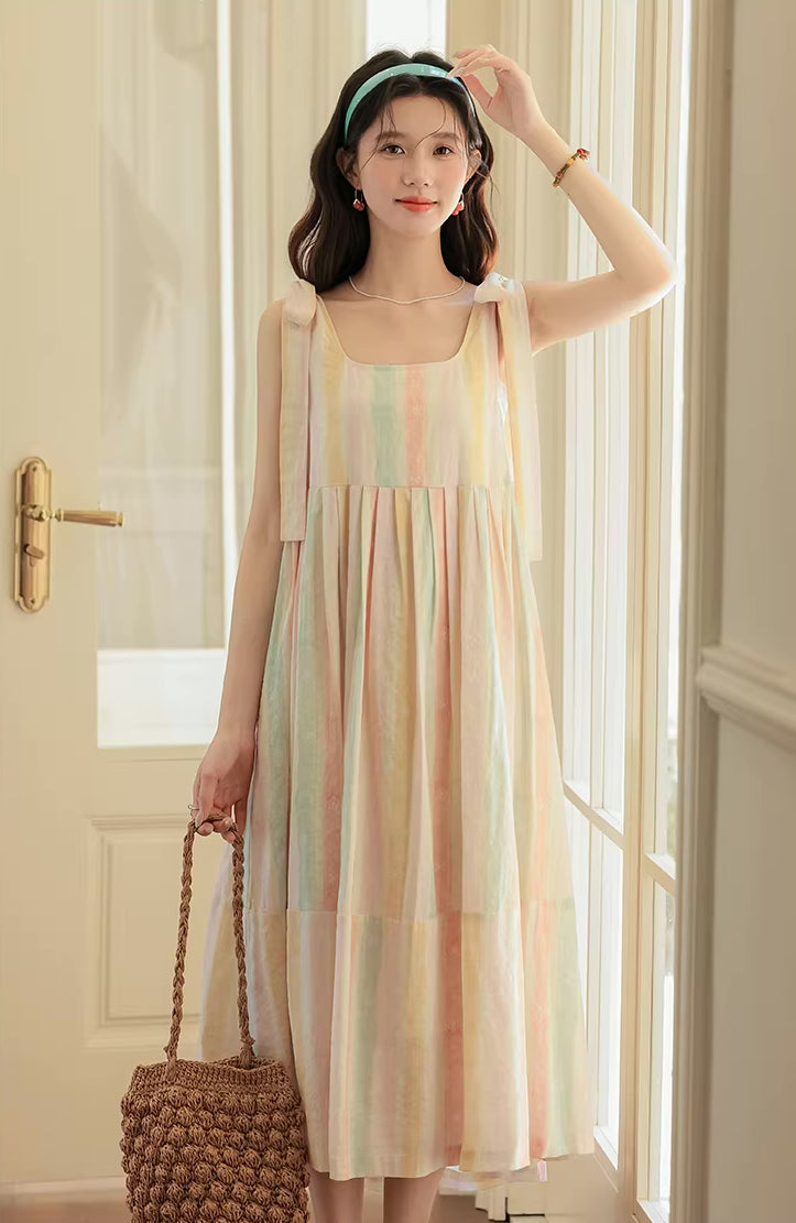 • Sleeveless midi length dress with pastel rainbow stripes